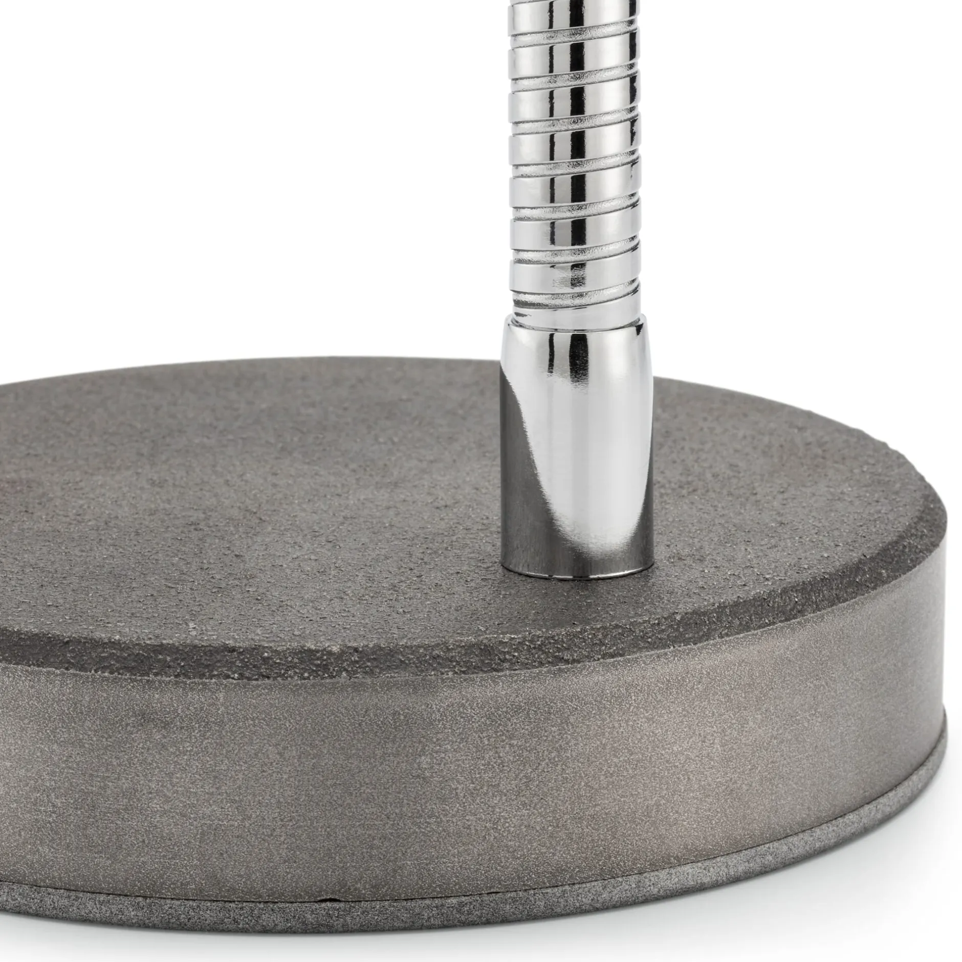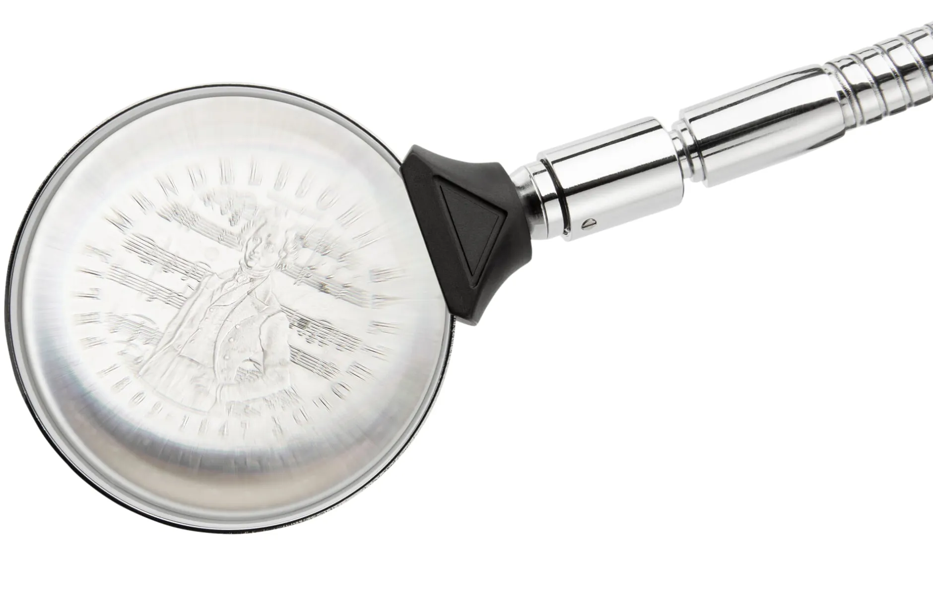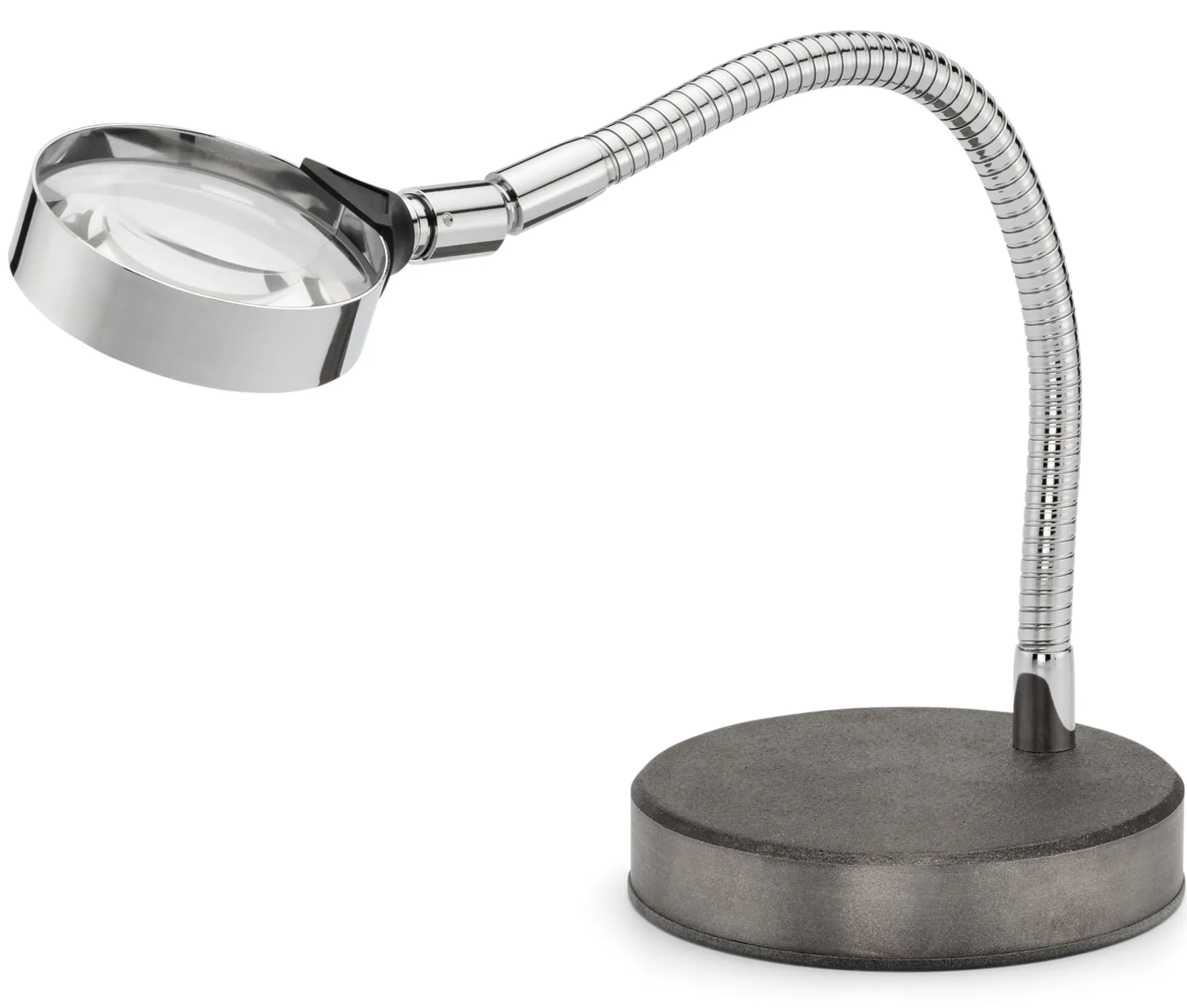 Standlupe (10 Dioptrien/2,5-fache Vergrößerung) mit flexiblem Schwanenhals aus verchromtem Metall, 360 ° drehbar und abnehmbar. Sockel Gusseisen überzogen. Lupe Ø 7,5 cm, Sockel Ø 13 cm. Gesamthöhe 45,5 cm, Flexarm Länge 31 cm. Gewicht 1,7 kg.