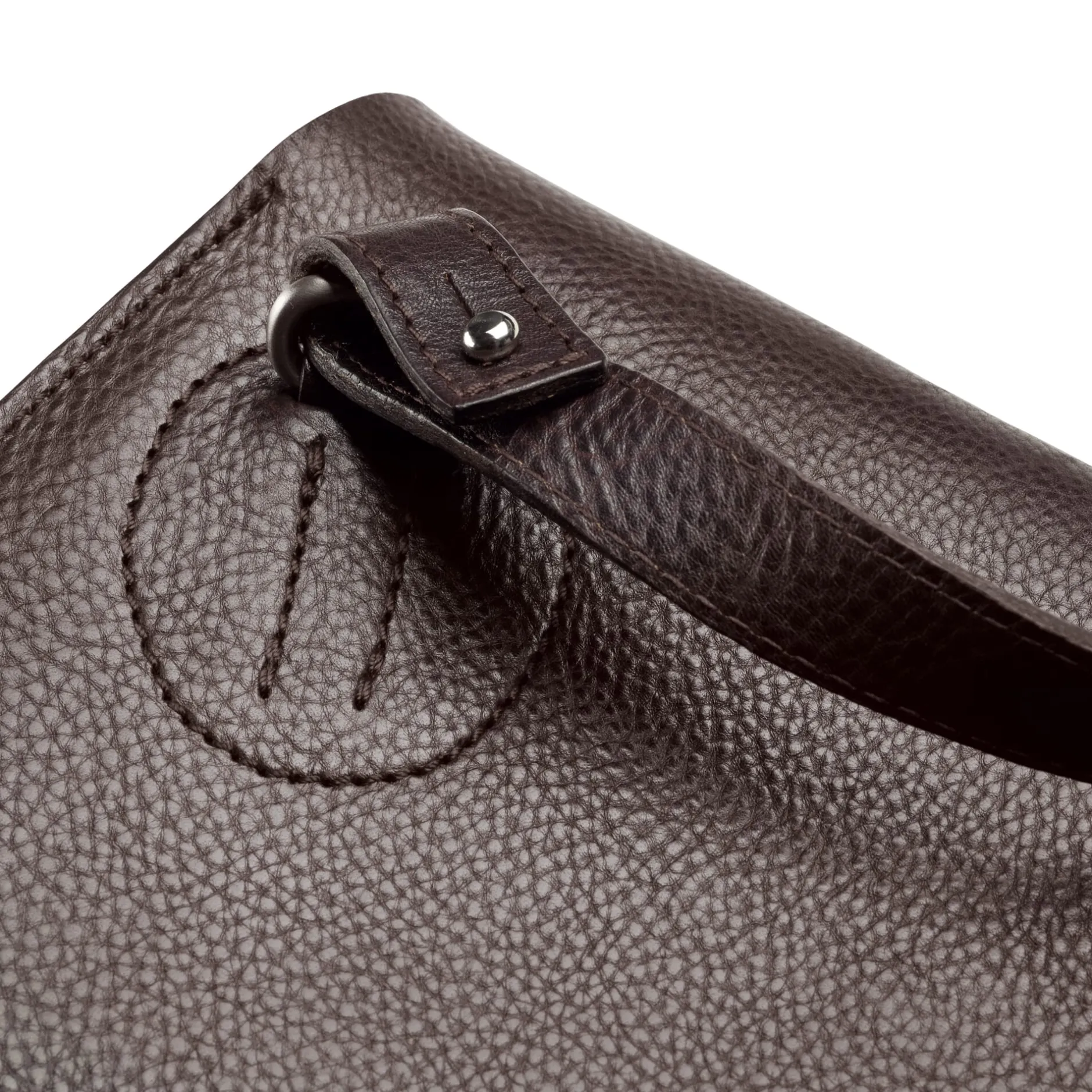 Diese Tasche ähnelt formal unserer Umhängetasche aus Rindleder, was nicht verwundert, haben doch beide ihre Wurzeln im Postwesen. Das große Hauptfach nimmt Aktenordner bis 8 cm Rückenbreite oder – in der separaten Filztasche – Klapprechner bis 15“-Monitor auf, ein weiteres Fach hält einzelne Unterlagen im A4-Format vor. Zusätzlich gibt es ein Steckfach für ein Mobiltelefon, zwei Stiftschlaufen und ein kleines Fach mit Reißverschluss. Gearbeitet ist die Tasche aus einem grubengegerbten Rindleder, das vergleichsweise weich ist und eine ausgeprägte Hautstruktur besitzt. Trotz ihrer Größe sind Vorder- und Rückseite aus einem einzigen Stück Leder gefertigt, was die Haltbarkeit erhöht, da im Bodenbereich keine Nähte auftreten. Der Tragegriff besteht aus vierlagig verarbeitetem Vollrindleder, eine unter der Griffbefestigung über die gesamte Taschenbreite eingezogene Stahlschiene gibt der Tasche Stabilität. Der verstellbare Schultergurt ist mit zwei verstärkten Ovalringen auf der Rückseite befestigt, die Tasche liegt dadurch gerade und dicht am Körper an. Bei Bedarf kann der Gurt einfach abgeknöpft werden.