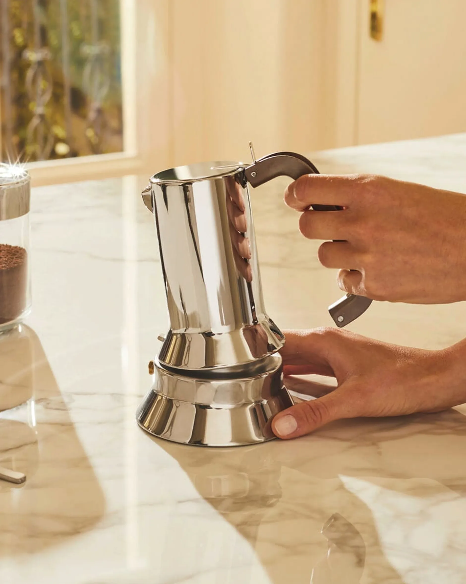 Eine Ikone unter den Espressomaschinen: die 9090 von Richard Sapper für Alessi aus dem Jahr 1979. Damals bereits funktionell revolutionär und mit nicht weniger als 5 eigenen Patenten ausgestattet, hat sie bis heute nichts von ihrer Überzeugungskraft verloren. Für uns ein Meisterwerk, wenn es um die Verbindung von innovativer Funktion und feiner Formsprache geht. Denn einzigartig ist bis heute ihre Konstruktion: Die kompakte Maschine besteht – wie andere klassische Espressokocher auch – aus zwei Teilen, die für den Brühvorgang miteinander verbunden und auf dem Herd in Gang gebracht werden.