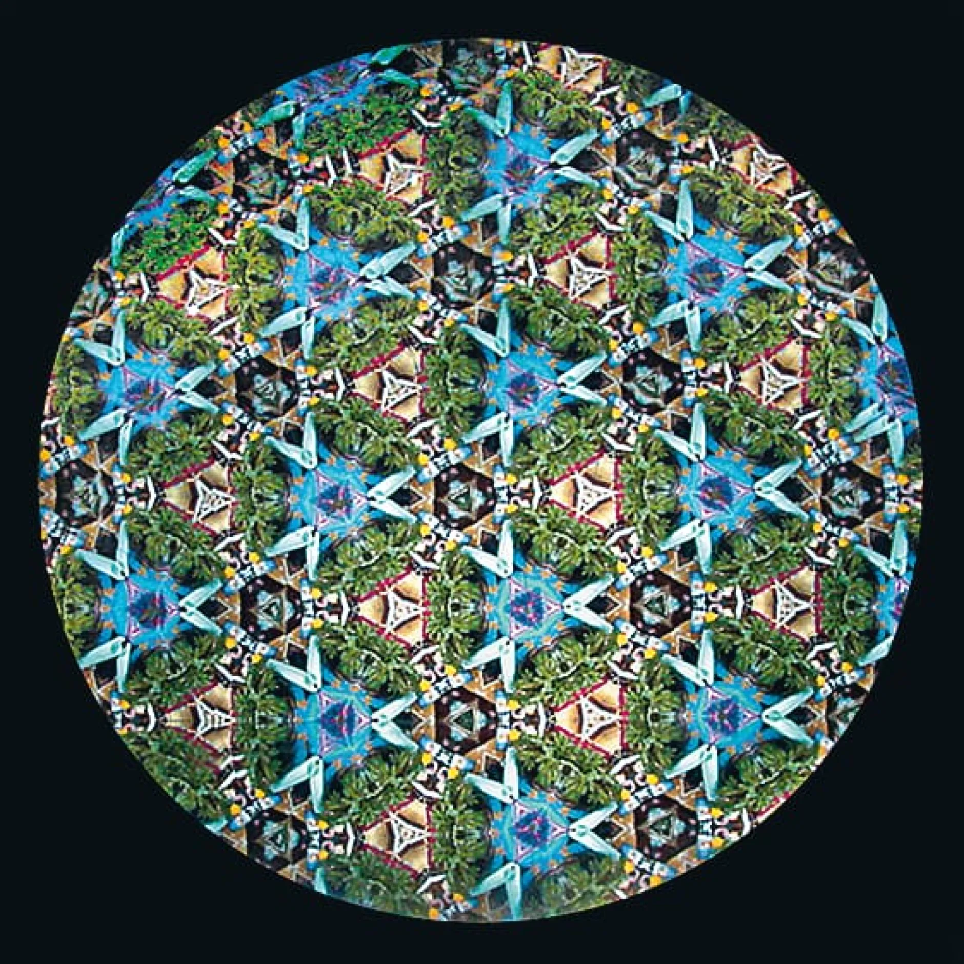 Eine Weitwinkellinse aus Glas gewährleistet maximale Lichtausbeute und sorgt für ein gleichmäßig helles Bild bis zum Rand des Sichtfeldes (sie erzeugt sogar den Eindruck, man könne über den Rand hinausblicken). Anstelle des üblichen, in einem verglasten Aufsatz befindlichen Geschnipsels spiegelt dieses Kaleidoskop – ungleich interessanter – die Umgebung ein. Selbst Horte der Trübsal wie Tiefgaragen, Mülldeponien und Bahnhofsklos erstrahlen in sakraler Schönheit.