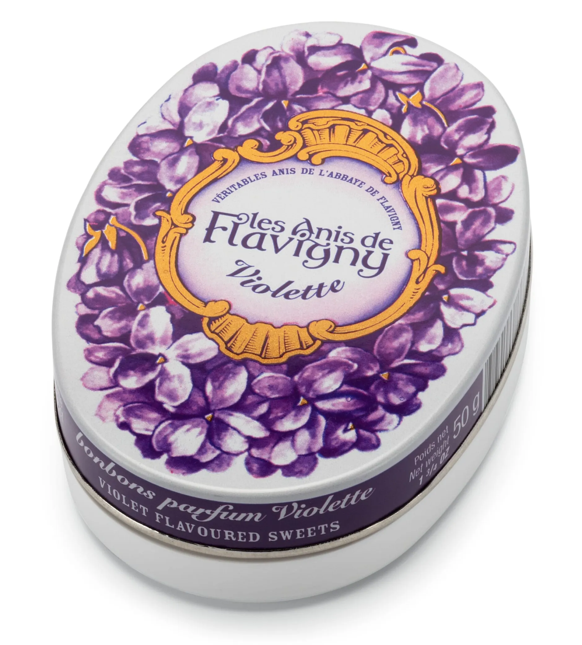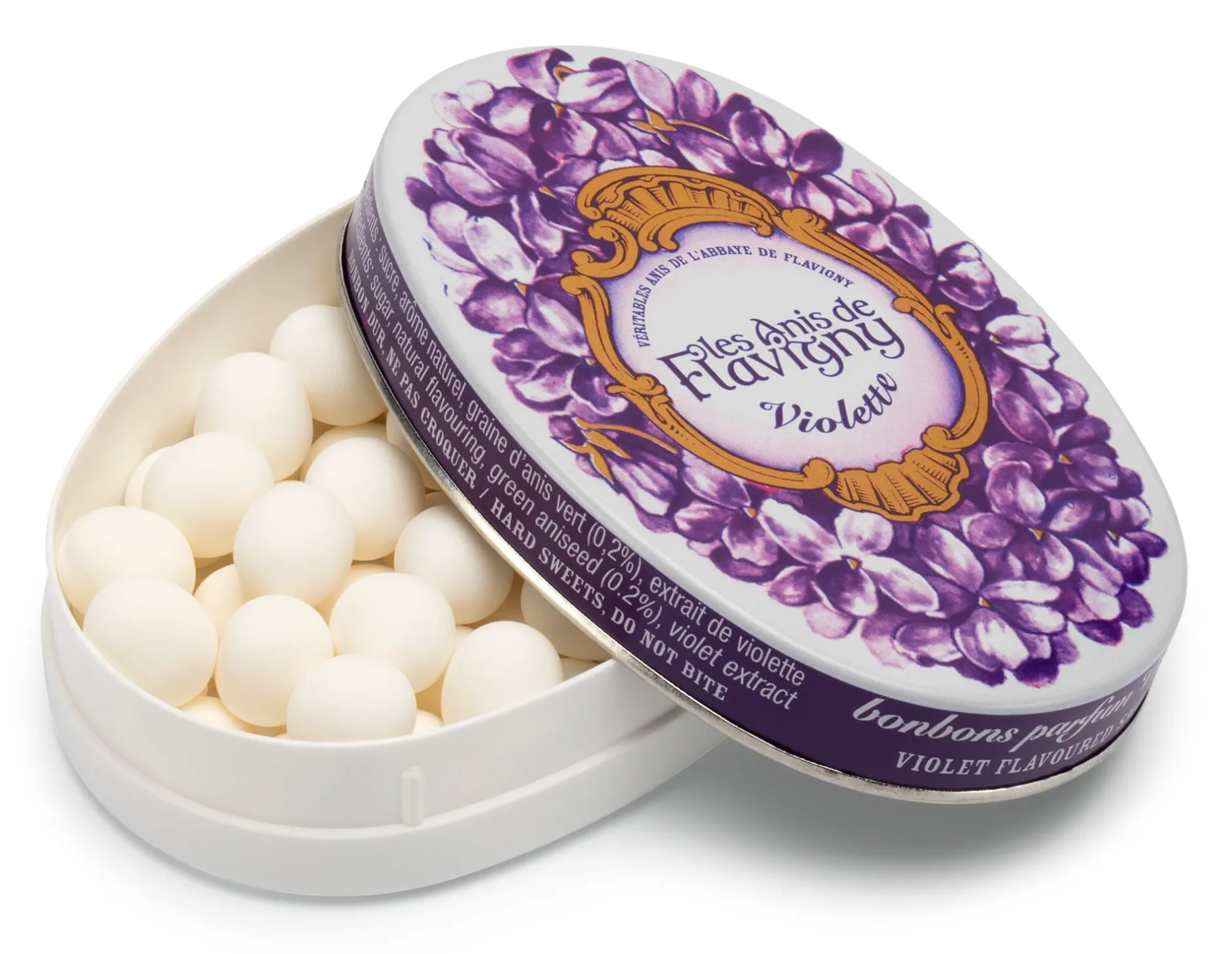 Neben der Ausführung mit dem reinen Anisgeschmack gibt es die Flavigny-Pastillen auch noch fein aromatisiert. HIer kommen sie in einer ganz klassischen Ausführung, die den Wohlgeschmack der aus der gehobenen Dessertküche und Patisserie bekannten kandierten Veilchen aufgreift. Der Anissamen im Kern ist natürlich auch hier enthalten.