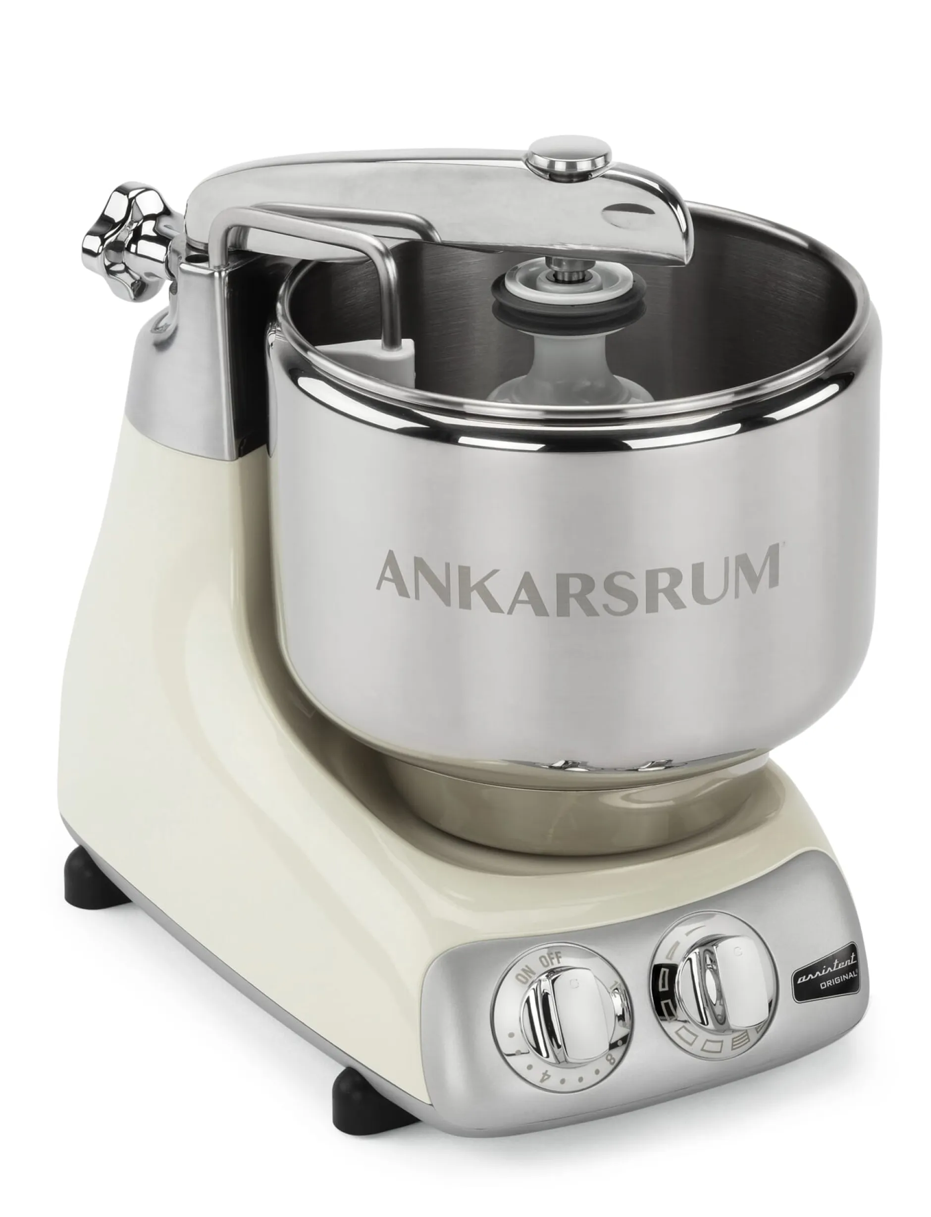 Den Schweden wird im Allgemeinen nachgesagt, ein backverrücktes Volk zu sein. Das scheint nicht aus der Luft gegriffen, ist doch der Flughafen Arlanda in Stockholm nicht der einzige Ort in der Hauptstadt, an dem ein „Sauerteig-Hotel“ die fachgerechte Aufbewahrung des familieneigenen Sauerteigvorrats in der Urlaubszeit übernimmt. So erklärt sich wohl auch, dass in Schweden seit 80 Jahren eine wirklich gute Knet- und Küchenmaschine produziert wird. Die Ankarsrum kam 1940 auf den Markt. In ihren Anfangsjahren wurde sie noch unter dem Namen „Electrolux Ankarsrum Assistent“ hergestellt und verkauft. Wiewohl ihre Motorleistung sich mit den Jahren vervielfacht hat – von ursprünglich 400 auf heute 1.500 Watt –, hat sich an ihrem Grundaufbau wenig geändert. Langsames und intensives Kneten, und das auch über längere Zeit, ist nach wie vor die Spezialität dieser Maschine. Die großen Profi-Geräte aus dem Bäckereibedarf arbeiten nach einem ganz ähnlichen Prinzip. Der entscheidende Unterschied zur üblichen Haushaltsmaschine: Der Knethaken bleibt fest. Nur die solide, stolze sieben Liter fassende Edelstahlschüssel wird in Rotation versetzt und dreht sich bei laufendem Motor ausdauernd um die eigene Achse. Die Teigmasse macht diese Bewegung mit, wird währenddessen gleichmäßig durchgearbeitet, umgewälzt und in sich gefaltet – sie wird besser „gegriffen“, wie der Bäcker sagt, und dabei intensiv ausgeknetet. Ein Abstreifer hilft dabei, den Teig stetig vom Rand der Schüssel weg in die Mitte zu transportieren. Auf diese Weise wird der Vorgang des Handknetens, bei dem der Teig in der Knetschüssel oder an der Tischplatte gerieben wird, perfekt nachgeahmt und eine gleichmäßige Teigbildung gefördert.