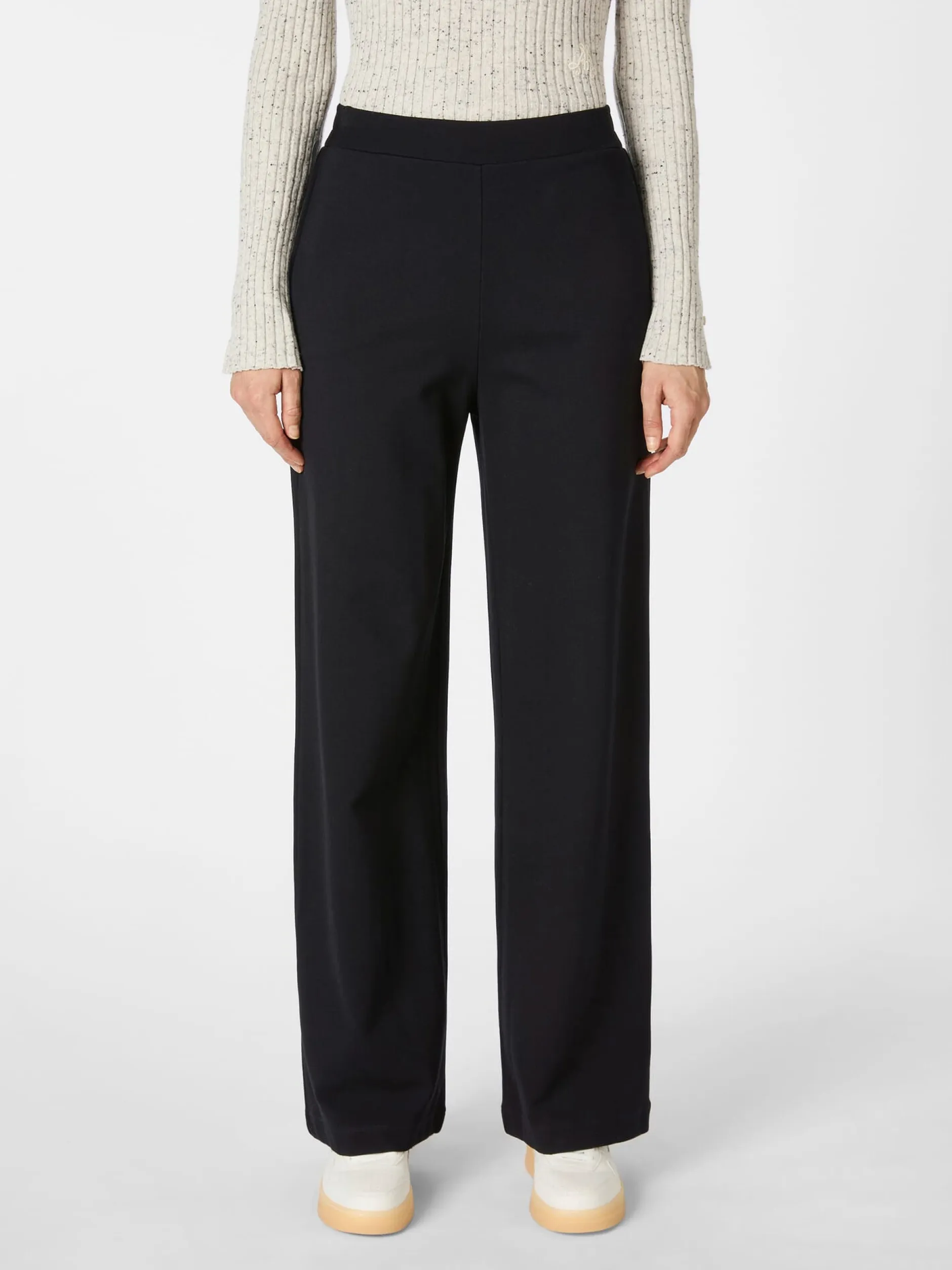 Komfort steht bei dieser Hose klar im Vordergrund, das betrifft den Schnitt wie auch die verwendeten Materialien. Der Jersey besteht zum Gutteil aus LENZING™ ECOVERO™-Viskose – einer Regeneratfaser, die aus Holz und Zellstoff aus zertifizierten und kontrollierten Quellen gewonnen wird und sich durch eine hohe Festigkeit und eine sehr glatte, seidig-weiche Oberfläche auszeichnet. Hinzu kommt ein Anteil an recyceltem Polyamid und Elastan für mehr Elastizität und Formtreue. Geschnitten ist die verschlusslose Hose mit weitem, geradem Bein und breitem Gummibund, der vorn glatt und hinten gerafft ist. Zwei Seitentaschen bieten Platz für Kleinteile des täglichen Bedarfs. Die Jerseyhose lässt sich gut mit sportlichen und lässigen Freizeitoutfits kombinieren, macht aber auch im Homeoffice eine gute Figur.