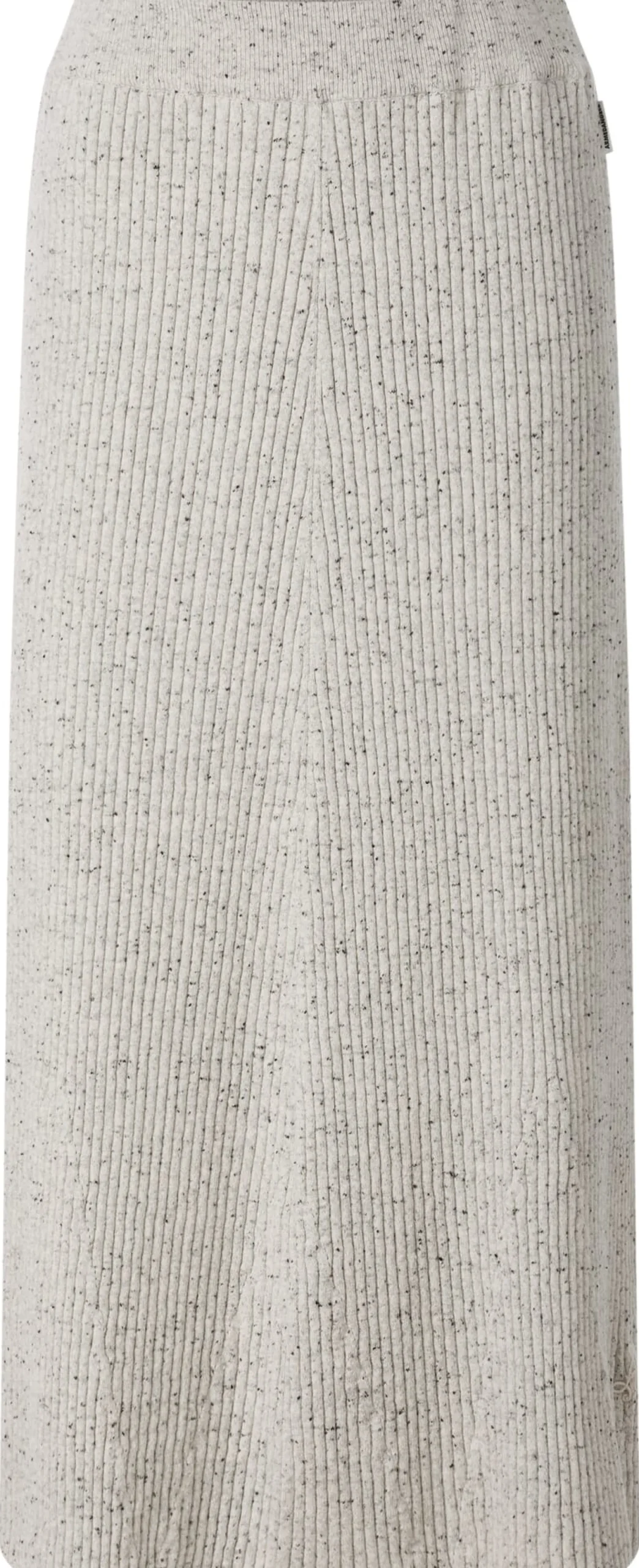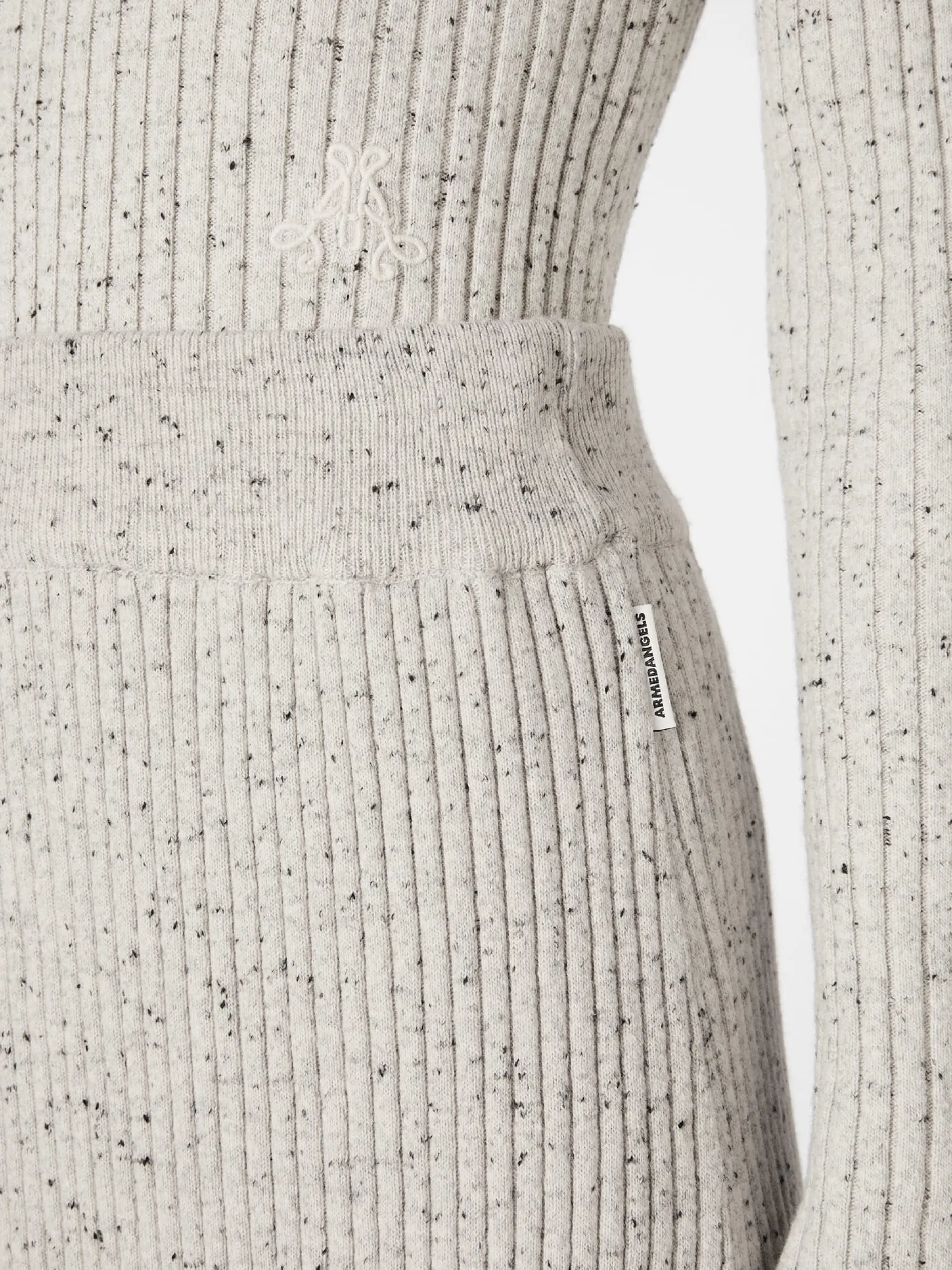 Kontrolliert biologisch angebaute Baumwolle und Lammwolle vereinen sich bei diesem Maxirock zu einem wunderbar weichen, wärmenden und temperaturausgleichenden Gestrick. Zudem ist der Rock dank des Rippenstricks luftdurchlässig, dehnbar und formstabil. Und durch die Kombination aus hellen und dunklen Garnen und den schwarzen Einsprengseln zeigt er eine lebendige Melangeoptik. Das weich fließende Gestrick und der Schnitt, der oben körpernah und nach unten hin etwas ausgestellt ist, verleihen ihm eine leichte Glockenform. Der elastische, in feinem Rippenstrick gefertigte Bund schmiegt sich sanft an die Taille und sorgt für einen guten Sitz. Ein eingesticktes Armedangels-Logo in verschlungener Formgebung rundet das Design ab. Sportlich-leger kombiniert mit Shirt und Sneakern oder elegant mit Bluse, Blazer und Loafern – der Rock macht stets eine gute Figur.