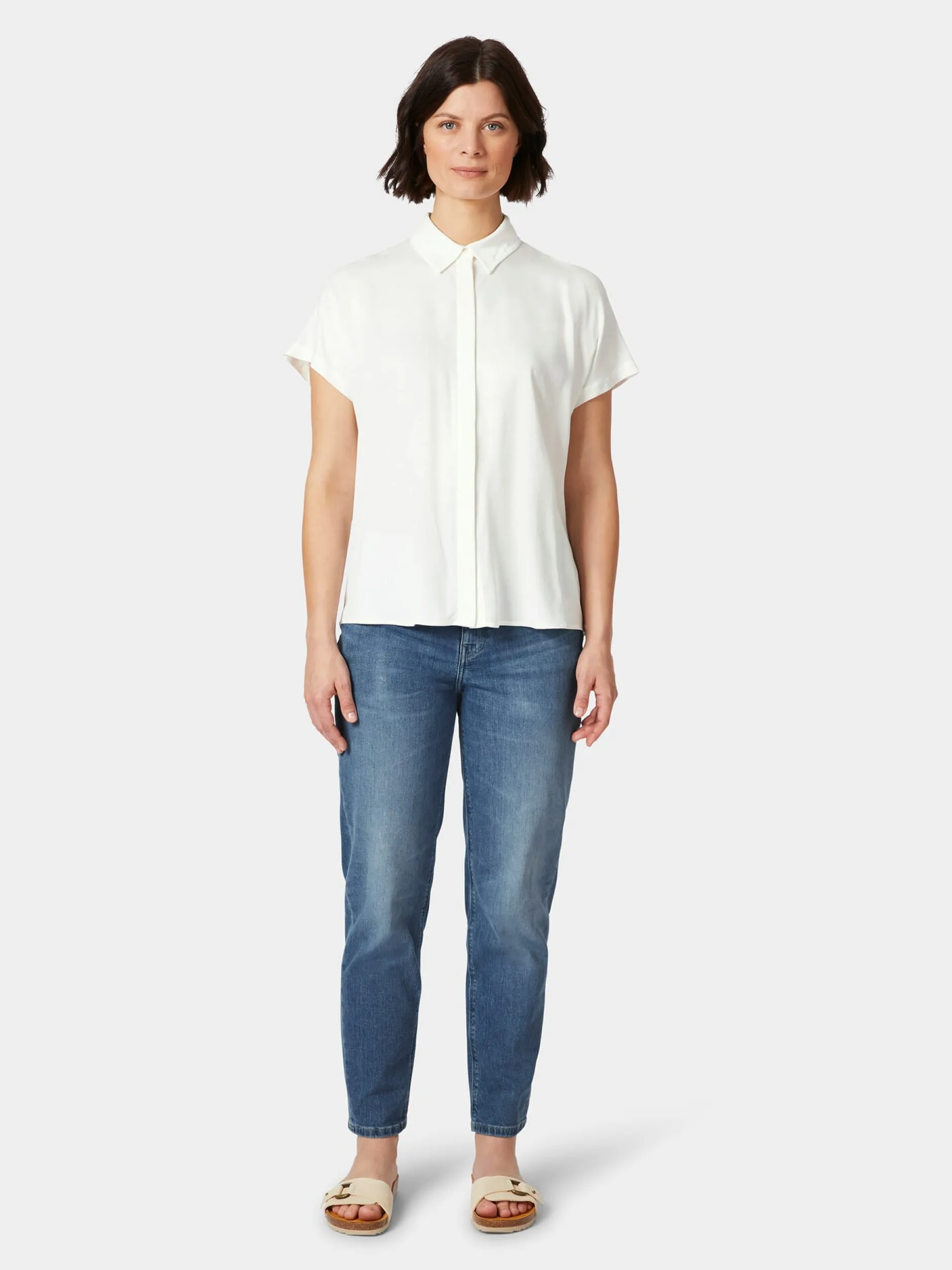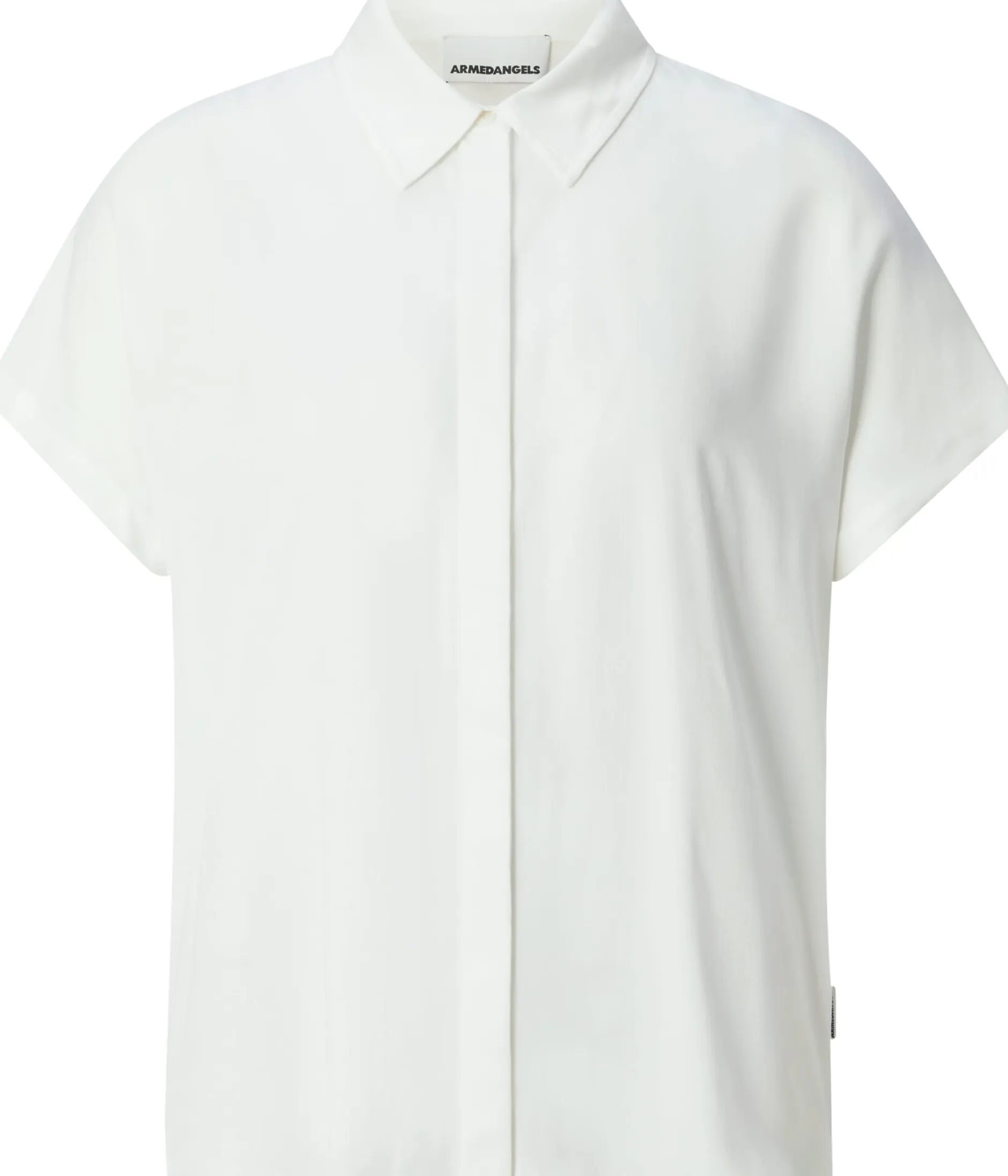 Diese Bluse ist dank des verwendeten Materials perfekt auf die warme Jahreszeit abgestimmt. Armedangels fertigt sie aus reiner LENZING™ ECOVERO™-Viskose, einer Regeneratfaser, die aus Holz und Zellstoff aus zertifizierten Quellen gewonnen wird. Das hautsympathische Gewebe hat eine schmiegsame Haptik und einen fließenden Fall, so wird die Figur weich umspielt. Zudem ist der Stoff besonders atmungsaktiv, da Viskose viel Feuchtigkeit aufnehmen und schnell wieder nach außen abgibt. Gearbeitet ist die Bluse mit Hemdkragen, verdeckter Knopfleiste und kurzen Ärmeln.