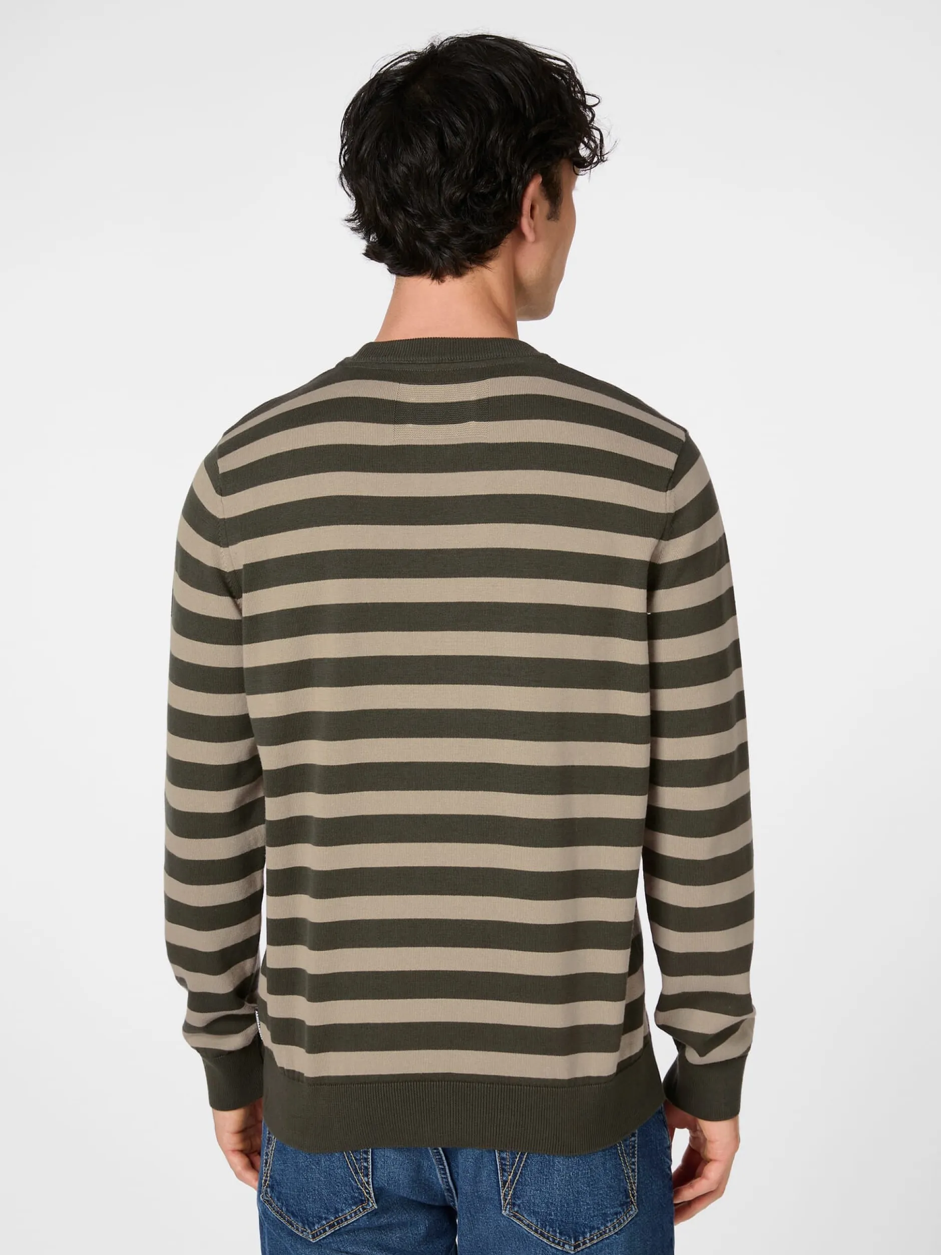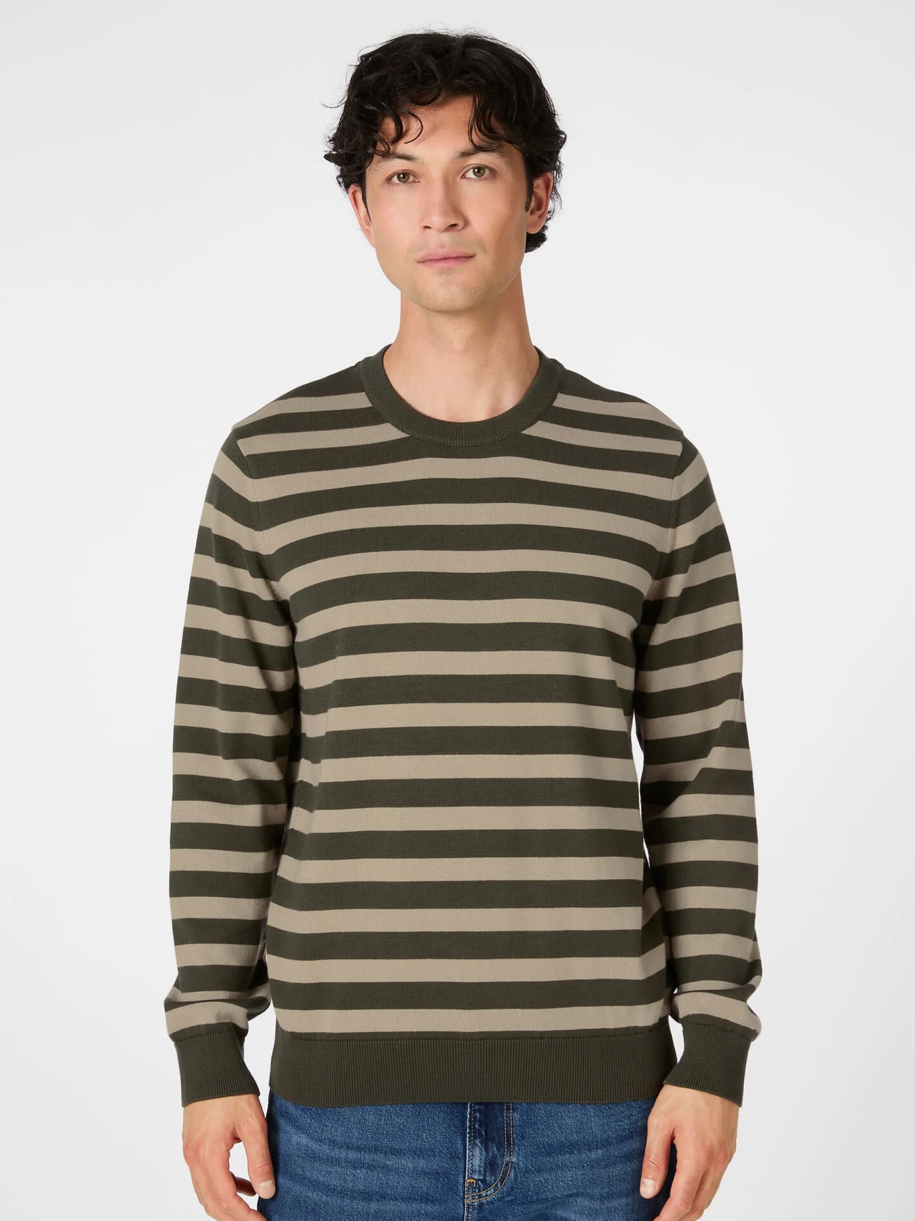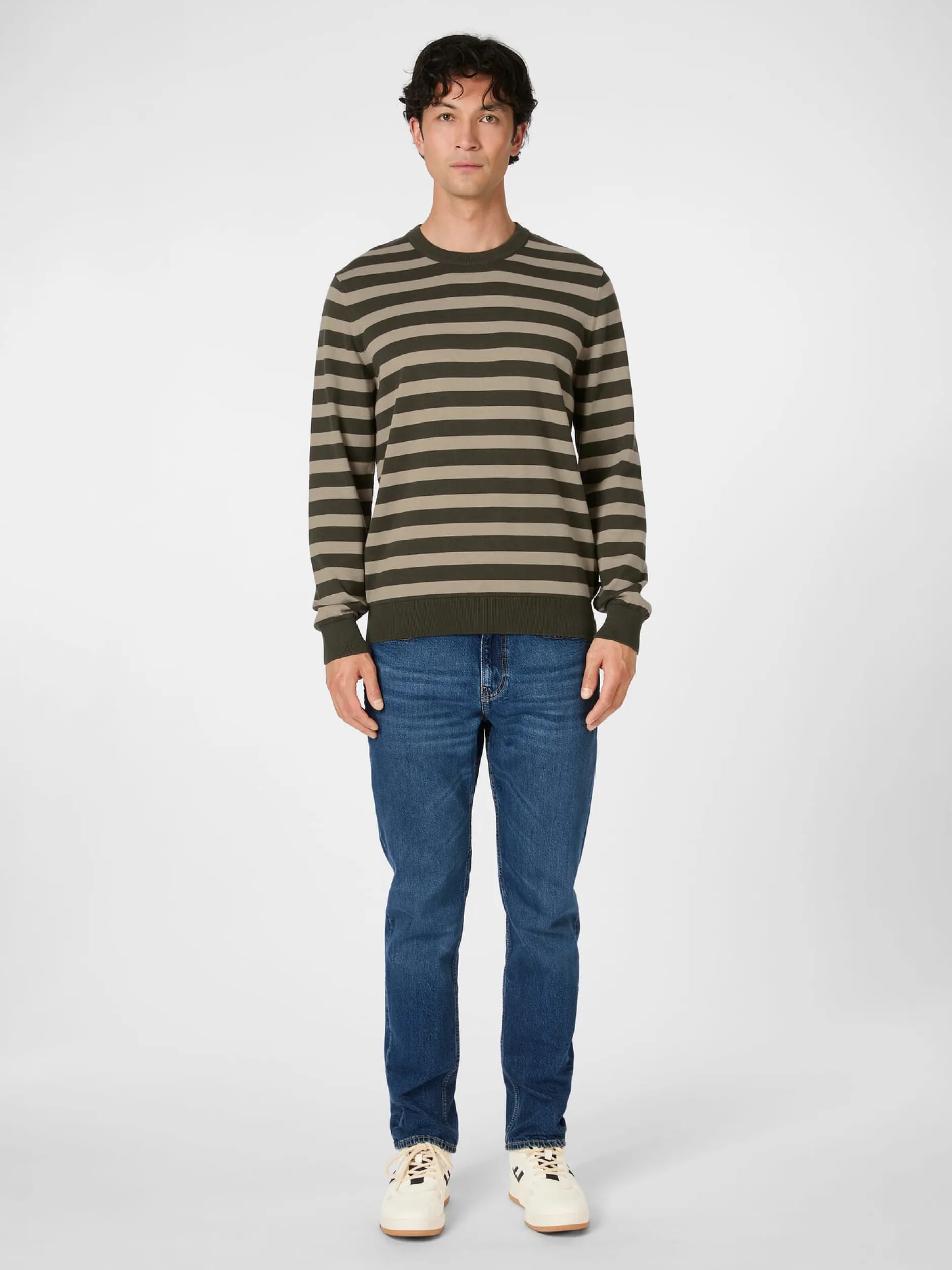 Bequem und lässig ist dieser glattgestrickte Pullover mit dem markanten Ringelmuster, der ein echtes Basisstück der Garderobe darstellt. Feine Rippenstrickbündchen bilden den Abschluss an Hals, Ärmeln und Rumpf. Die verwendete Baumwolle stammt aus kontrolliert biologischem Anbau.