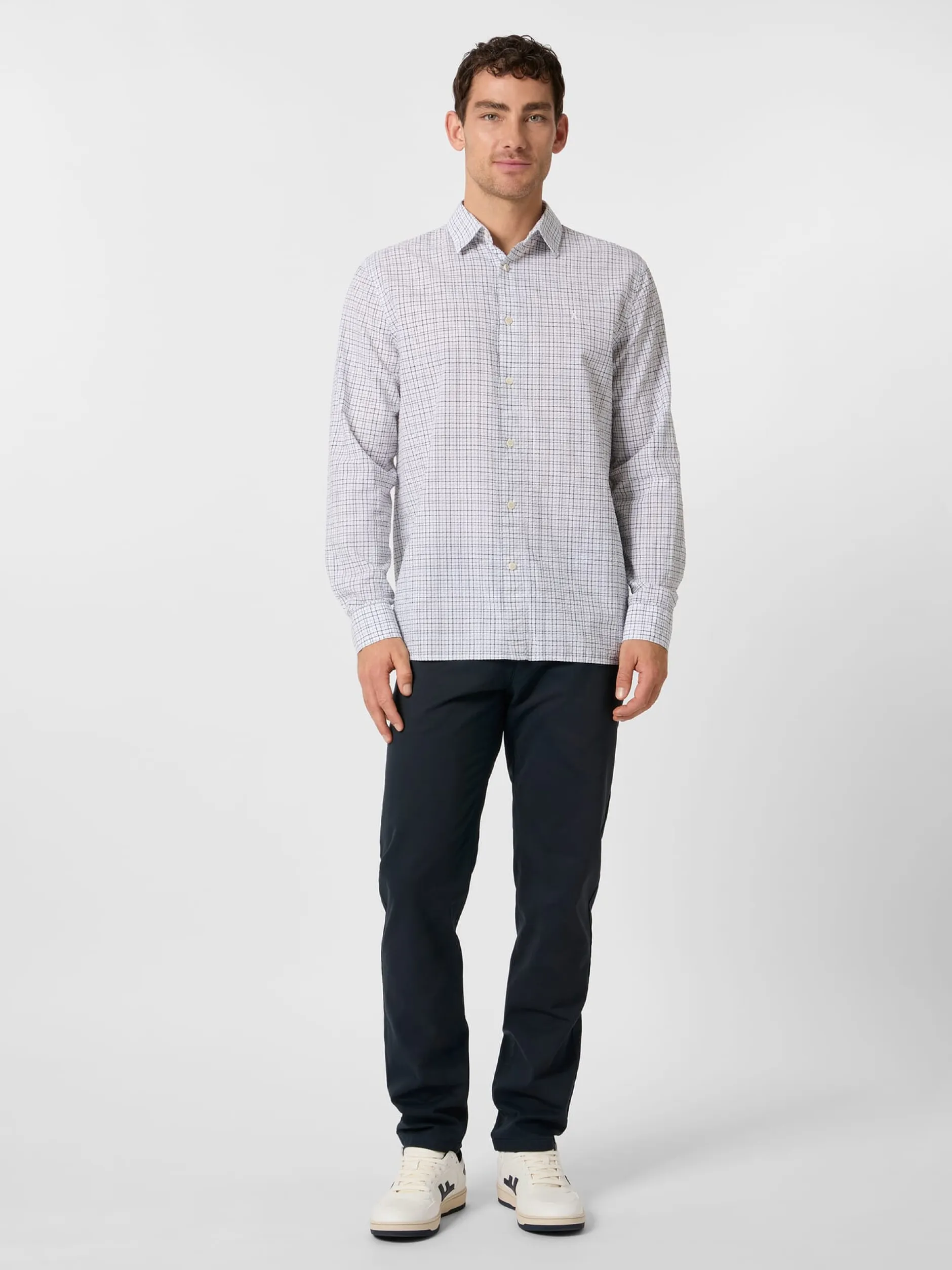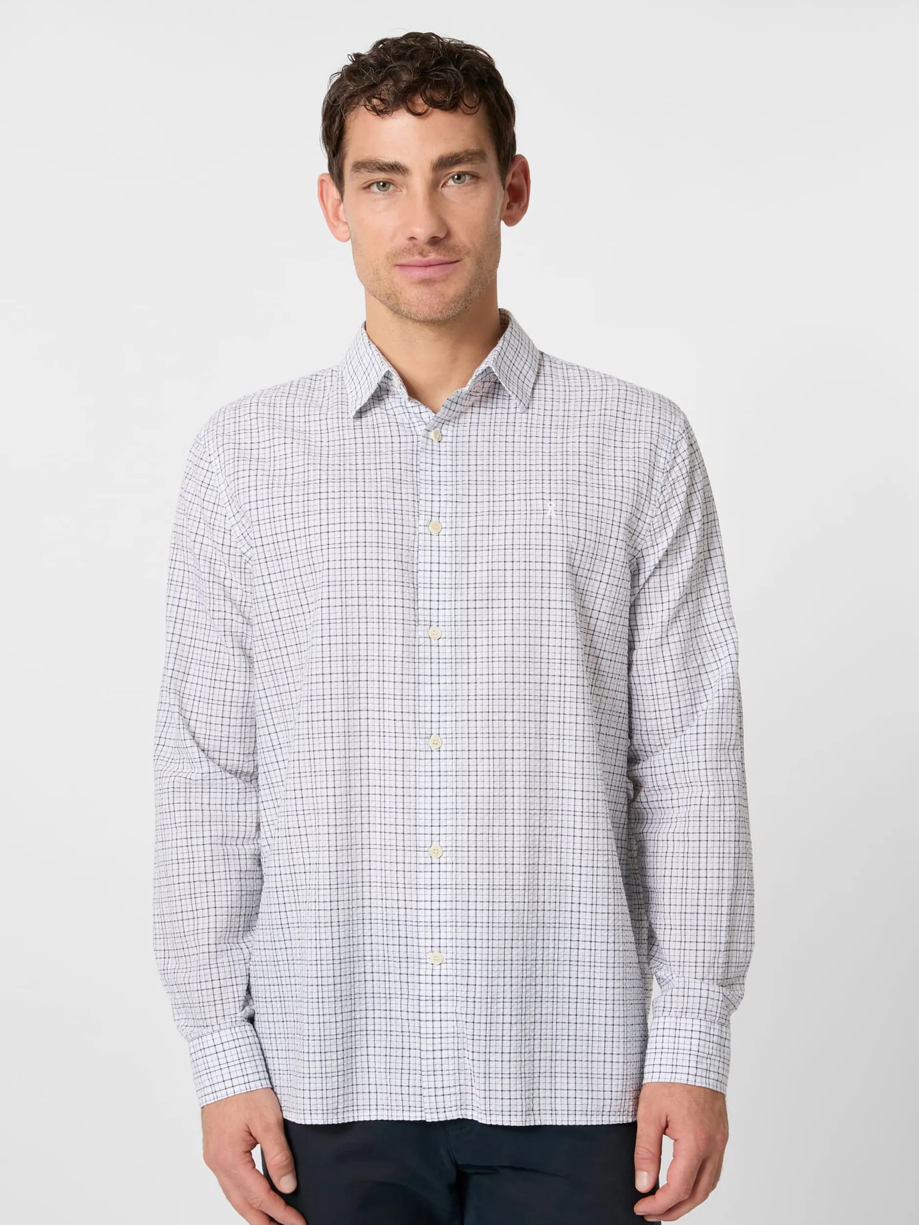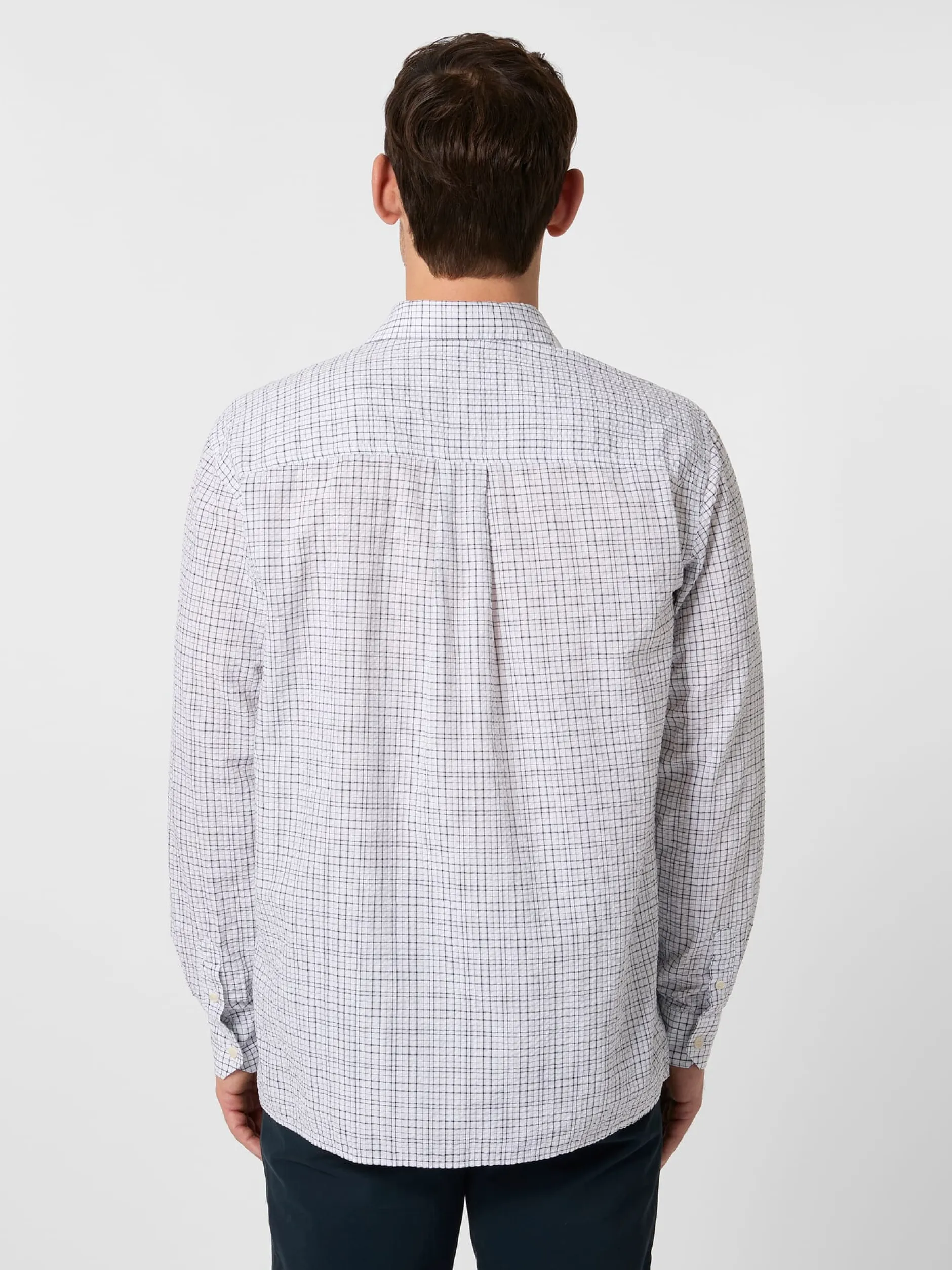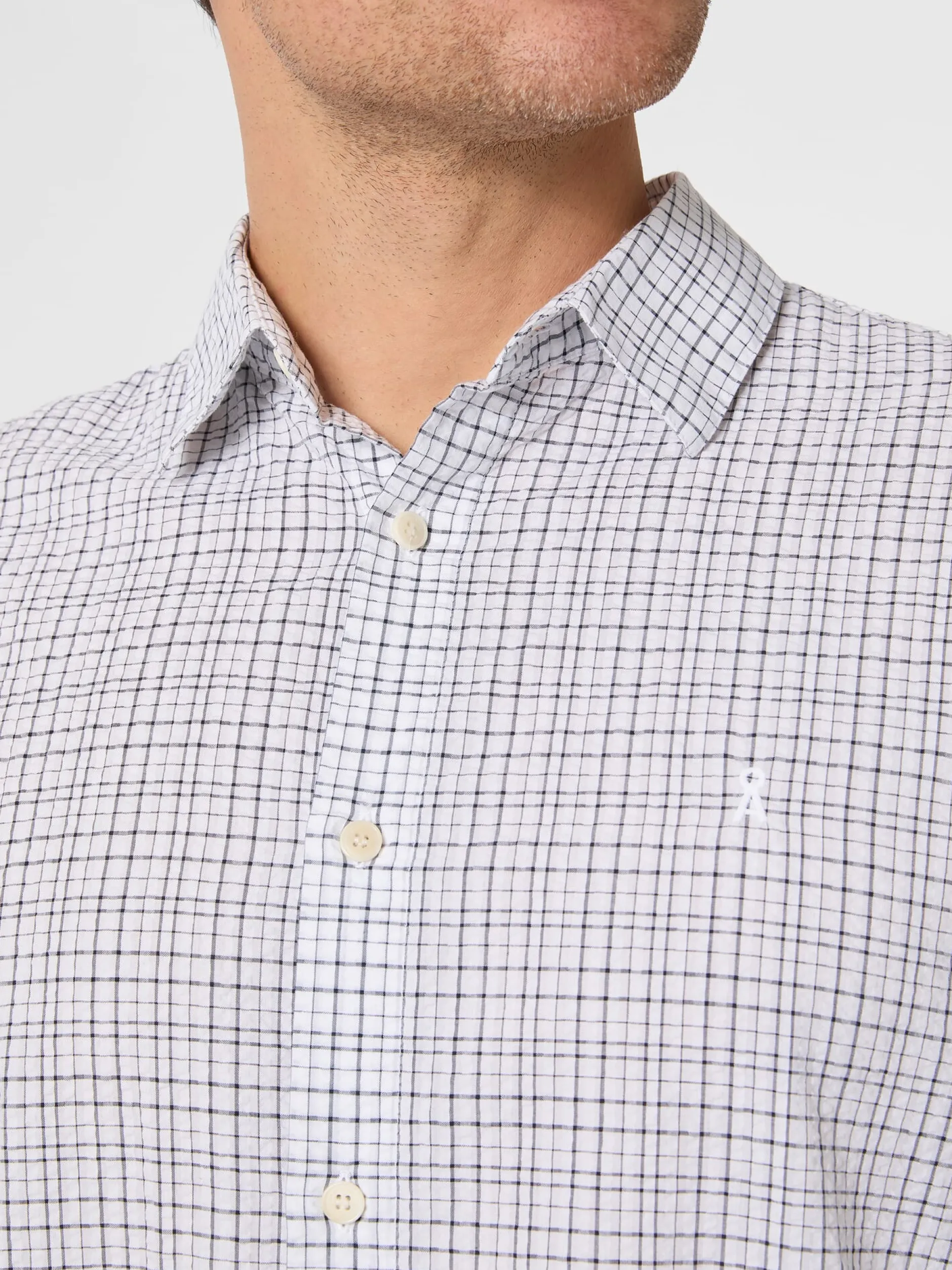 Ein Seersucker zeichnet sich durch eine kreppartige, dreidimensionale Oberfläche aus, die durch die Webart mit unterschiedlich gespannten Kettfäden entsteht. Sie sorgt dafür, dass ein Seersucker nie ganz auf der Haut aufliegt, was für gute Luftzirkulation sorgt und ihn zum idealen Stoff für Sommerbekleidung macht. Der Name ist übrigens aus dem Persischen abgeleitet: „Shir o shekar“ steht dort für „Milch und Zucker“ und spielt auf die wechselnden glatten und gerafften Streifen an. Als der Stoff im 19. Jahrhundert von den Briten in die westliche Welt gebracht wurde, wurde der ursprüngliche Name zur englischen Bezeichnung Seersucker verschliffen. Der Stoff dieses Hemdes zeigt zusätzlich zur charaktervollen Webstruktur ein markantes unregelmäßiges Karomuster. Armedangels fertigt das Hemd mit Kentkragen und passend zum sportlichen Charakter ohne Brusttasche. Gelegte Falten unter der Schulterpasse erhöhen den Tragekomfort. Die verwendete Baumwolle stammt aus kontolliert biologischem Anbau.
