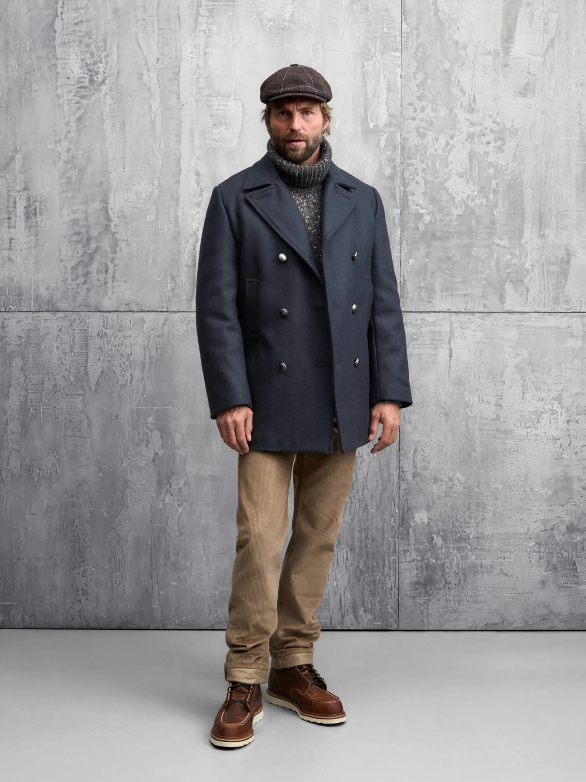 Seit Jahrhunderten ist der Kaban die Arbeitsjacke der bretonischen Fischer. Erst seit dem frühen 19. Jahrhundert wird die ursprünglich weiße Jacke (bretonisch: kap gwenn, weißer Stoff) jedoch blau gefärbt. In dieser Form eroberte der Kaban die Kriegs- und Handelsflotten Europas und wurde so das maritime Kleidungsstück schlechthin. Armor lux in Quimper produziert ihn exklusiv für uns noch in Frankreich und ausschließlich aus Naturmaterialien: als Oberstoff kommt ein mittelgewichtiges, dicht gewebtes Tuch aus reiner Wolle zum Einsatz und für das Innenfutter reine Viskose, die mit einem Baumwollvlies unterlegt und rautenförmig abgesteppt ist. Der gerade geschnittene Kaban ist mit hoch zu schließendem Reverskragen mit knöpfbarem Sturmriegel gearbeitet; er wird mit drei Paaren metallener Uniformknöpfe geschlossen, wie sie für diesen Typ Jacke seit jeher verwendet werden. Zwei seitliche Schubtaschen und zwei Innentaschen mit Metallreißverschluss nehmen Kleinteile des täglichen Bedarfs auf.