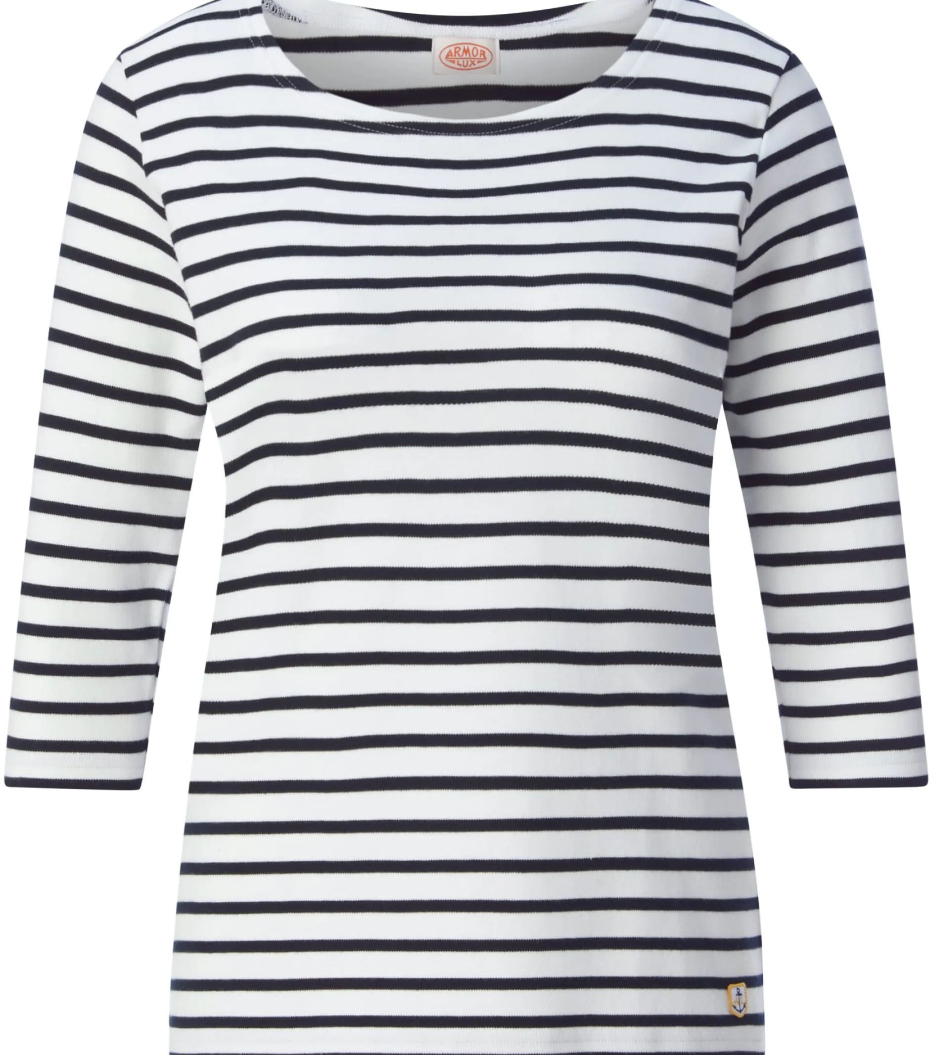 Dieses Shirt ist die leicht antaillierte Version des klassischen Matrosenshirts von Armor lux. Die Ärmel sind dreiviertellang, der Halsausschnitt ist ohne Bündchen gearbeitet. Konfektioniert wird es in Frankreich aus einem mittelgewichtigen Baumwoll-Interlock in kbA-Qualität.