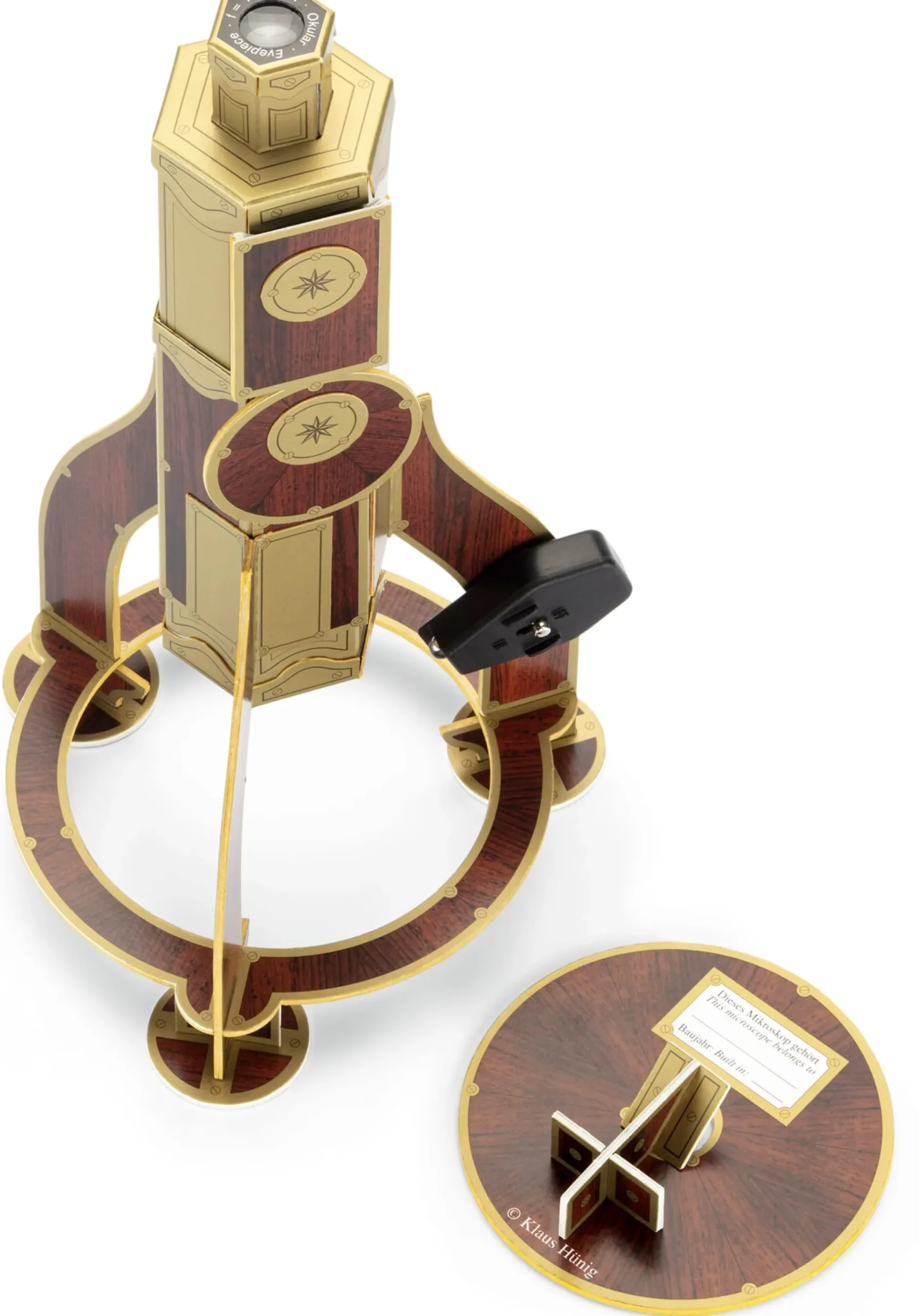 Es braucht lediglich einige unterhaltsame Stunden Ihrer Zeit – je nach Erfahrung der Bastler*innen schätzt der Hersteller 10 bis 14 Stunden ein – und wie gewohnt etwas Konzentration und Geduld, bis Sie den vorliegenden Bausatz zum voll funktionsfähigen Mikroskop zusammengesetzt haben. Zusätzlich benötigen Sie die üblichen Utensilien wie ein scharfes Bastelmesser, ein Falzbein und Alleskleber, um alsbald in den faszinierenden Mikrokosmos eintauchen und mit neuen Einblicken und Einsichten wieder auftauchen zu können.