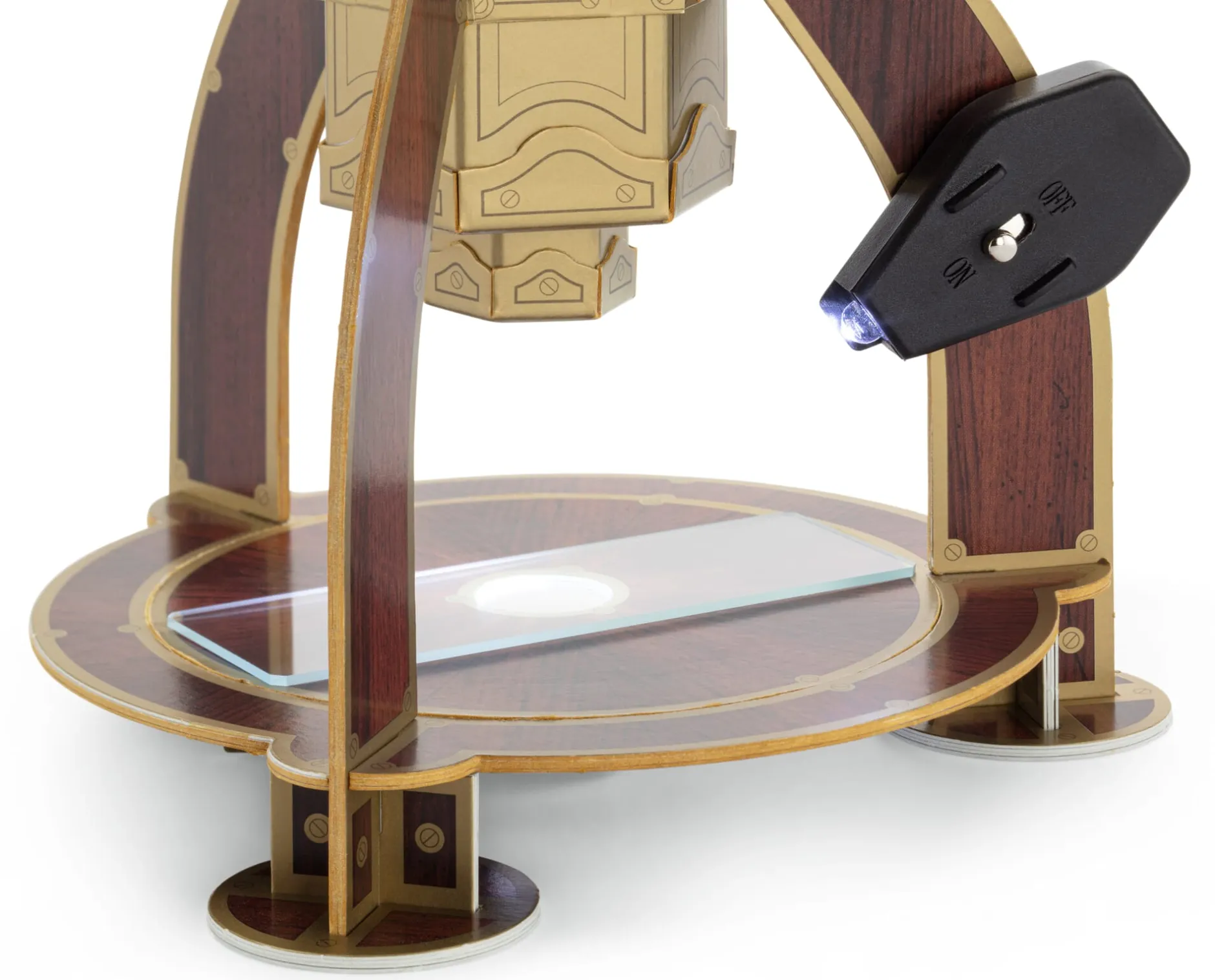 Einen ersten scharfen Blick in den Mikrokosmos vermittelt Ihnen bereits dieses 70-fach vergrößernde monokulare Lichtmikroskop. Seine Bauart geht auf den englischen Feinmechaniker Edmund Culpeper zurück, der um 1725 erfolgreich das Dreibeinmikroskop einführte (bis ins 19. Jahrhundert gehörte es zum Standard des Instrumentenbaus). In unserem AstroMedia Culpeper-Mikroskop bilden fünf aus Acrylglas geschliffene Linsen – zwei im Objektiv und drei im Okular – die leistungsstarke Optik, deren Berechnung fachmännisch-präzise von der Optikwerkstatt Wolfgang Busch (Ahrensburg) durchgeführt wurde. Die Schärfeeinstellung erfolgt über das Exzenterrad, an dem Sie den Tubus in der Höhe verschieben; die Beleuchtung übernimmt eine LED-Leuchte, die mithilfe von zwei Knopfzellen (CR2032) betrieben wird. Besonders schön: Bei eingelegtem Objekttisch können Sie von der Auflicht- zur Durchlichtmikroskopie wechseln, indem Sie die LED-Leuchte vom Fuß abnehmen und von der Seite unter den Objekttisch leuchten lassen. Dort befindet sich ein Durchlichtreflektor, der seitlich einfallendes Licht nach oben zum Objektiv lenkt. Auf diese Weise können Sie nicht nur die Struktur einer Vogelfeder oder den Körperbau eines Insekts studieren, sondern auch Untersuchungen zum Beispiel eines Heuaufgusses vornehmen: Dank der 70-fachen Vergrößerung lassen sich mit diesem Mikroskop durchaus Wasserflöhe oder Rädertierchen unter die Lupe nehmen. Übrigens können Sie den Objekttisch drehen, um beispielsweise ein Glasträgerpräparat aus einem anderen Blickwinkel zu betrachten, und ebenso komplett herausnehmen, um das Mikroskop kurzerhand über dem Objekt Ihres wissenschaftlichen Interesses zu positionieren.