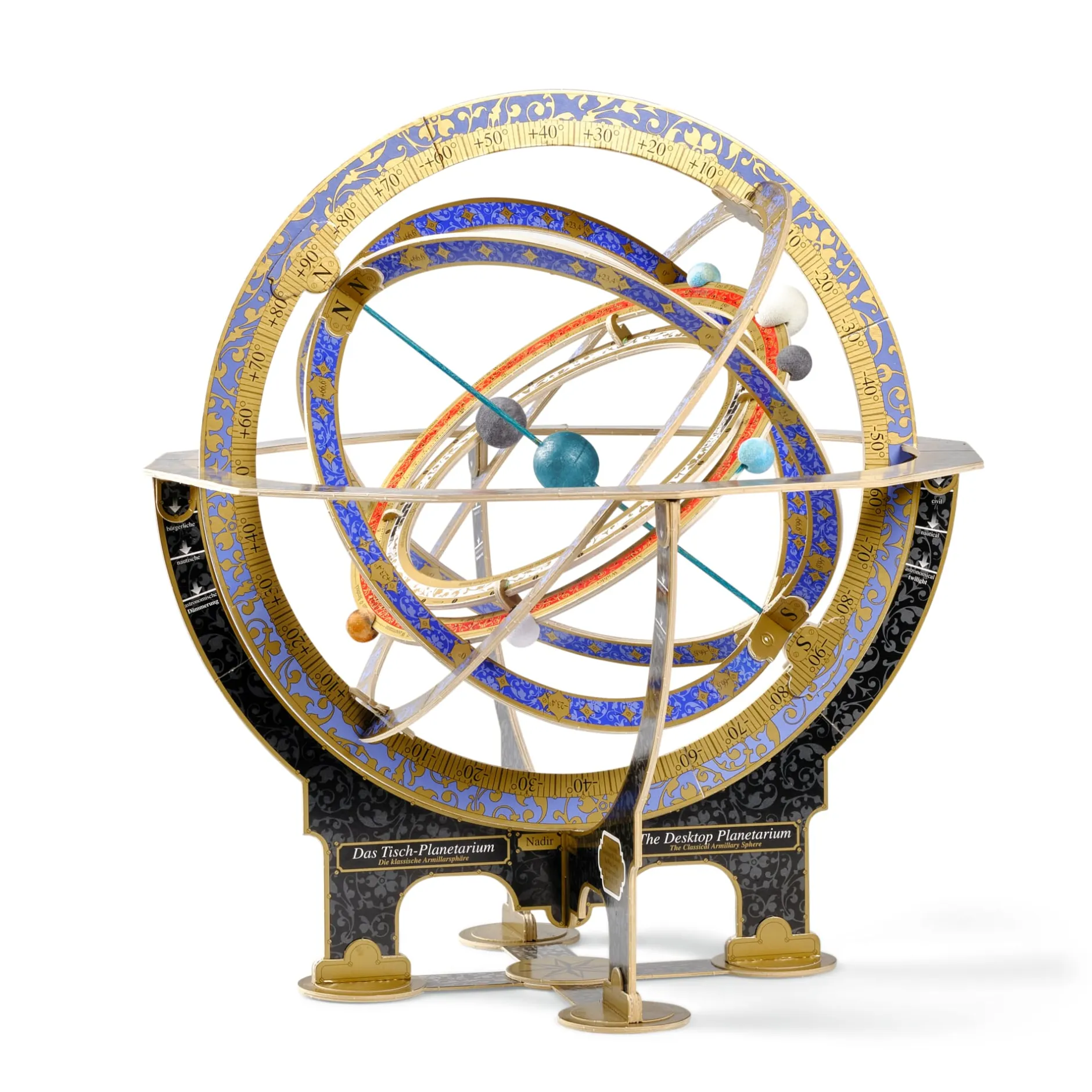 Es braucht lediglich einige Stunden Zeit und die gewohnte Geduld eines*einer Bastler*in, bis Sie mit dem Tisch-Planetarium, nach Vorbild der klassischen Armillarsphäre konstruiert, über ein funktionsfähiges Instrument verfügen. So berücksichtigt die Ekliptik – mit Datums- und Gradskala ausgestattet – sämtliche Jahrespositionen der Sonne und bildet ebenso die Bereiche der Tierkreis-Sternbilder und -zeichen ab; der Meridian lässt sich auf alle Breitengrade einstellen. Über den Stundenring können Sie die wahre Ortszeit sowie die Tages- und Nachtlängen und die Dämmerungszeiten ablesen. Zu einem beliebigen Zeitpunkt von einem beliebigen Ort auf der Erde aus betrachtet, können Sie damit die Position und Bewegung von Sonne und Planeten unseres Sonnensystems sowie der (Fix-)Sterne über und unter dem Horizont nachvollziehen und unter anderem die Entstehung der Jahreszeiten sowie der Sonnen- und Mondfinsternisse demonstrieren.