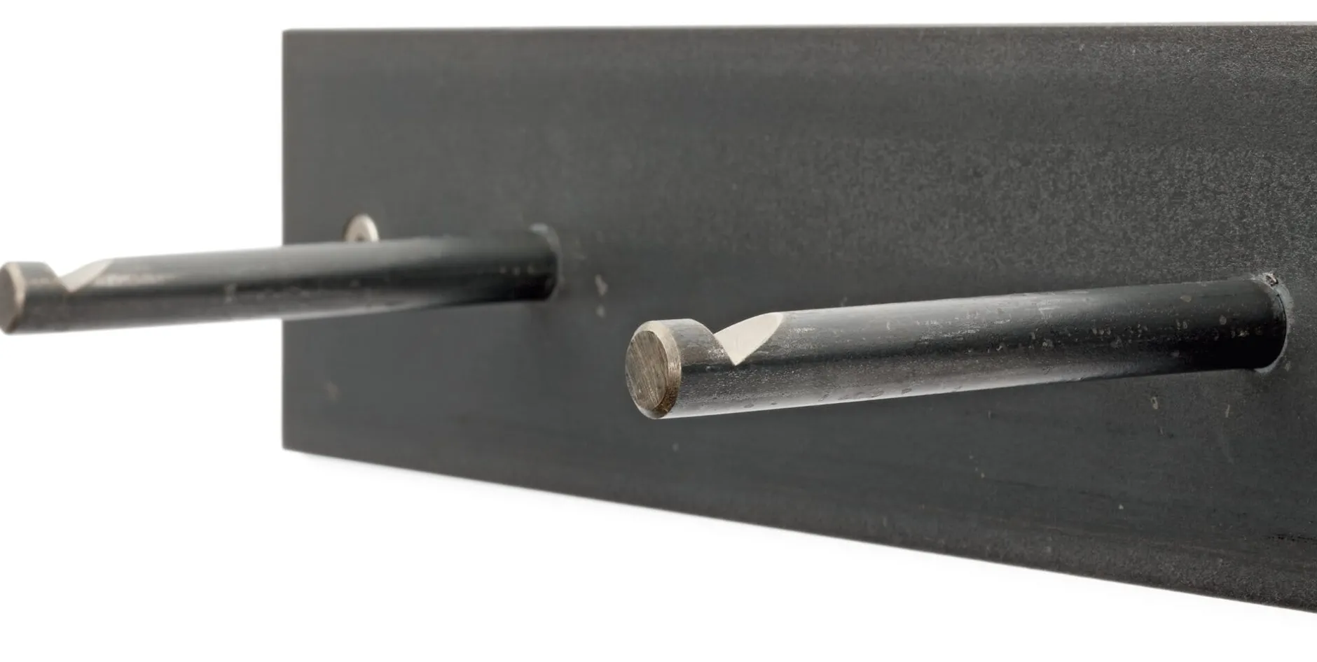 Reduzierter und gleichzeitig funktionaler geht es kaum. Diese Garderobenleiste besteht aus einem Stück Flachstahl und sechs gekerbten Rundeisen als Haken. Sie sind so angebracht, dass auch bei der Montage von zwei oder mehr dieser Garderoben nebeneinander die Abstände der Haken immer gleich sind. Das Material ist nicht rostfrei, der Rohstahl ist jedoch geölt. Rost ist somit außerhalb von Feuchträumen kein Problem. Aus Deutschland.
