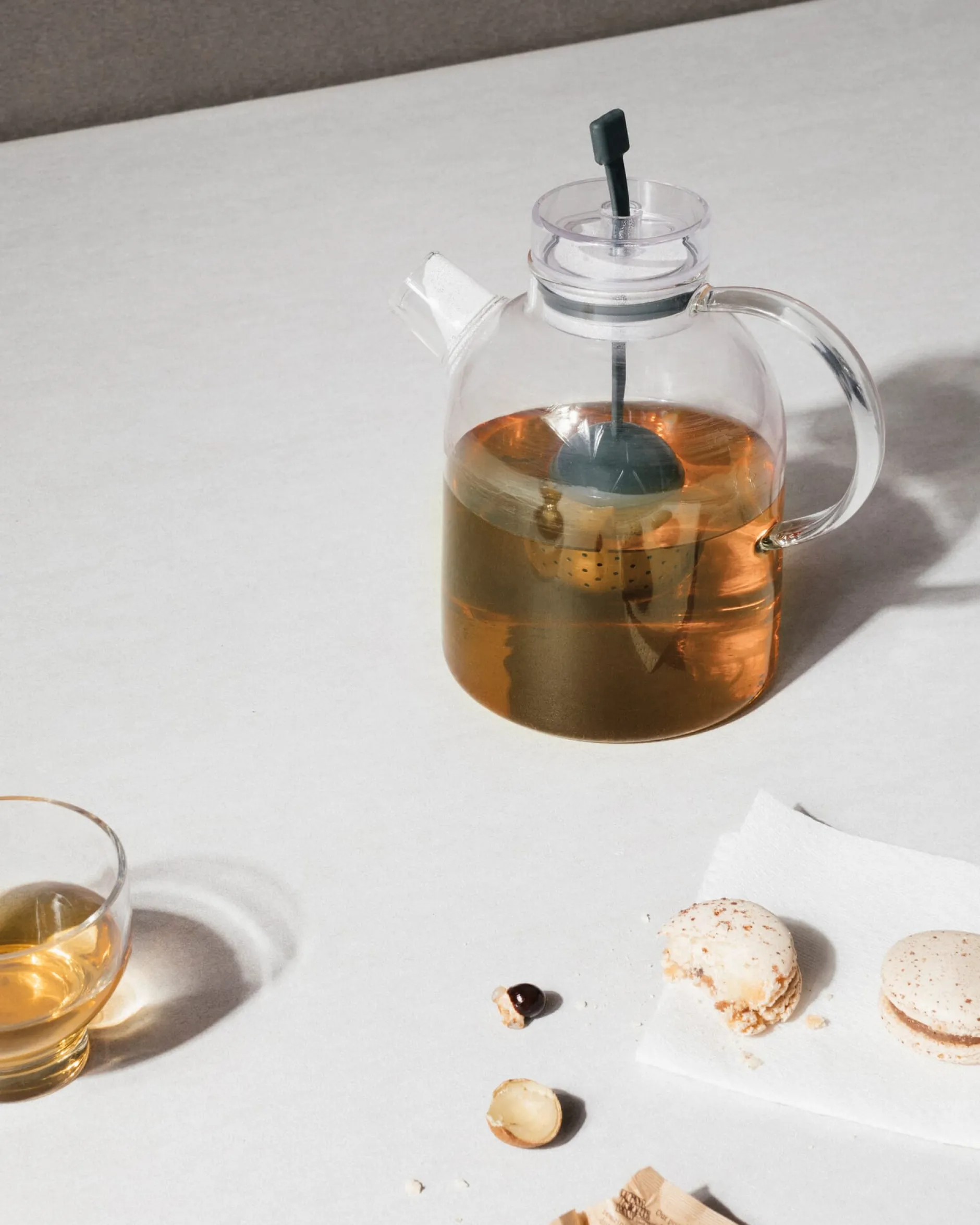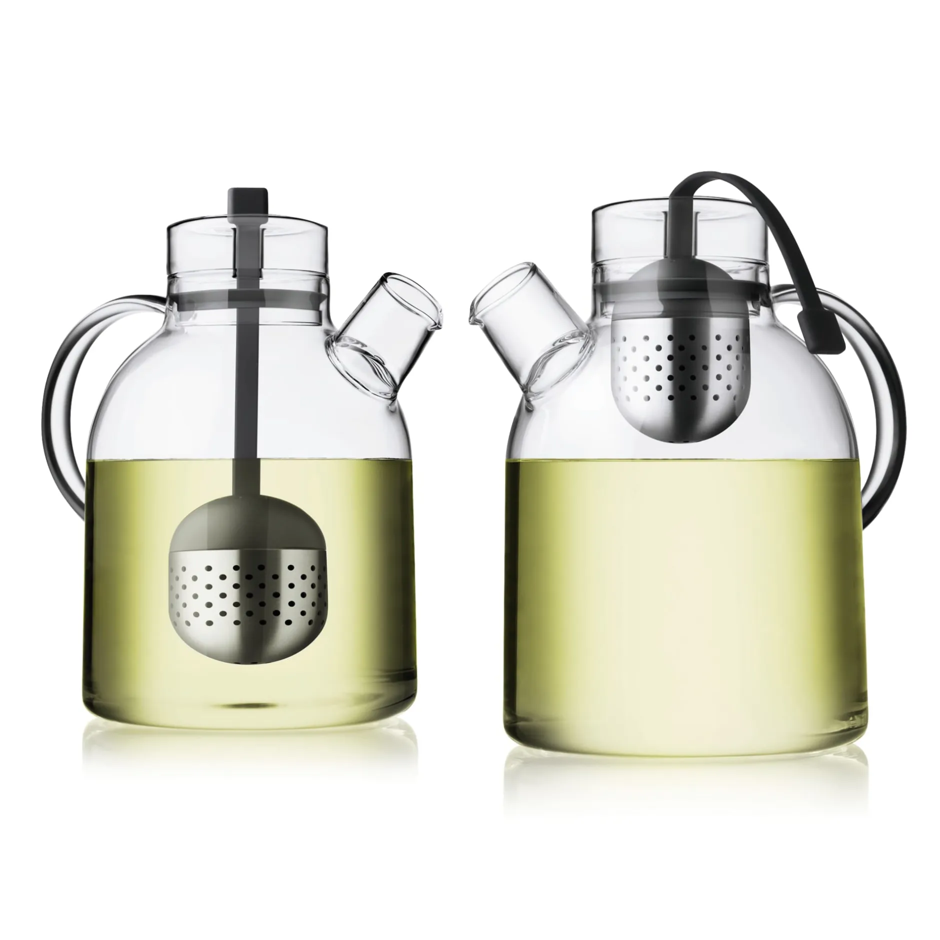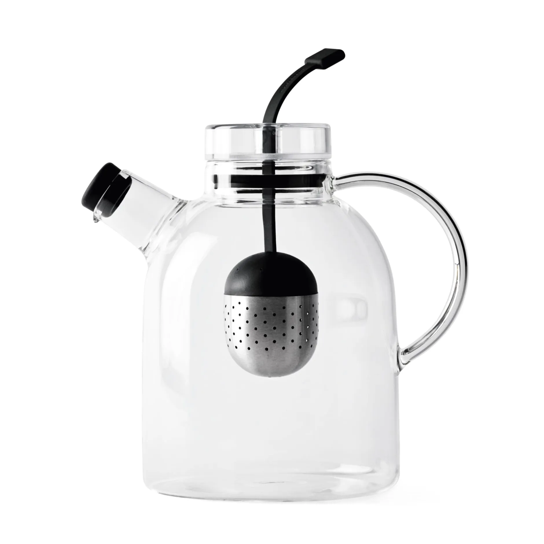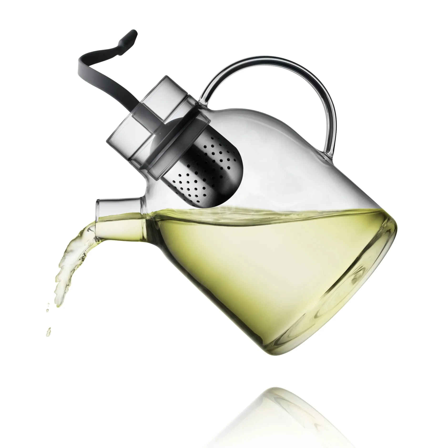 Transparente Teekanne aus hitzbeständigem und bruchsicherem Borosilikatglas. Das im Zentrum der Kanne zu platzierende Tee-Ei aus Edelstahl lässt sich mithilfe eines Silikonbandes in der Höhe variieren und dient als stilvoller Teebeutel in der Mitte der Teekanne .