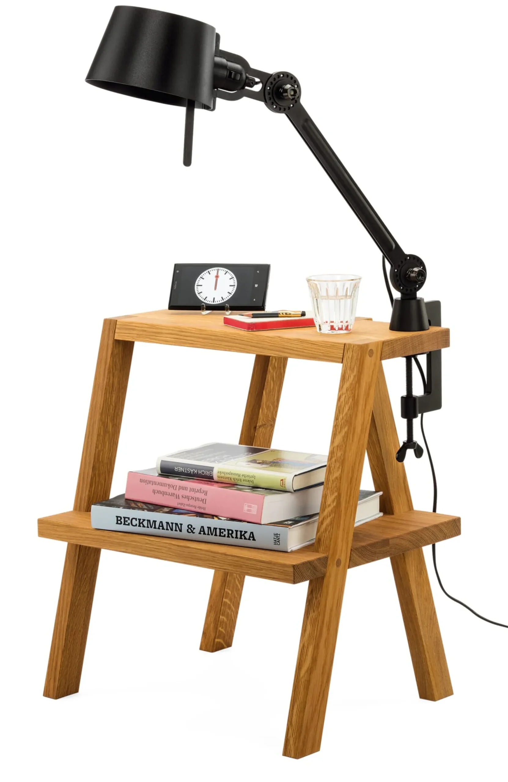 Gefertigt wird regional in Oberbayern, das Holz – meist Eiche, Esche und Buche – stammt aus zertifizierten Forstbetrieben. Der Kopf hinter Auerberg ist Christoph Böninger, einst beruflich Globetrotter, jetzt sesshaft gewordener Designverleger. Der in Designkreisen bestens vernetzte Böninger arbeitet in München und auf seinem Hof in Auerberg – daher der Name des Projekts – bei Bad Aibling. Und auch wenn Böninger für sein „Produktlabor“ einige Designer*innen und Architekt*innen um sich geschart hat – etablierte Größen stehen dabei gleichberechtigt neben aufstrebenden Talenten –, legt er immer noch selbst Hand an. Bisweilen ölt er Holzmöbel und macht sie versandfertig. Zu den bisher größten Erfolgen von Auerberg zählen übrigens der Tritthocker AEKI von Gerhardt Kellermann und die „Stumme Leiter“ von Christoph Böninger selbst, ein vielseitiger Hybrid aus Trittleiter und stummem Diener.