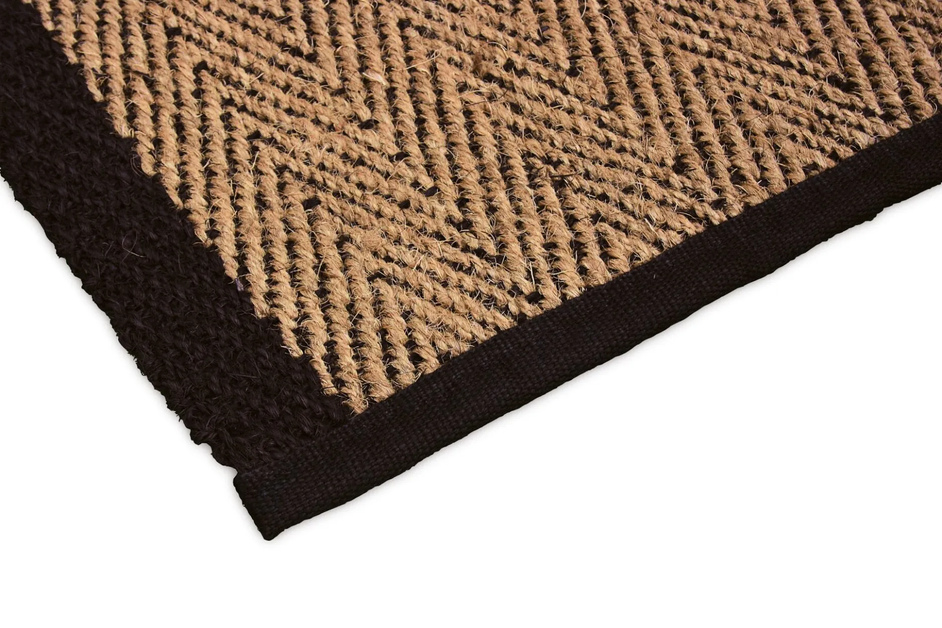 Das Fischgratmuster ist durchgehend mit zwei Farben gewebt: Natur und Schwarz. Mit einem etwa 7 cm breiten schwarzen Rand.