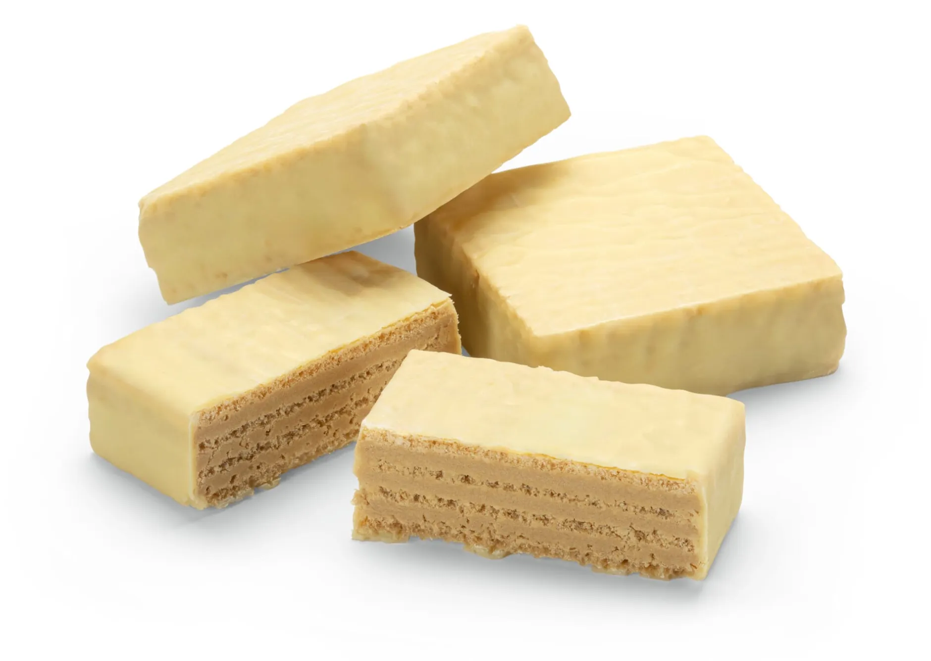 Diese Viennesi bestehen im Kern aus mehreren Lagen feiner knuspriger Waffeln, zwischen denen eine cremige Füllung – hier eine Pistaziencreme – liegt. Umhüllt wird das Ganze von einer Schicht feiner weißer Schokolade.