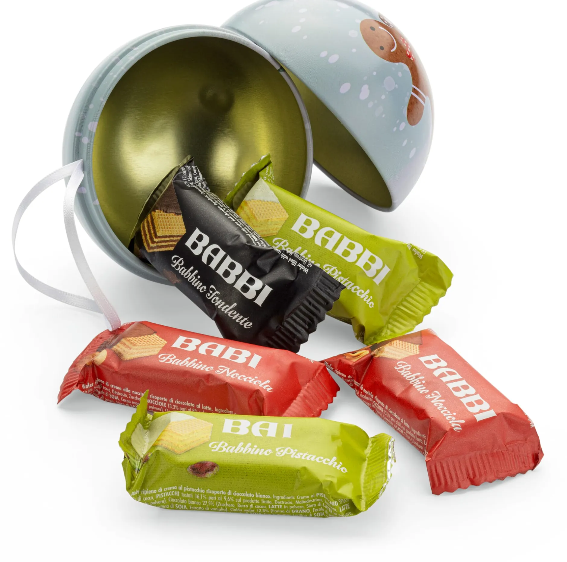 Die Tradition, Weihnachtskugeln mit Süßem zu füllen, ist in Italien weit verbreitet und Teil der umfangreichen Weihnachtsbräuche, die in vielen Haushalten gelebt werden. Dahinter steht der Gedanke, dass die Kugeln nicht nur den Baum schmücken, sondern auch kleine Köstlichkeiten enthalten – für Familienmitglieder und Freund*innen, die während der Feiertage zusammenkommen. Damit stehen die gefüllten Weihnachtskugeln auch symbolhaft für die Freude des Teilens. Babbi füllt diese mit einem dekorativen Weihnachtsmotiv geschmückte Kugel mit sechs gemischten Babbini-Cremewaffeln der Geschmacksrichtungen Nocciola (Haselnuss), Pistacchio (Pistazie) und Fondente (dunkle Schokolade). Und natürlich können Sie die Kugel nicht nur in den Weihnachtsbaum hängen, sondern auch ein Geschenk mit der süßen Köstlichkeit verzieren.