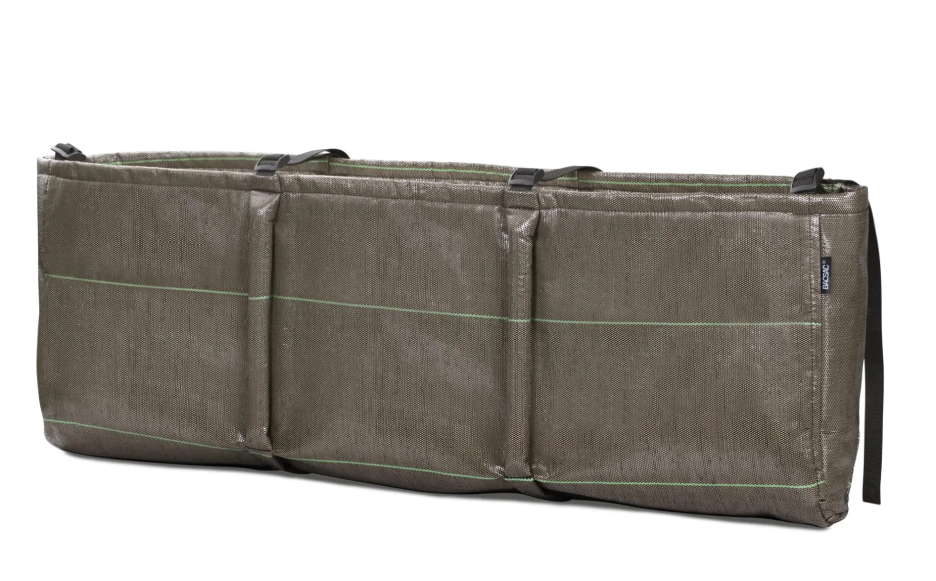 Der rechteckige BACSAC in einer Version mit an Balkongeländer zu schnürenden und per Klettband zu schließenden Gurten.