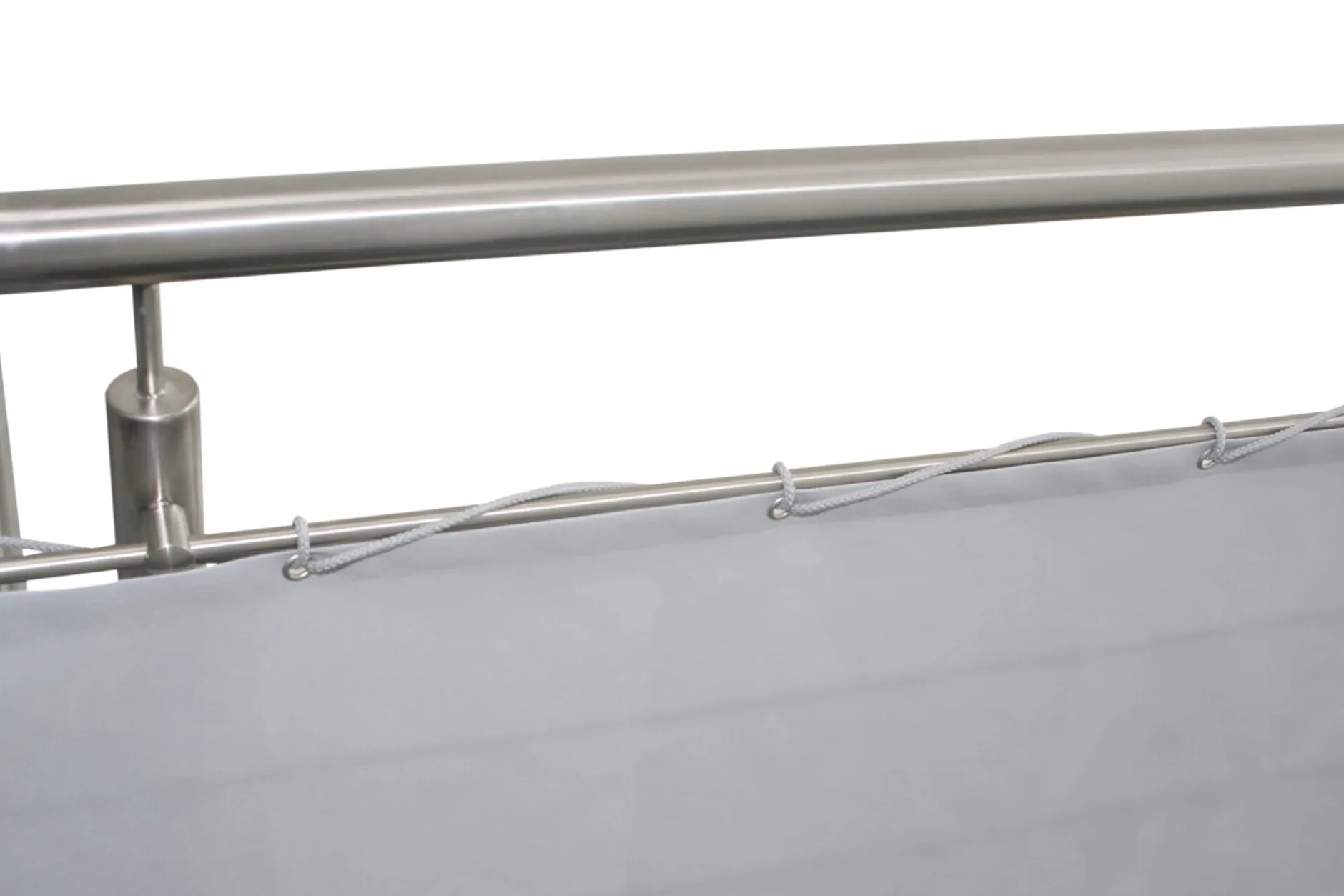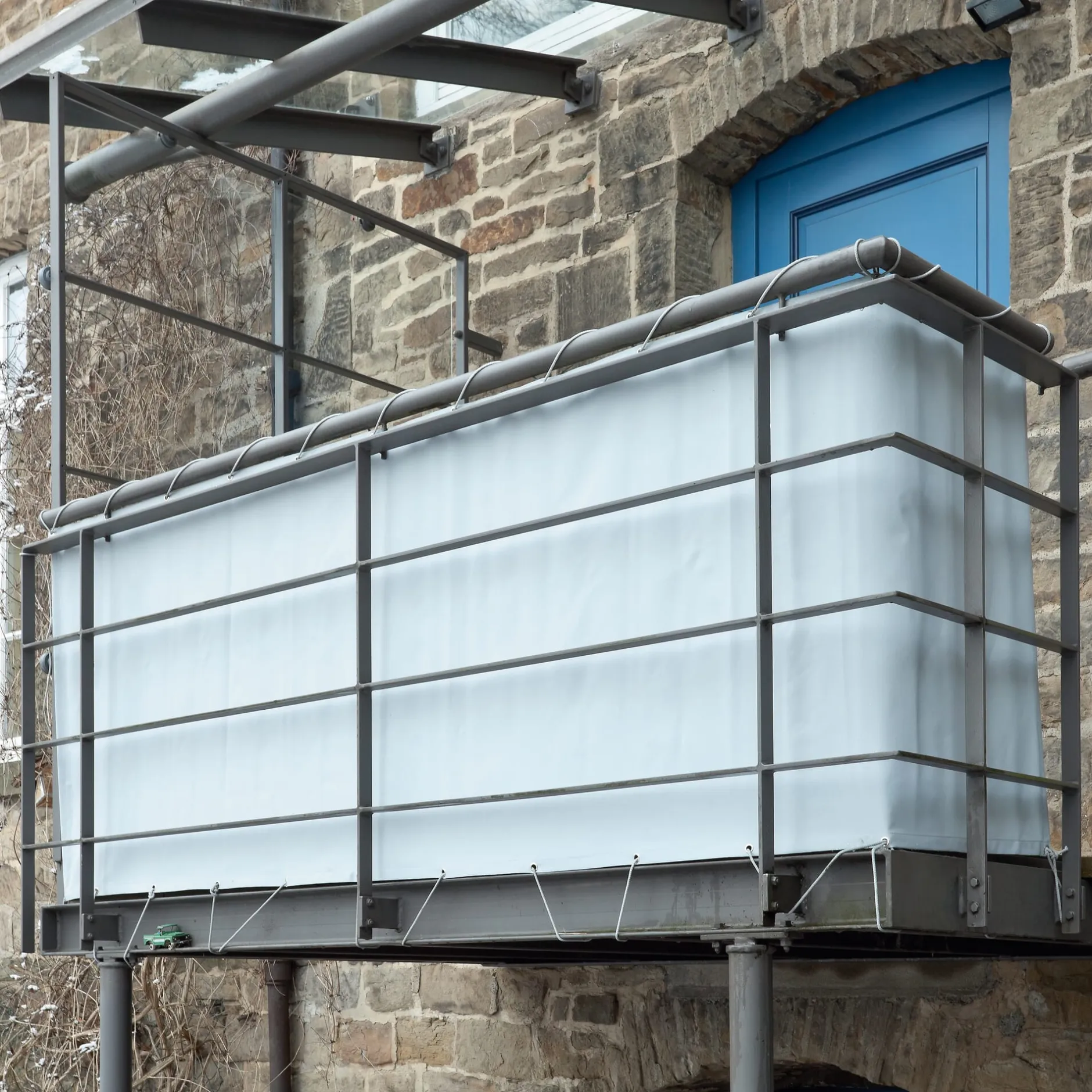 Sicht-, Wind- und Sonnenschutz: Steingraue Stoffbahn aus schwerem Textil, speziell für Balkonumrandungen gewebt. Das einem Markisenstoff ähnliche Material besteht aus wetterfestem, UV-stabilem Polyestergewebe, ist mit einer schmutz- und wasserabweisenden Antihaftbeschichtung versehen.