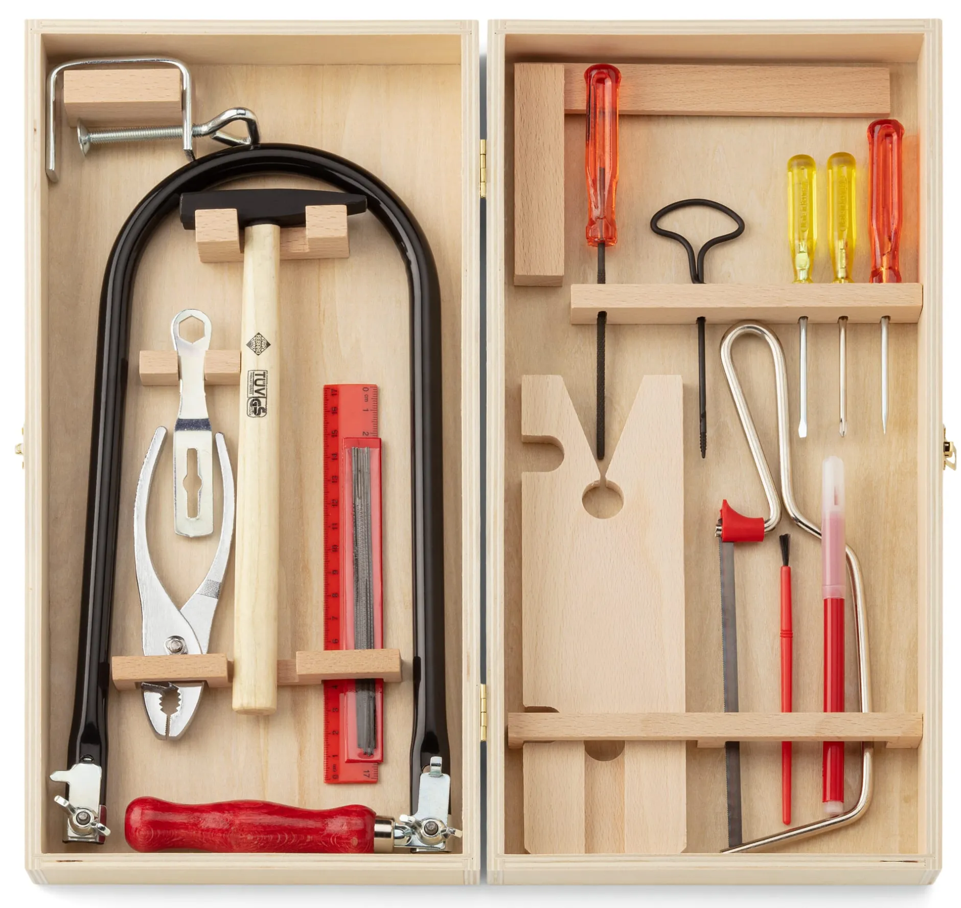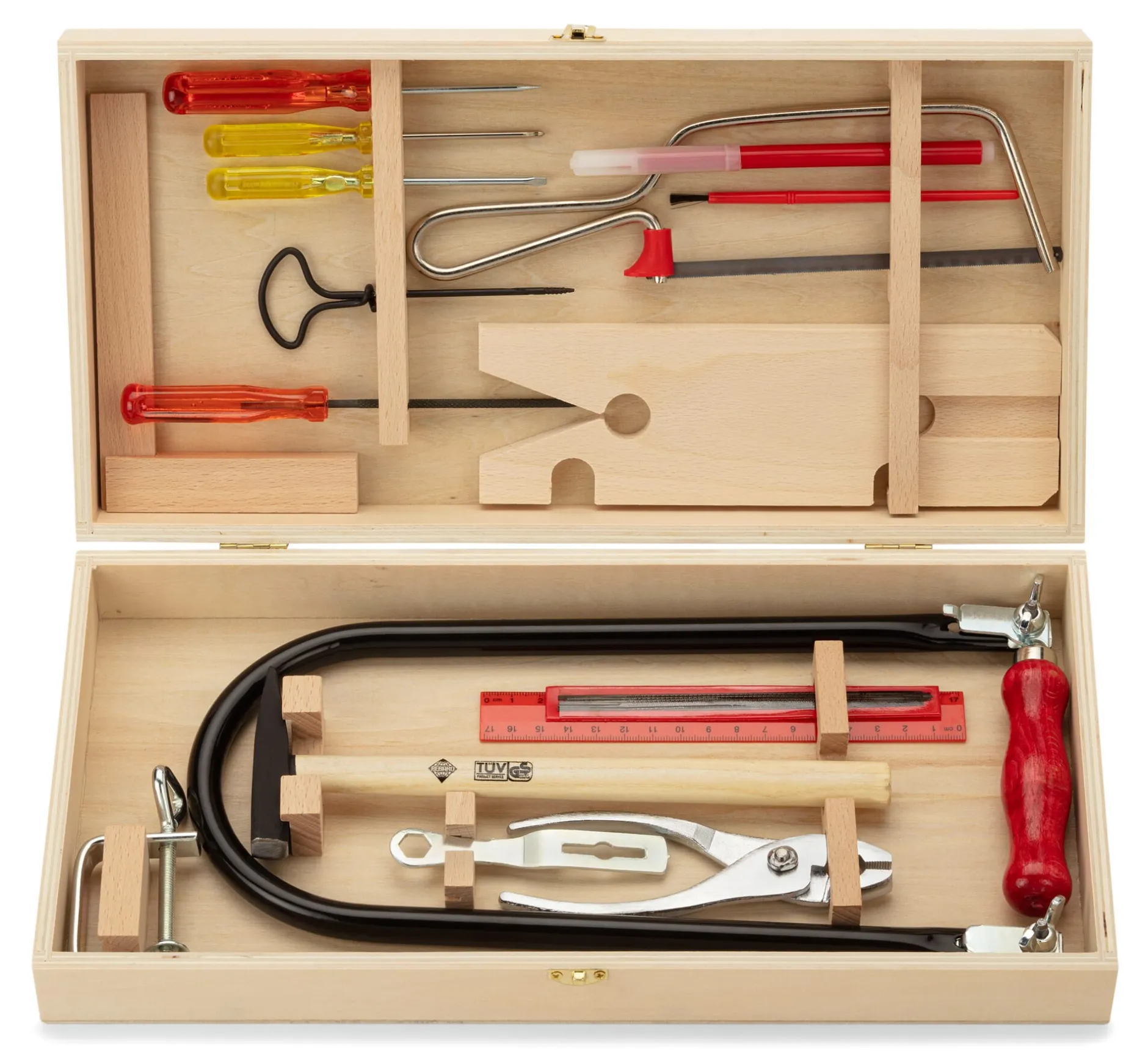 23-teiliges Werkzeug-Set, bestehend aus: 1 Laubsäge (Bügel L 31 × B 15,5 cm), 6 Laubsägeblätter, 1 Laubsägeschlüssel, 1 Brettchen mit Einspannhalterung, 1 Zwinge sowie 1 zusätzliche Säge (Blattlänge 15 cm), 1 Winkel, 1 Ahle, 1 Rundfeile, 1 Stahlzange, 1 Hammer, 1 Kreuz- und 1 Schlitzschraubendreher, 1 Nagelbohrer, 1 Lineal, 1 Stift und 1 Pinsel in einer Holzkiste (L 36,5 × B 18 × H 6,5 cm). Gesamtgewicht 1,35 kg.