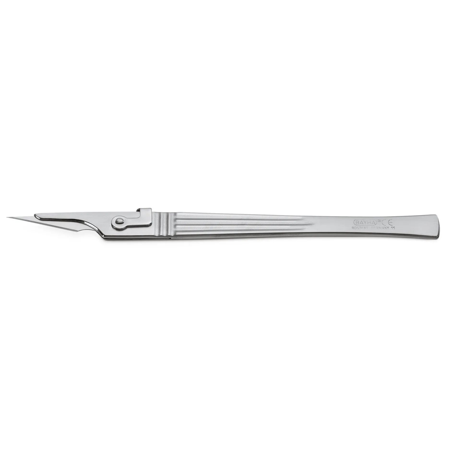 Eines Hervorhebens wert: die durchdachte Klingenhalterung der Edelstahlgriffe. Ein Riegelsystem sorgt für festen Klingensitz, ermöglicht ein leichtes und gefahrloses Austauschen und lässt die Skalpelle zu echten „Multifunktionsmessern“ werden.