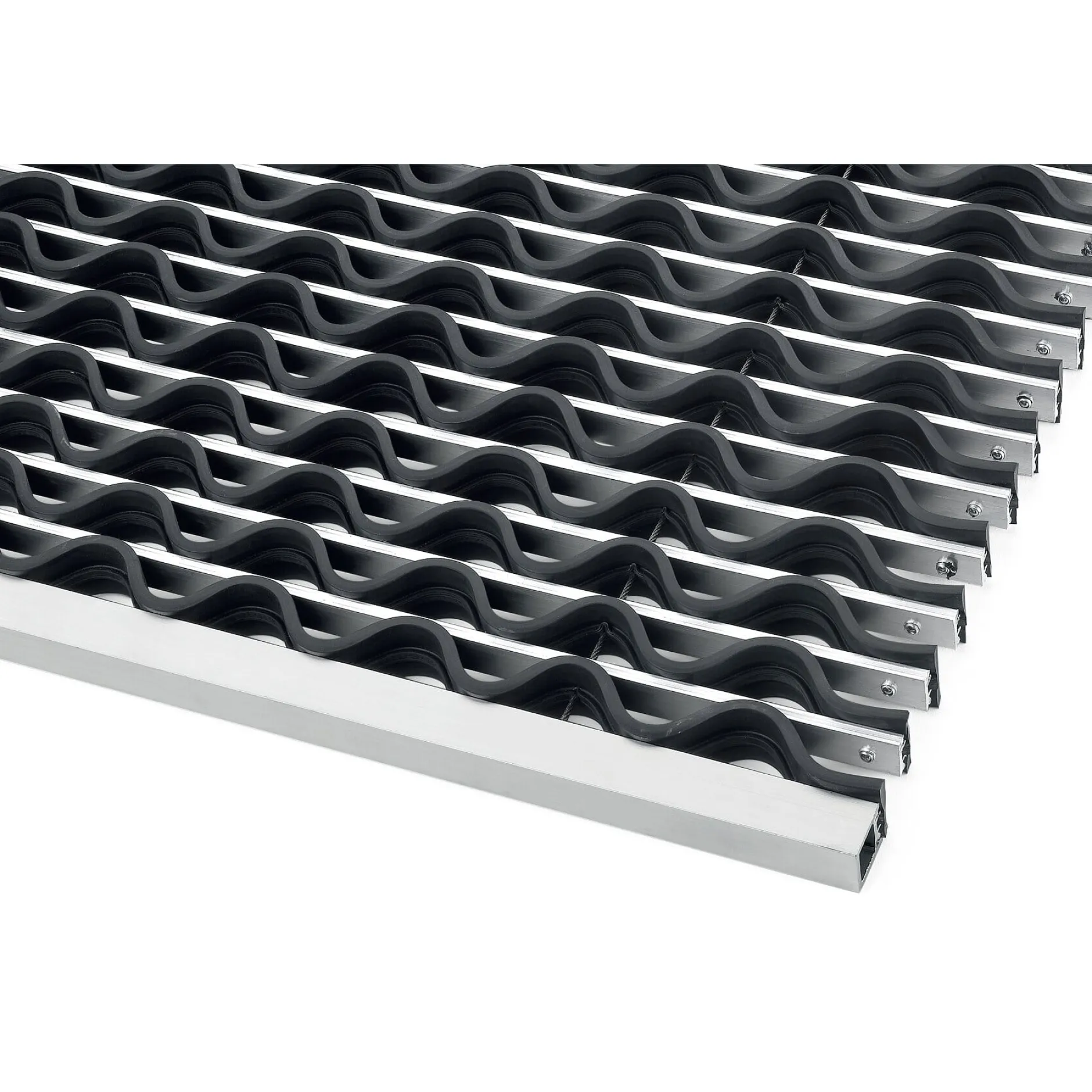 Die Fußmatte aus Westfalen wird eigentlich nur – in deutlich größeren Abmessungen für die Eingangsbereiche öffentlicher Gebäude produziert. Wir bringen sie hier in einer Größe für den Privatgebrauch mit den gleichen Produktvorteilen: Die wellenförmigen Lamellen sind aus einem in der Autoindustrie bewährten, gegen Sauerstoff, Ozon, Fette und Öle resistenten Kunstkautschuk. Das rutschfeste Material wird durch korrosionsbeständige Aluminiumprofile stabilisiert. Das ganze System wird in Querrichtung durch Edelstahlseile zusammengehalten. Die Matte lässt sich zerlegen und reparieren.