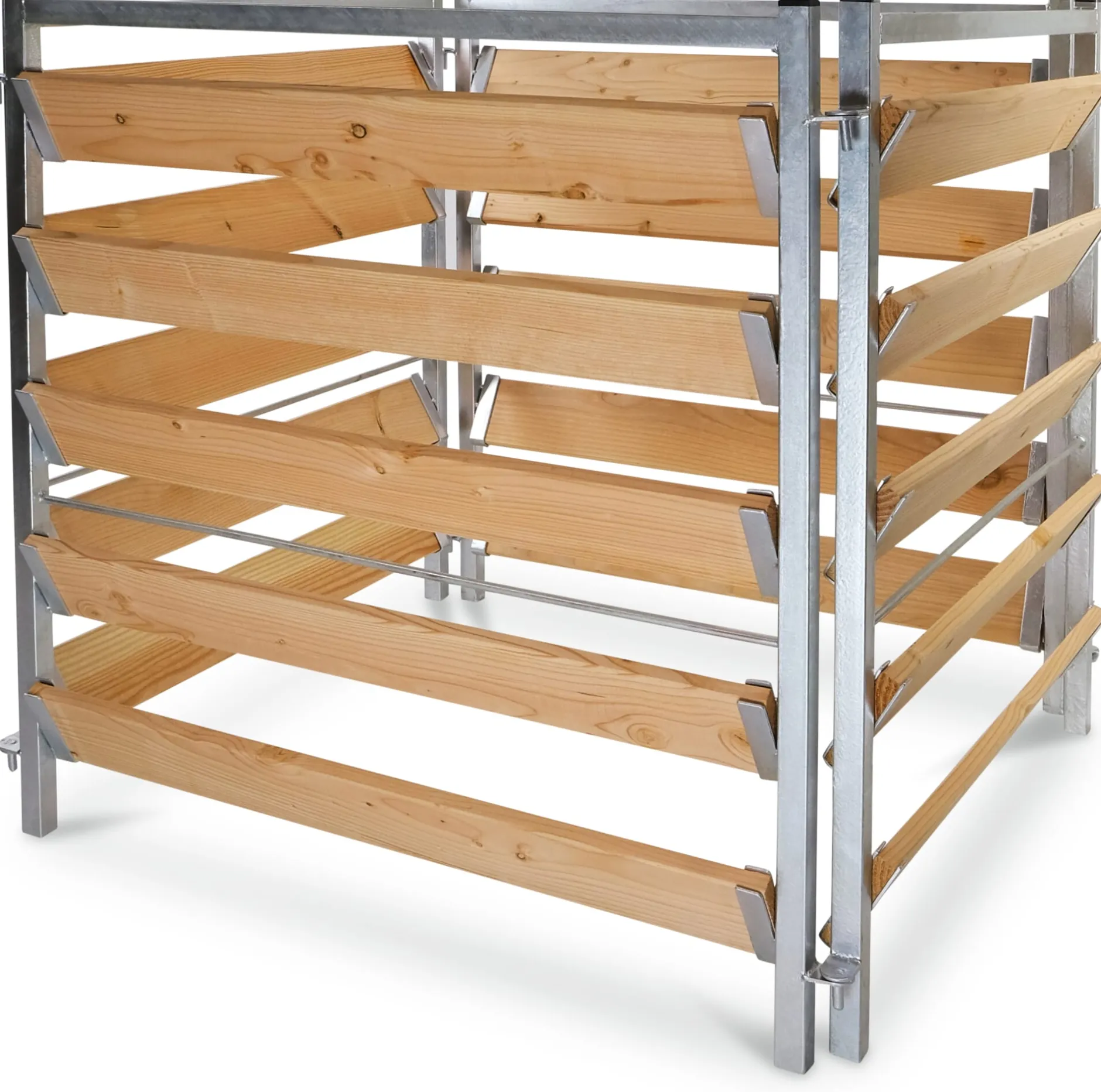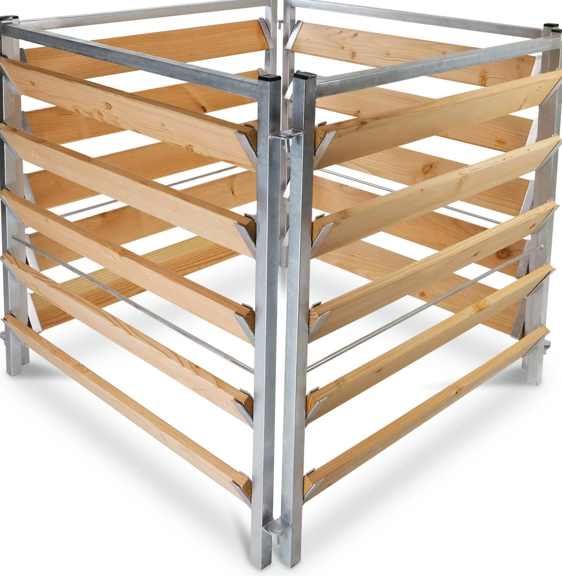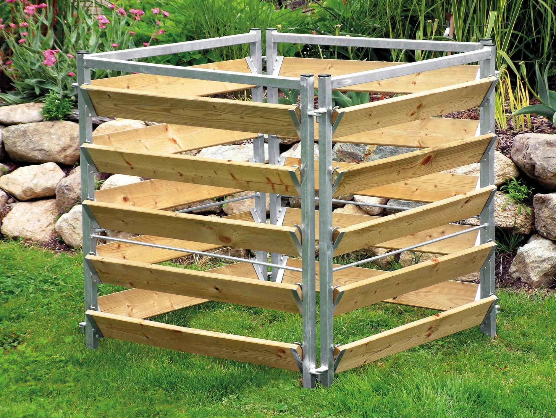 Das Stecksystem erleichtert das Befüllen und die Entnahme von allen Seiten. Rahmen aus feuerverzinktem Stahl (Beschichtung 70 µm). 20 Dielen aus Lärchenholz (L 87,4 × B 10,5 × H 1,9 cm, Herkunft Deutschland). Gesamt L 107 × B 107 × H 100 cm. Füllmenge 1000 l. Gewicht 37 kg.