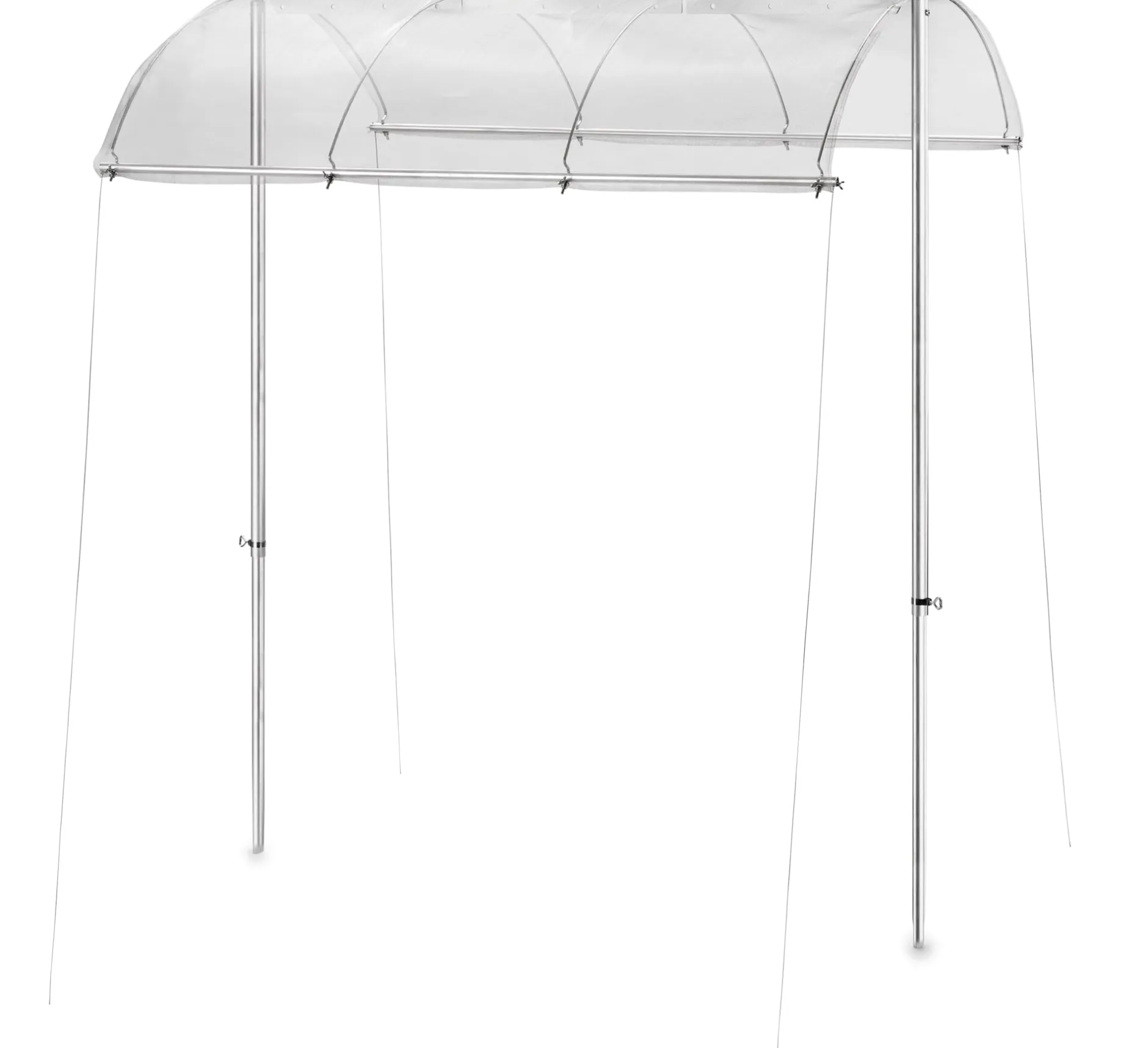 Mit Aluminiumnetz. Zubehör für die Befestigung des Netzes aus Edelstahl und Stahl verzinkt. Teleskopstangen aus Aluminium, höhenverstellbar von 125 bis 185 cm. Dach mit einer Schutz- und Nutzfläche von 1,8 qm. Gesamt L 150 × B 120 × H 185 cm.