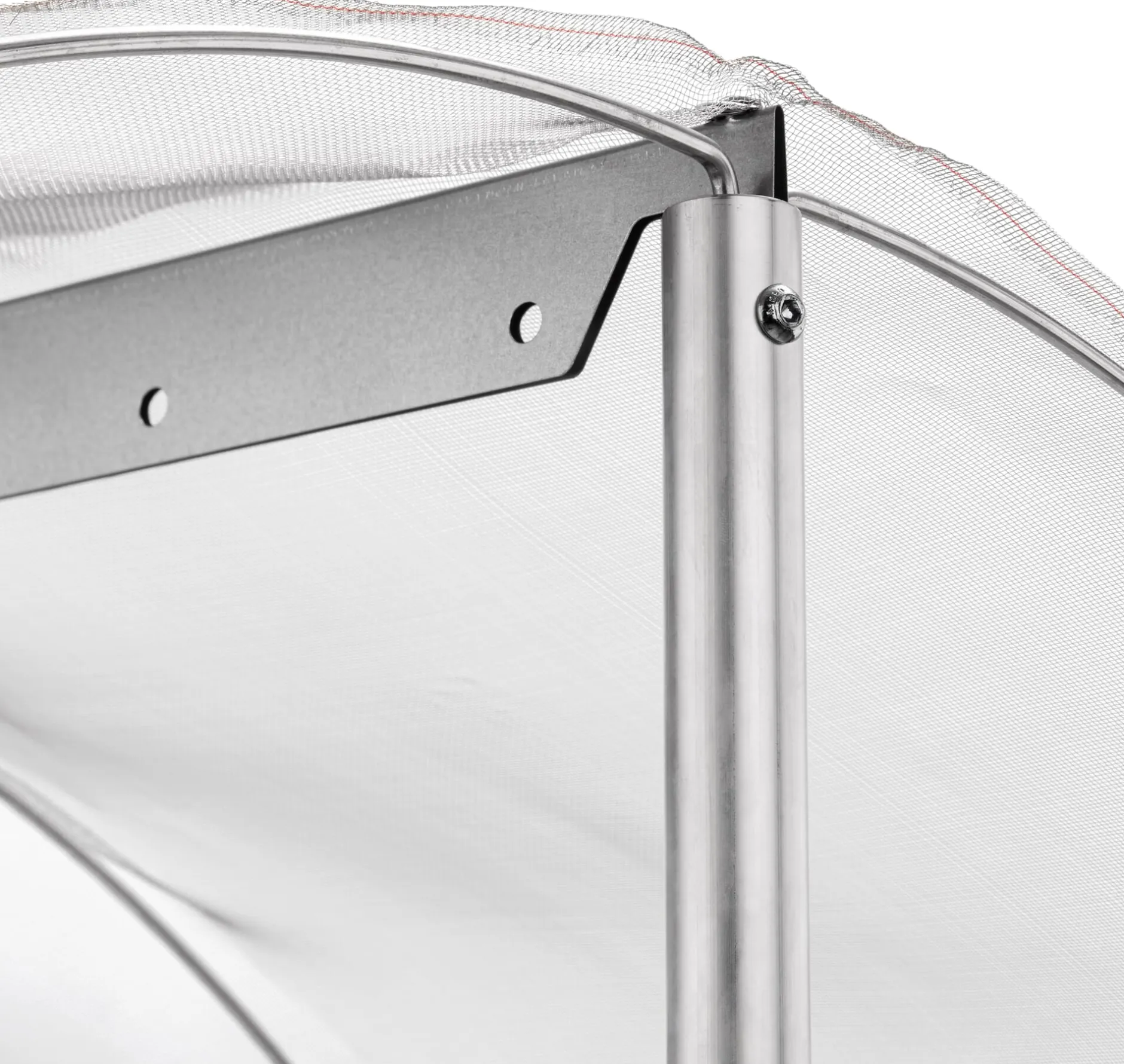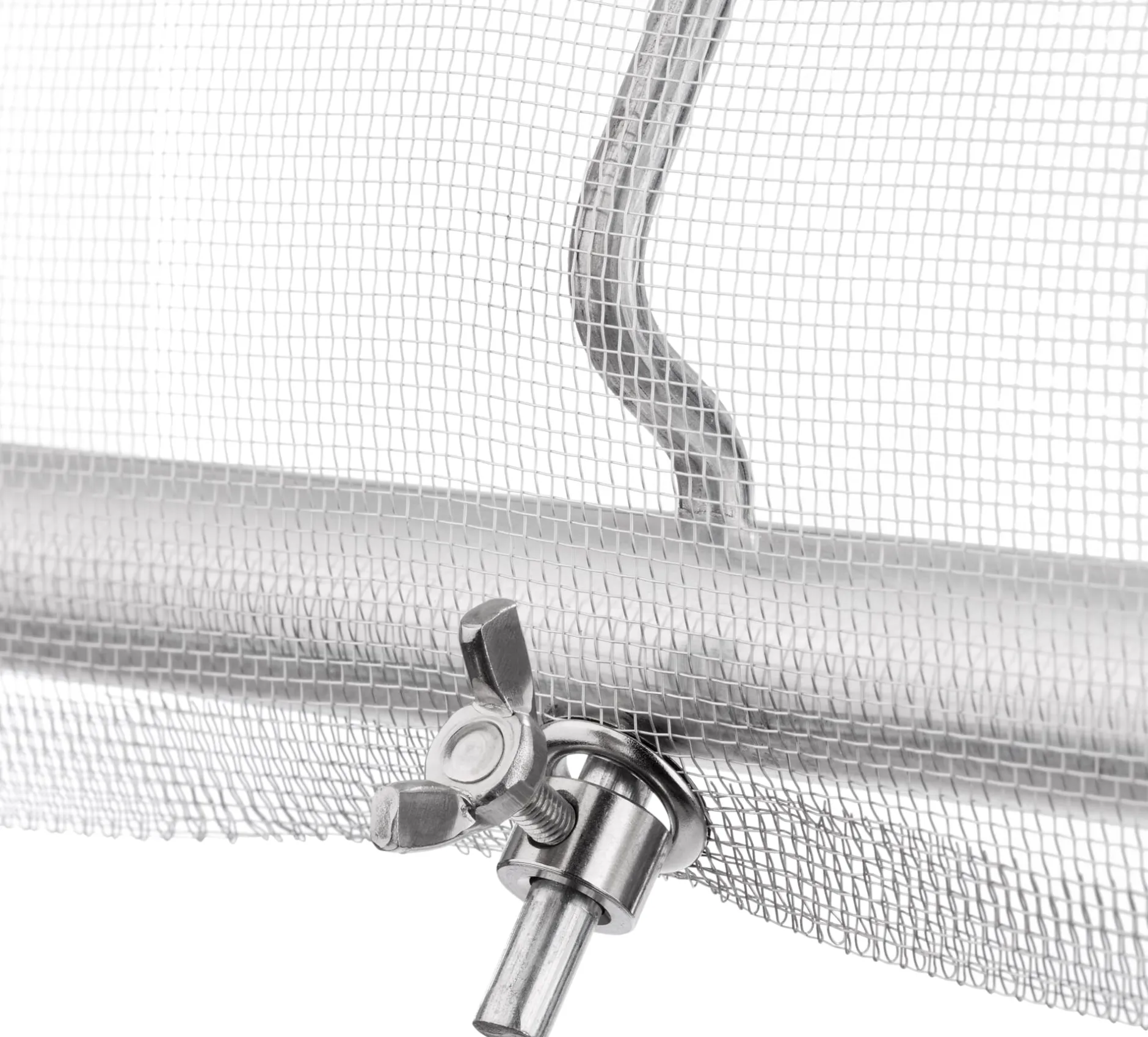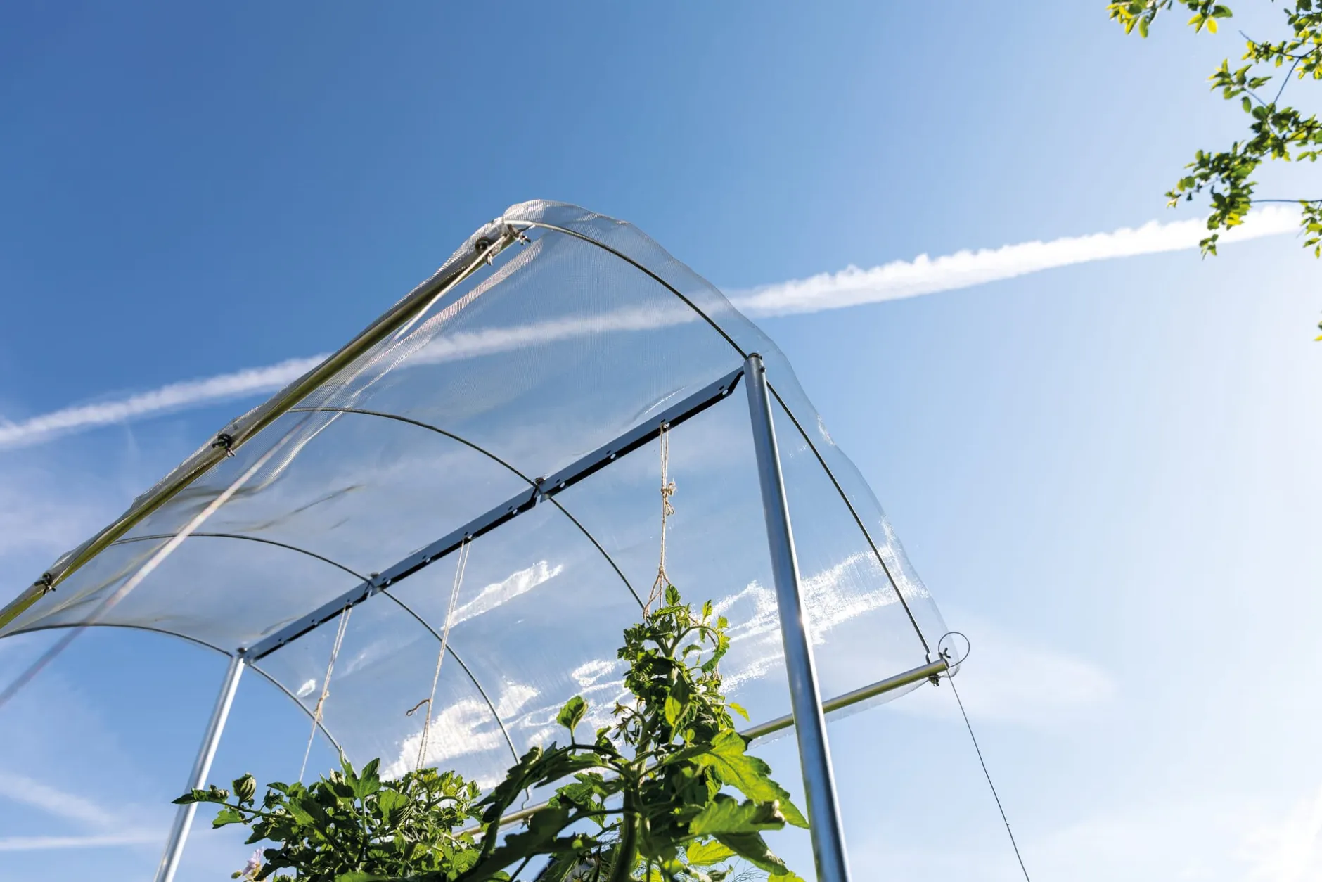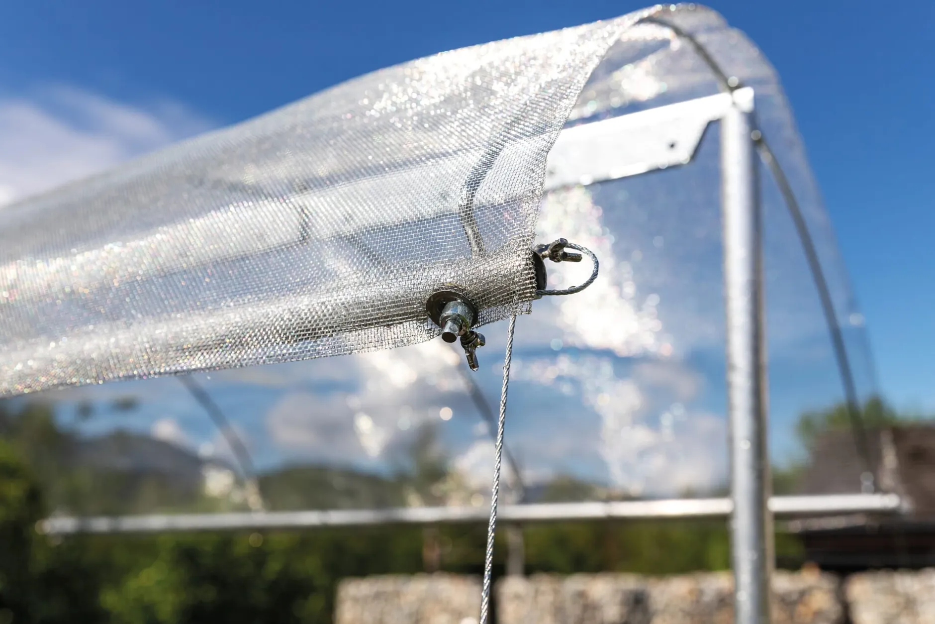 Soweit, so bekannt. Das Besondere an dieser Ausführung des Produkts: Unser Tomatendach kommt vollständig ohne Bauteile aus Kunststoff aus. Die Dachauflage selbst besteht aus einem biegbaren, dennoch stabilen Aluminiumnetz, das über das Gestell gespannt und mittels Schrauben und Muttern fixiert wird. Von den Gemüsegärtner*innen auf der Insel Reichenau getestet und für gut befunden: Durch die feinen Maschen des Netzes gelangt kein Regen hindurch, im Gegenteil – auf der fest gespannten Oberfläche zerstieben die Regentropfen in alle Richtungen und lösen sich zu feinstem Sprühnebel auf. So stellt das Nass von Oben für Ihre Tomatenpflanzen keine Gefahr dar.