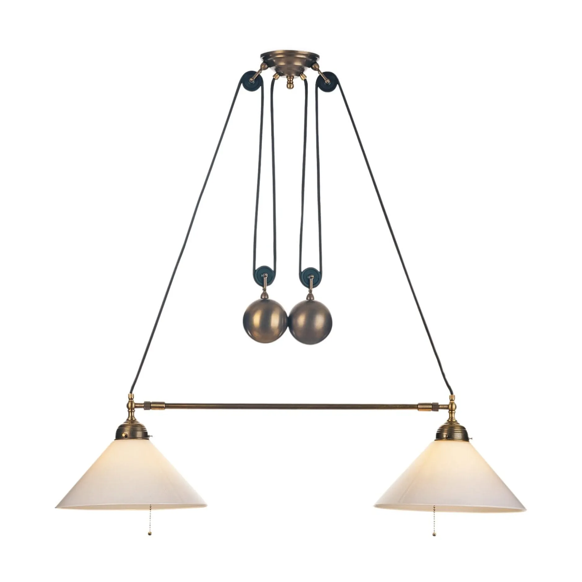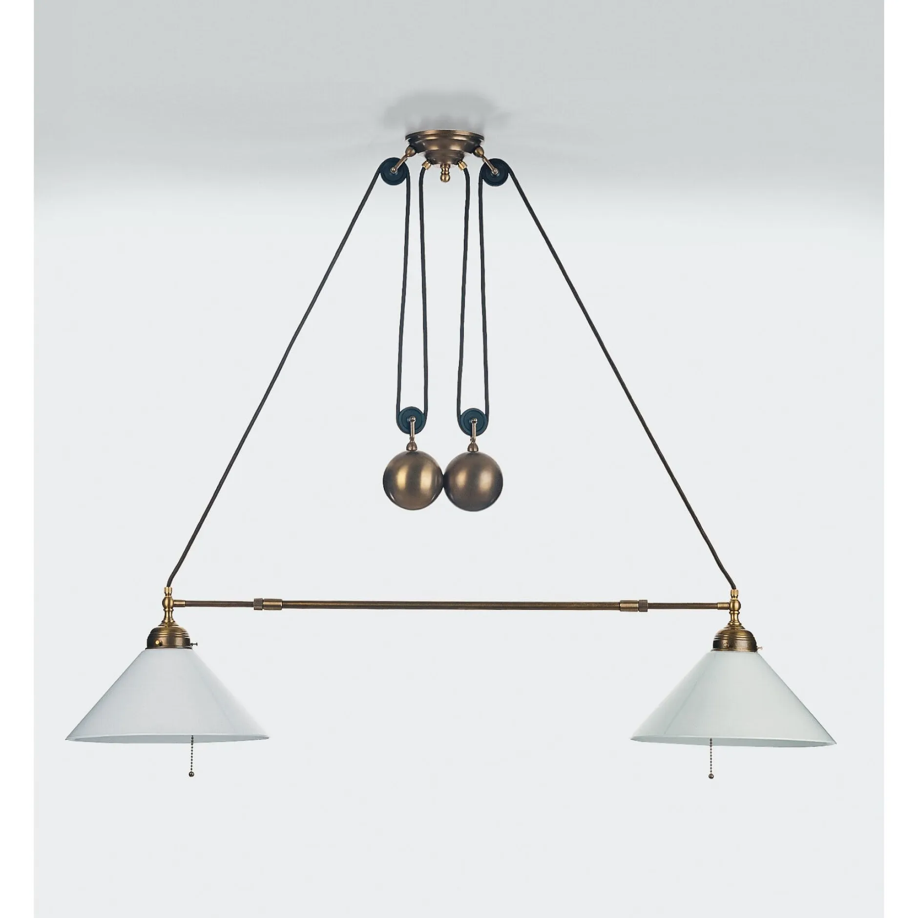 Zweiflammige, flexible Esstischleuchte, die sowohl in horizontaler (teleskopierbare Stange) als auch in vertikaler Ausrichtung (Seilzug mit Gegengewichten) verstellt werden kann. Das ist vor allem über ausziehbaren Tischen sehr von Nutzen: Vergrößert sich die Tischrunde, lässt sich die Gesamtbreite der Leuchte von 91,5 bis 133 cm variieren. Der damit automatisch eintretende „Höhenschwund“ kann mittels der sinnigen Aufhängevorrichtung ausgeglichen werden. Die Deckenbefestigung besteht aus einer Stahlplatte; bitte stellen Sie sicher, dass eine stabile Deckenkonstruktion vorhanden ist. Beide Leuchten können getrennt geschaltet werden.