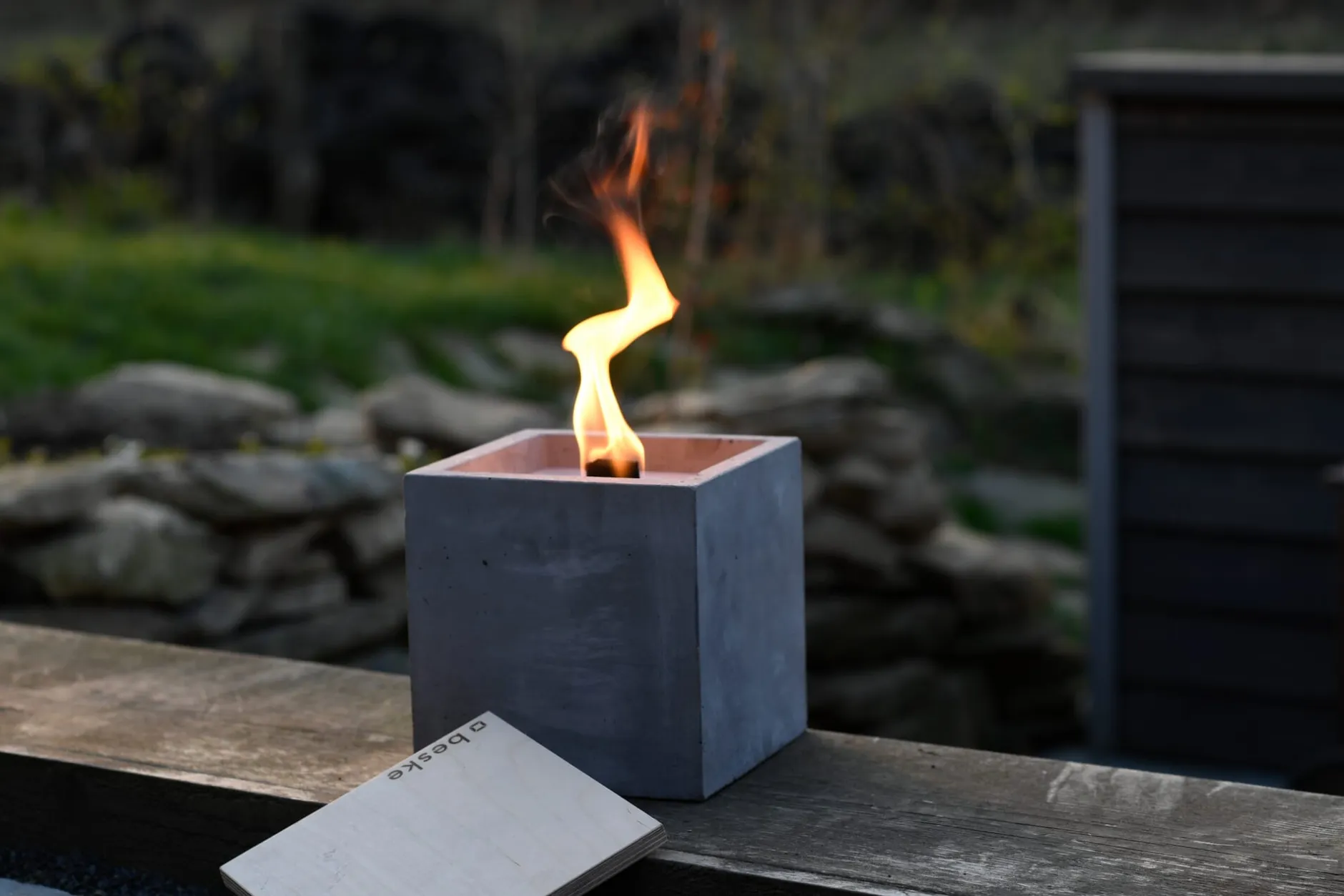 Im Garten und auf der Terrasse nimmt sich der Betonfeuer-Würfel als atmosphärische Lichtquelle aus. Die große Brennkammer und der außergewöhnlich starke Docht der Schale sorgen für eine hohe Widerstandsfähigkeit der fackelähnlichen Flamme, die selbst noch unter widrigeren Witterungsbedingungen 10 bis 15 Zentimeter hoch lodert.