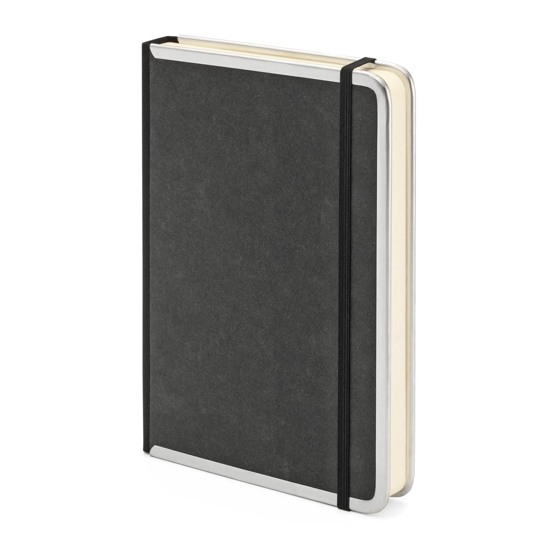 Notizbücher, die unterwegs – im Rucksack oder gar in der Expeditionskiste – allen Zwischenfällen trotzen sollen, müssen ordentlich bewehrt sein. Diese hier sind durch einen an den Ecken abgerundeten Einband aus 2 mm starkem Texon und dreiseitig umlaufende vernickelte Metallkanten für jeden noch so widrigen Einsatz gerüstet. Und damit das leicht chamoisfarbene 90-g-Papier des fadengebundenen Buchblocks keinen Schaden nimmt, verhindert ein Gummiband unbeabsichtigtes Öffnen. Diese Notizbücher führen wir jetzt in neuen Farben (die „ATOMA-Farben“) und in einem neuen Format.