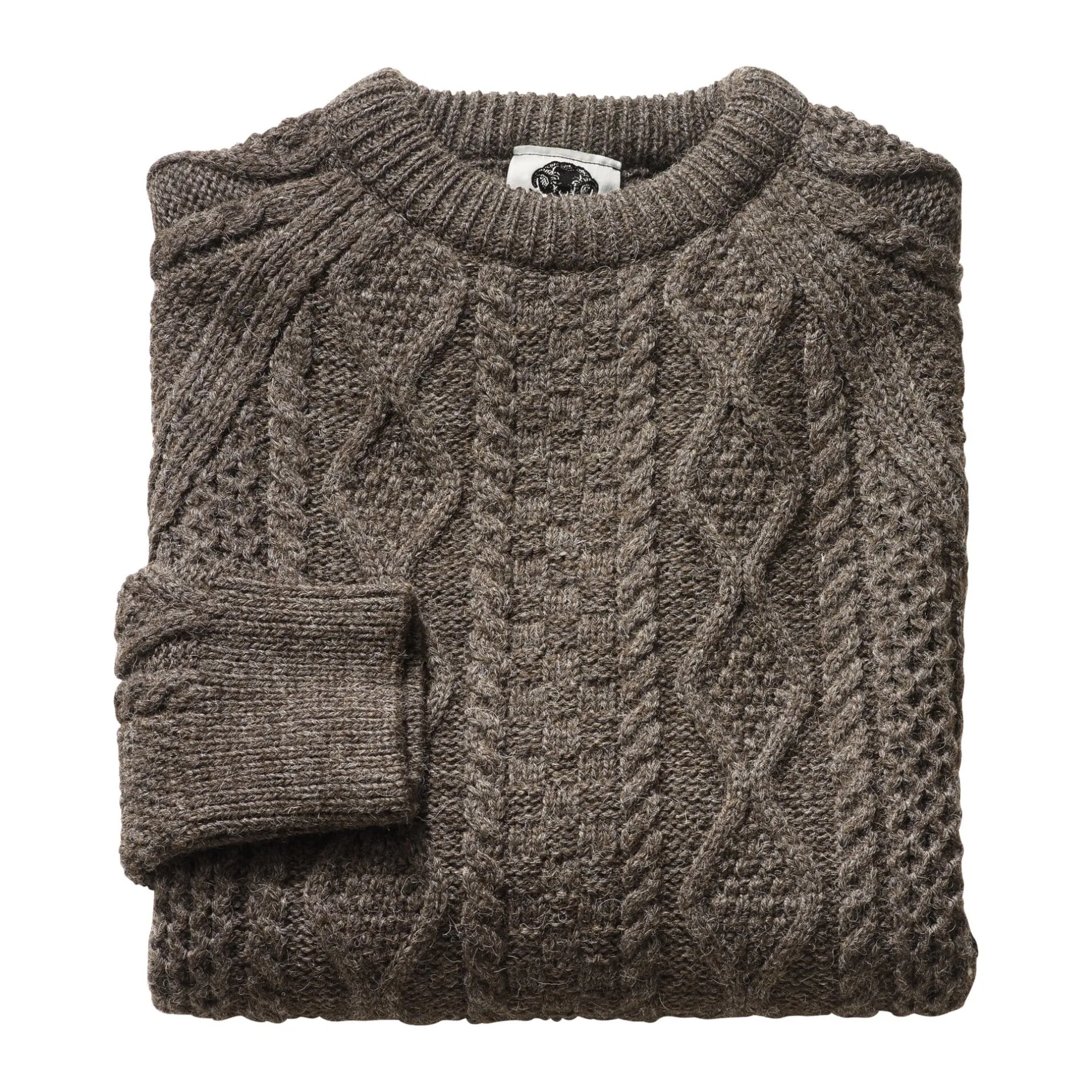 Der Geruch dieses Rundhalspullovers – von einigen durchaus als Duft bezeichnet – lässt sich nur beschreibend näher bringen: Das Gestrick riecht verhalten nach Lanolin, dem natürlichen Öl der Schafwolle, die auch für diesen Pullover ungebleicht und ungefärbt verwendet wird. Die Raglanärmel sind ohne Naht auf der Schulter gearbeitet. Sie begünstigen die angenehmen Trageeigenschaften des Pullovers – zusätzlich unterstreicht diese nahtlose Verarbeitung das charaktervolle, traditionelle Aranmuster, das so aus der Schulter bis in das Ärmelbündchen verläuft. Die Abschlüsse an Hals, Ärmeln und Rumpf sind in 1/1-Rippe gestrickt und bieten einen guten Körperschluss.