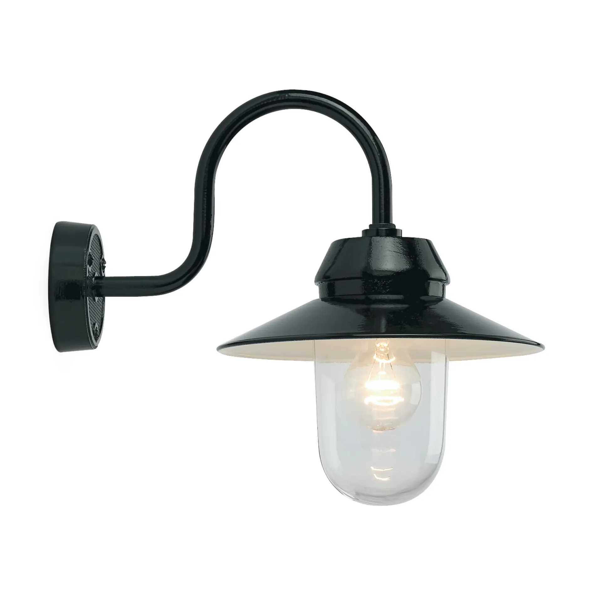 Außenleuchte mit Fassung und Wandarm aus schwarz oder weiß einbrennlackiertem Aluminiumguss. Schirm außen schwarz, innen weiß pulverbeschichtet, oder komplett weiß pulverbeschichtet. Inklusive Befestigungsplatten aus Aluminium mit Gummidichtungen zur Abdichtung der Wandrosette (Ø 11 cm). Hergestellt in Deutschland. Lieferung ohne Leuchtmittel und Montagematerial.