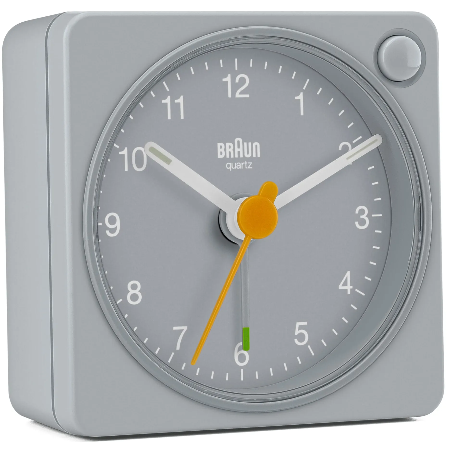 Klassischer analoger Reisewecker von BRAUN, der mit seiner leicht ablesbaren Ziffernblattgrafik sowie dem ikonischen gelben Sekundenzeiger mustergültig für die Designgeschichte von BRAUN steht. Aufgrund seiner kompakten Größe und seiner leichten Bauweise ist er als der perfekte Reisebegleiter zu nutzen. Das ikonische Design dieses klassischen Produkts von BRAUN führt zurück auf den Wecker AB1, der Ende der 80er-Jahre von Dietrich Lubs entworfen wurde. Der Wecker verfügt über ein weiterentwickeltes leiseres Uhrwerk, eine Beleuchtung des Ziffernblatts auf Knopfdruck und nachtleuchtende Stunden- und Minutenzeiger. Mit batteriebetriebenem Quarzuhrwerk für eine AA-Batterie, die nicht im Lieferumfang enthalten ist.