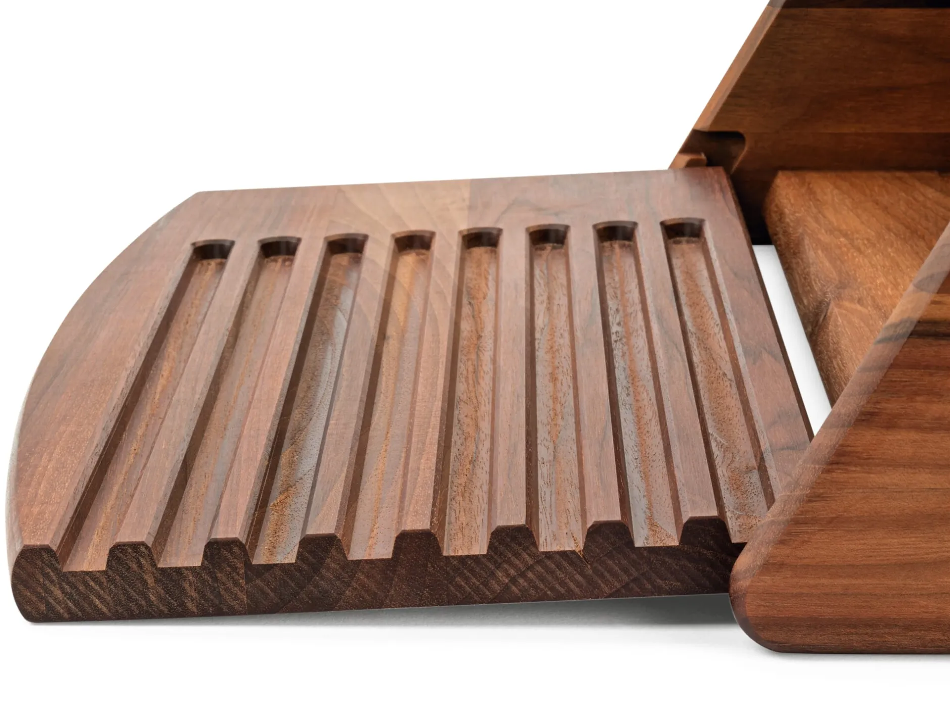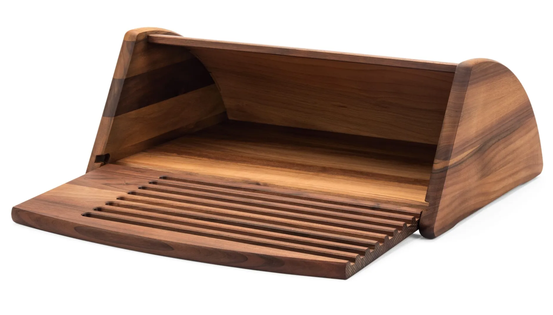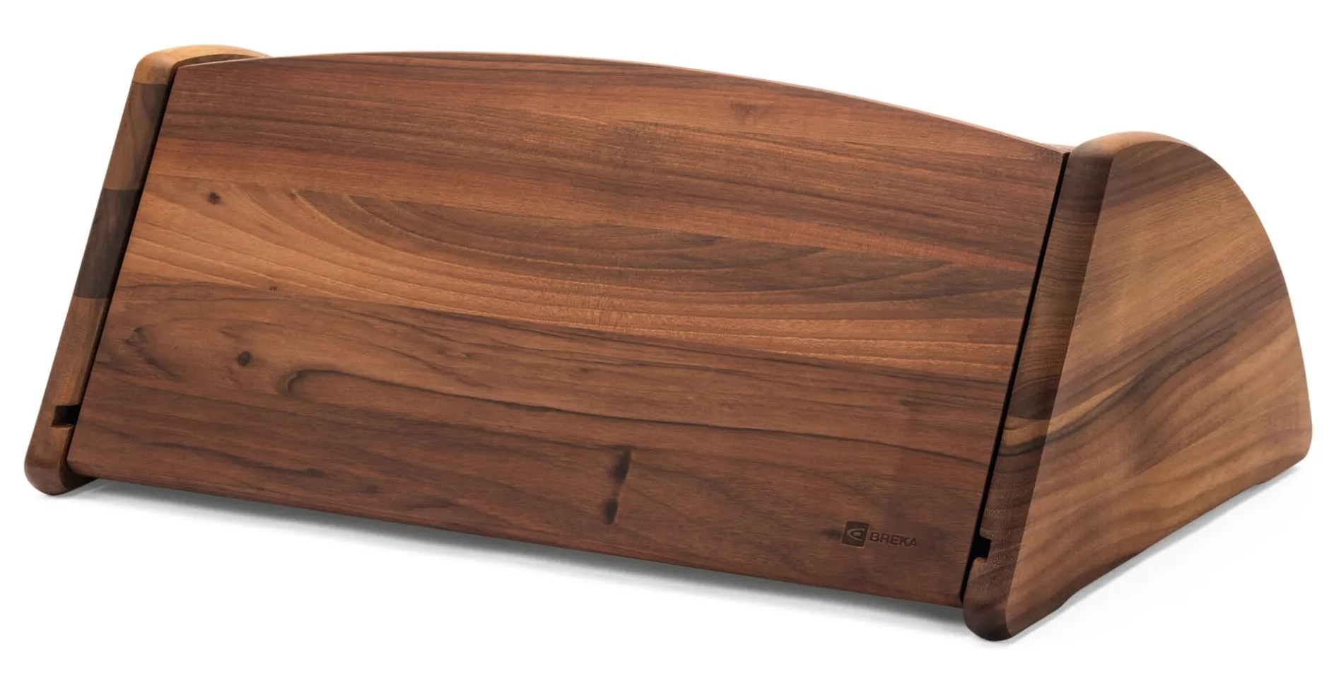 Die vordere Klappe fungiert zugleich als Schneidbrett und kann ganz abgenommen werden. Walnussholz, außen geölt, innen naturbelassen. Rückseite aus Buchensperrholz, mit Walnussholz furniert. Länge 44 cm, Breite 30 cm, Höhe 16,5 cm. Gewicht 3 kg.