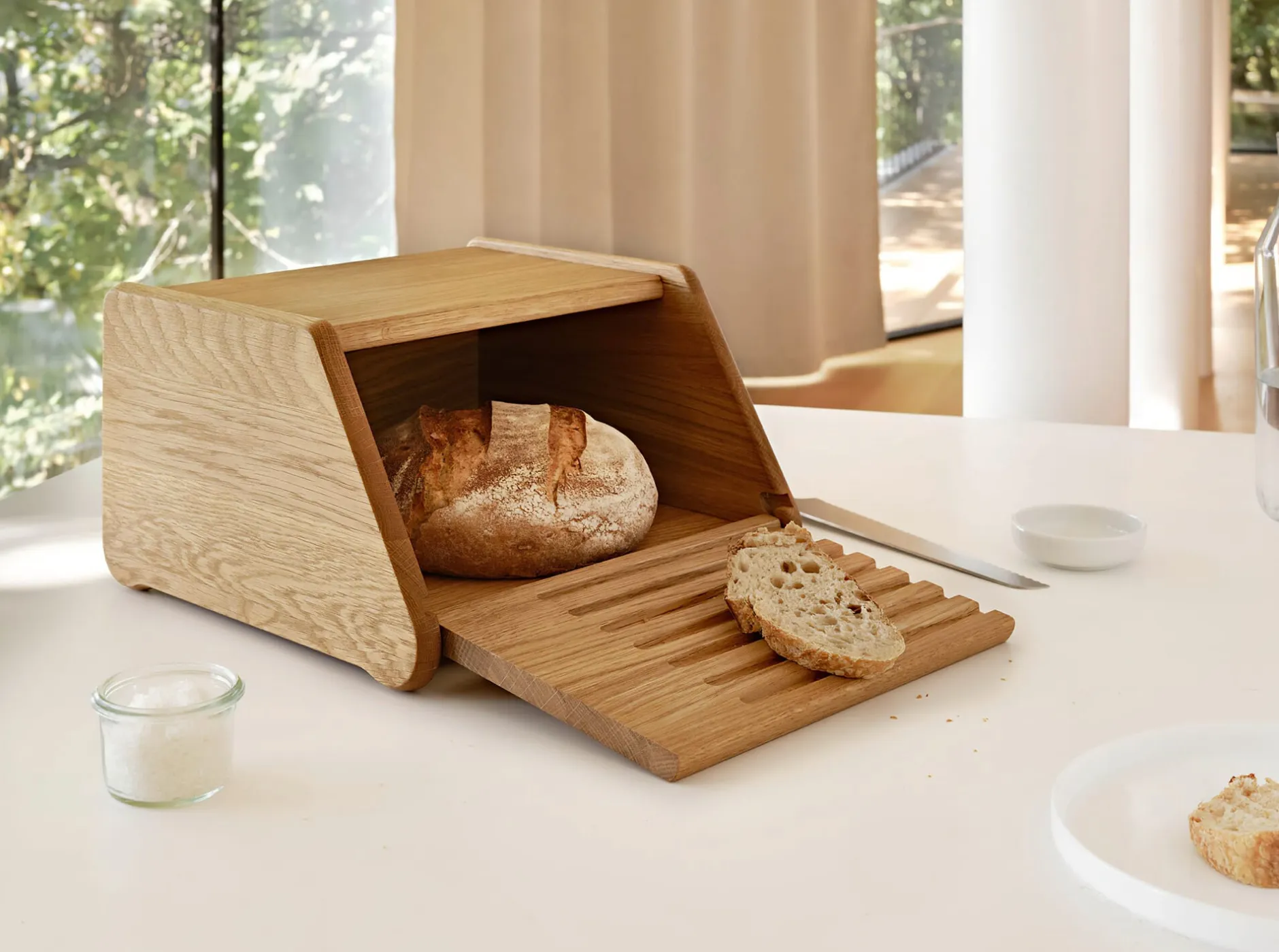 Eine ansprechende Aufbewahrungslösung für alle, die glauben, auf der Arbeitsplatte wäre dafür kein Platz: kompakt in den Abmessungen, schreinerisch perfekt gearbeitet. Ein kleiner Brotvorrat passt hinein und hält sich einige Tage lang frisch. Dieser Brotkasten von Breka in Slowenien besteht aus geöltem Eichenholz, so wird die naturgegebene Maserung des Holzes auf das Schönste betont. Was uns an diesem guten Ding außerdem gefällt? Der Frontdeckel kann mit einem Griff ganz vom Korpus gelöst und als Schneidebrett verwendet werden. Praktisch: Die auf der Innenseite des Deckels eingefrästen Rillen fangen (fast) alle Krümel auf. Butterdose, Salzstreuer und ein Schälchen mit Stullengewürz lassen sich auf der Oberseite des Brotkastens abstellen.