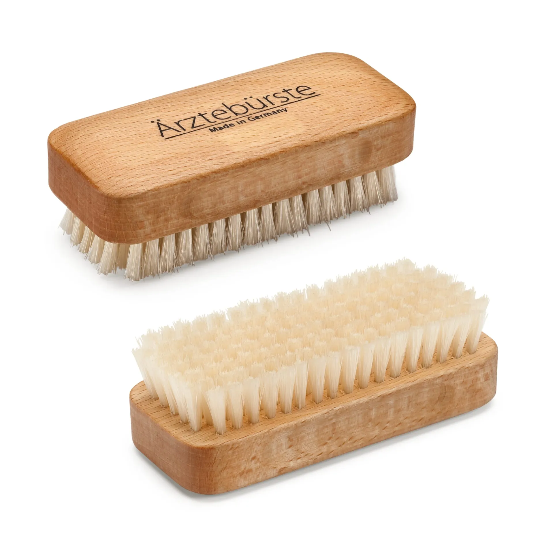 Früher reinigten sich Ärzte mit dieser Bürste die Hände, bevor sie sich dem nächsten Patienten widmeten – bis in Arztpraxen Bürsten mit sterilisierbaren Kunststoffborsten üblich wurden. Unsere Ärztebürste kommt ganz klassisch daher, mit einem Holzkorpus und einem siebenreihigen Besatz aus gekochten Schweineborsten. Diese sind exakt so lang und weich, dass die Bürste auch bei häufigem Gebrauch angenehm zu benutzen ist, und gleichzeitig hart genug, um die Hände gründlich zu reinigen.