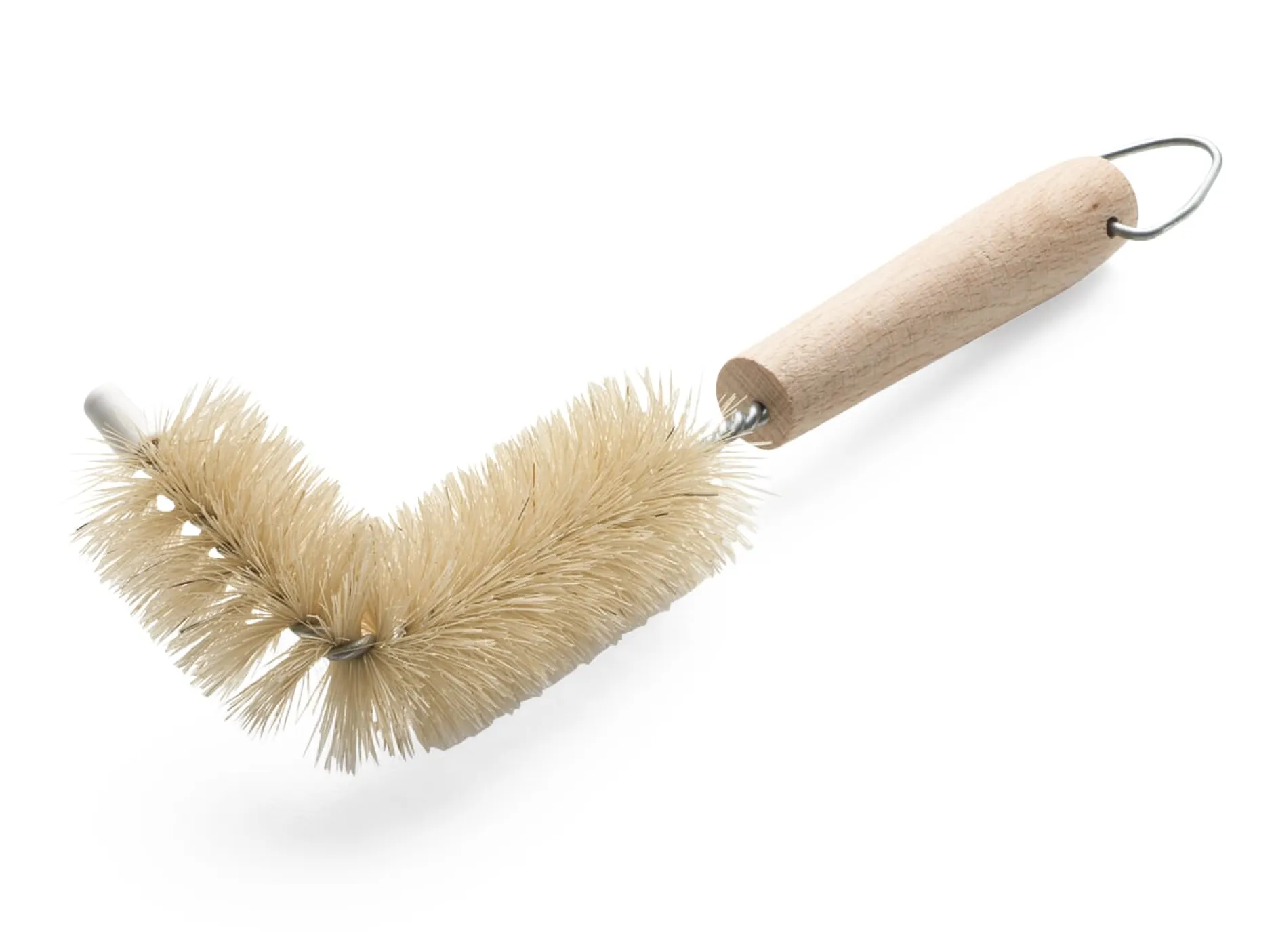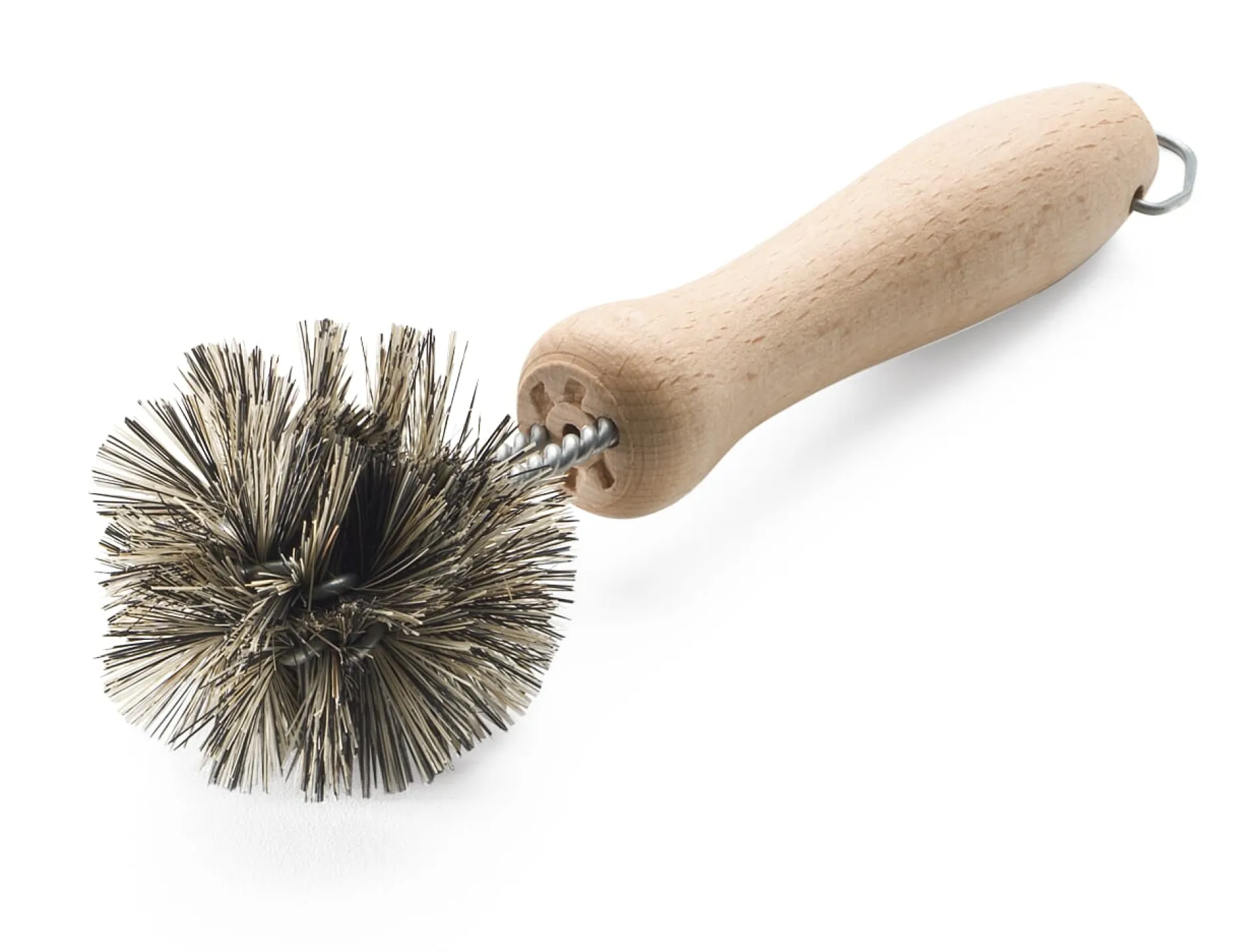 Vier kleine, in Küche und Bad vielfältig einsetzbare Spezialbürsten. Von links nach rechts: Eine Kugelbürste mit Rundum-Bestückung für sämtliche Ecken und Winkel gefliester Flächen, Armaturen etc. Längliche und runde Öffnungen können mit ihr problemlos erreicht werden. Besatz Fibre und Rosshaar. Bürstenkopf 5,5 cm Ø, Länge 17 cm. Eine Ausgussbürste zur gründlichen Reinigung von Ausgüssen und Zahnputzbechern. Besatz Schweineborste. Bürstenkopf 6 cm Ø, Länge 14,5 cm. Die Haarfangbürste mit hartem Polyamidbesatz behebt Abflussverstopfungen im oberen Bereich; sie kann tief in den Abfluss gesteckt werden und dort z.B. verklebte Haare entfernen. Bürstenkopf 0,8 cm Ø, Länge 27 cm. Die Überlaufbürste eignet sich zum Schrubben von Überläufen an Waschbecken. Besatz Schweineborste. Bürstenkopf 3 cm Ø, Länge 17 cm.