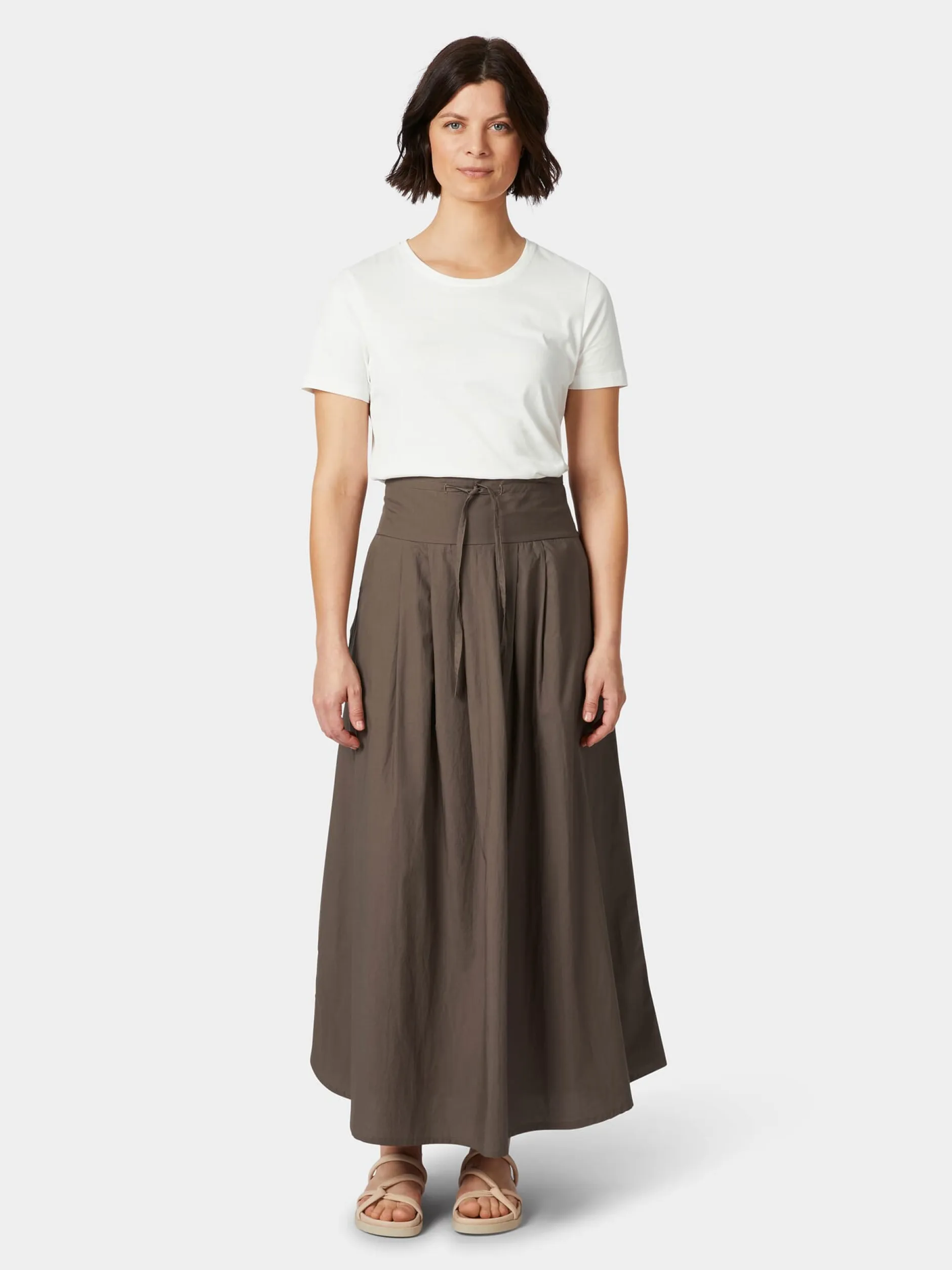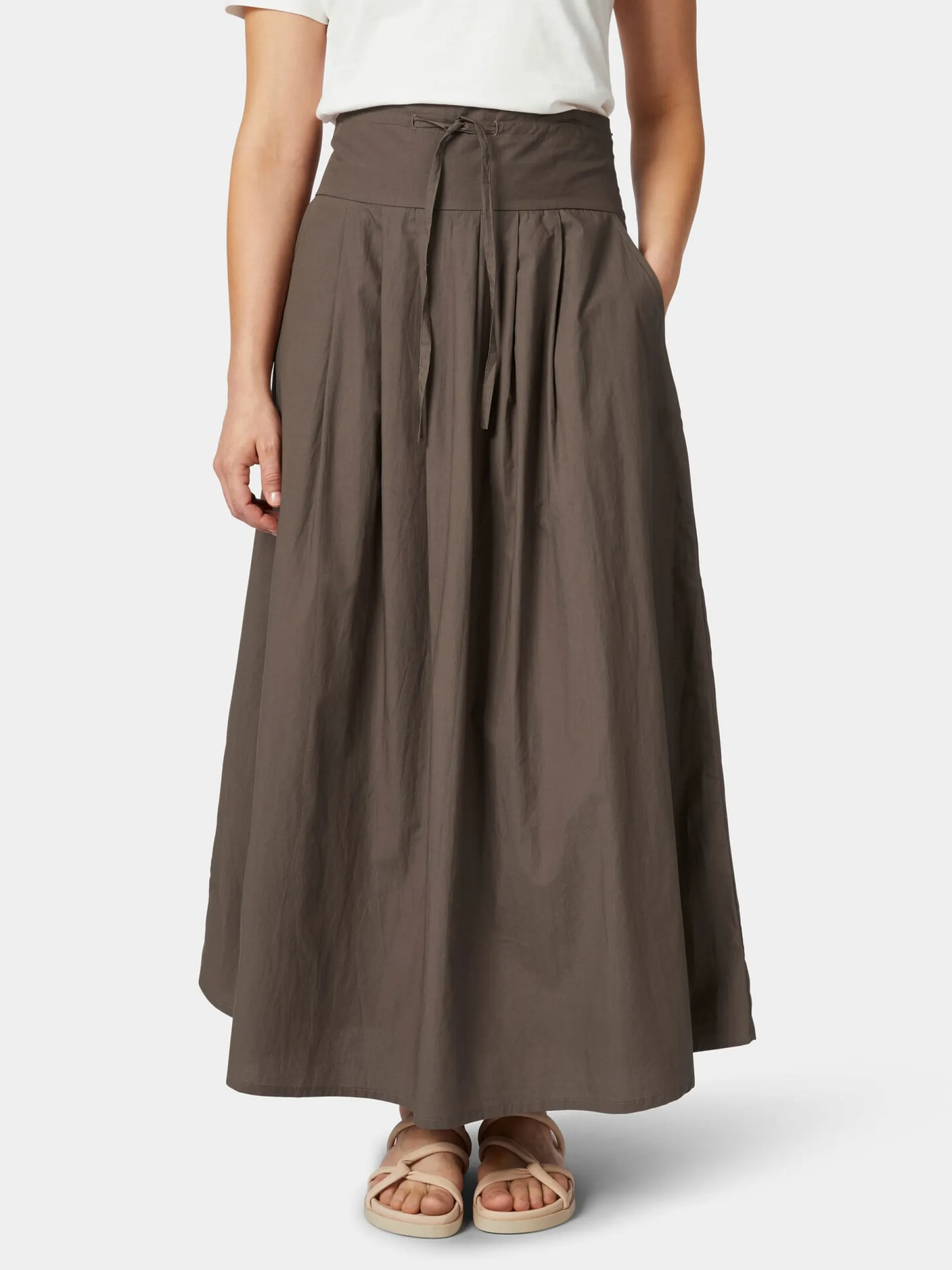 Mit seinem weich fließenden Fall und seiner komfortablen, weit ausgestellten Passform sorgt dieser etwa knöchellange Rock für einen eleganten, schwungvollen Auftritt, wozu auch die Bundfalten vorn und hinten beitragen. Der Formbund garantiert einen guten, vorteilhaften Sitz; vorn ist er mit einem Bindeband im Tunnelzug ausgestattet, wodurch die Taillenweite individuell angepasst werden kann. Care By Me fertigt den leichten und luftigen Stoff aus hautsympathischer, kontrolliert biologisch angebauter Baumwolle, was den Tragekomfort noch erhöht. Geschlossen wird der Midirock mit einem seitlichen, nahtverdeckten Reißverschluss. Zwei Seitentaschen bieten Platz für Kleinteile des täglichen Bedarfs.