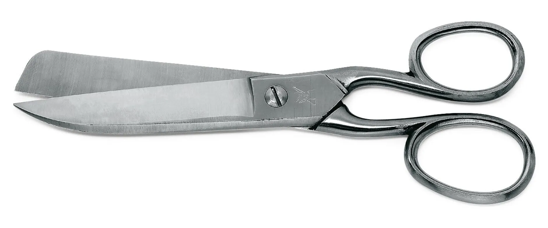 Eine Sack- oder Grobschere, schwer belastbar, mit kräftigen Blättern. Für Textilien, Leder, dicke Kartons. Kohlenstoffstahl unbehandelt, d.h. nicht rostfrei. Wird geölt geliefert und sollte gelegentlich auch mit Öl gepflegt werden. Mit der Zeit verliert die Schere ihren herstellungsbedingten Glanz und erhält eine schöne Patina.
