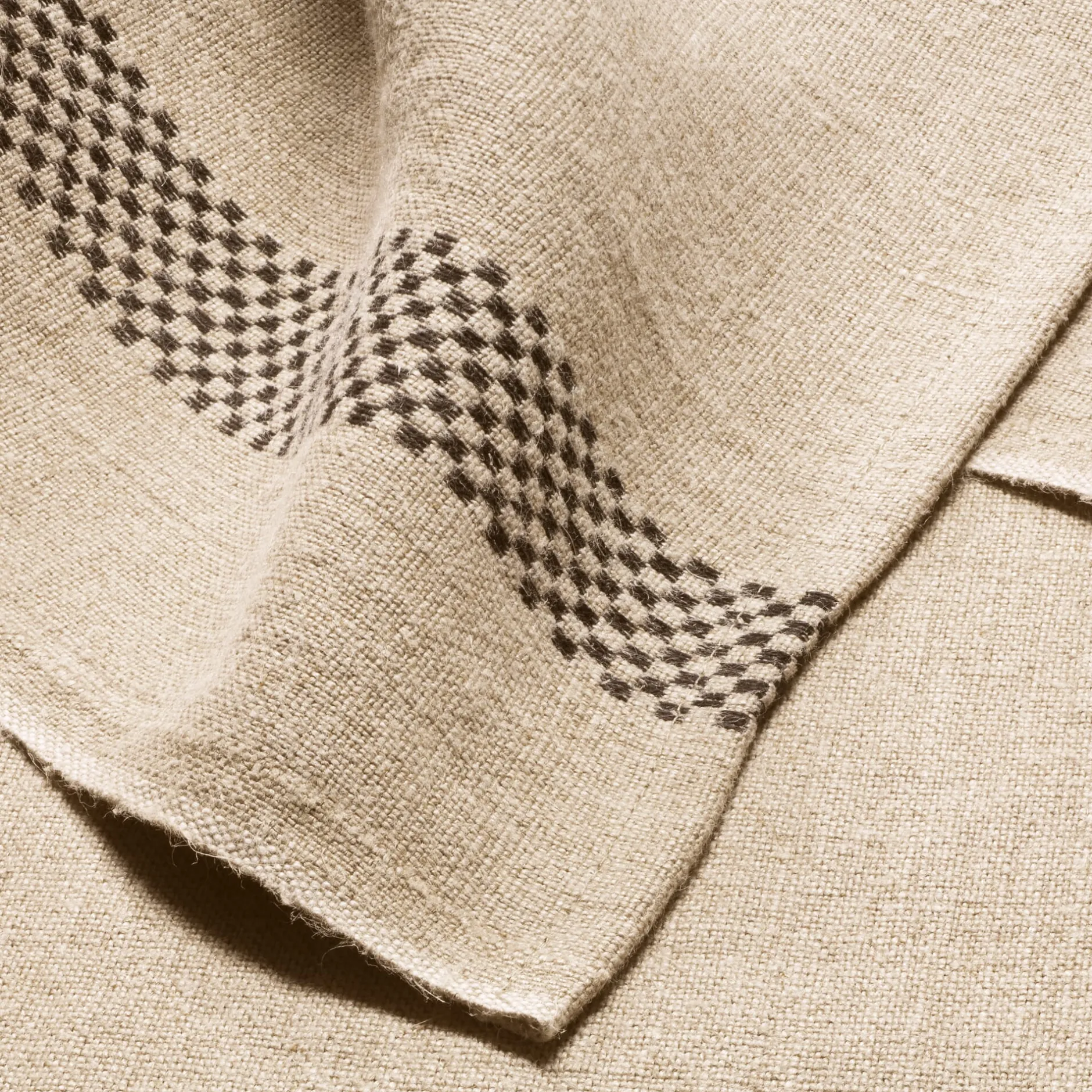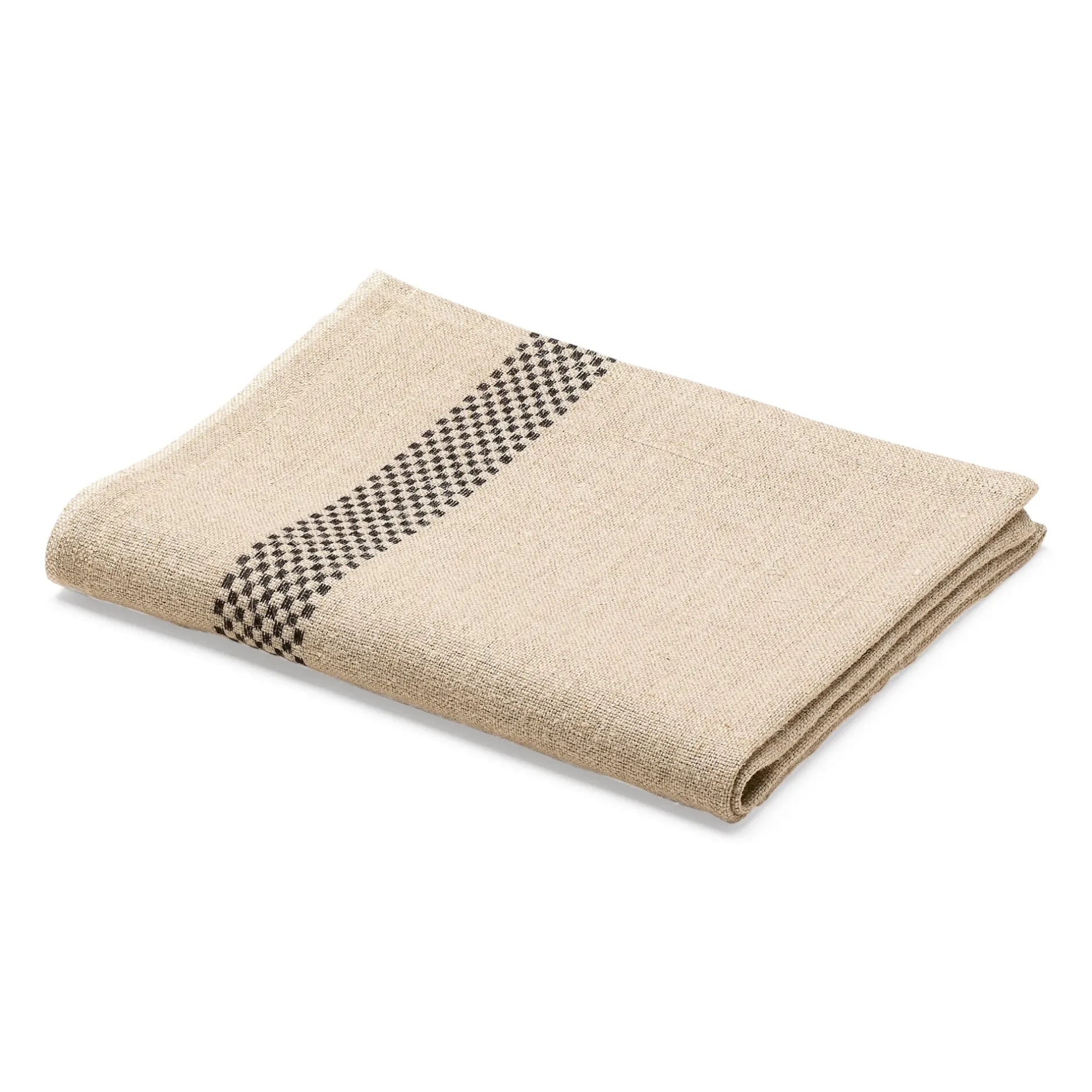 Die französische Weberei Charvet setzt für dieses robuste, leinwandbindig gewebte Küchenhandtuch kräftiges, ungefärbtes Leinengarn der Stärke Nm 6 ein. Dadurch ist es sehr strapazierbar und hat einen kernigen Griff. Dank seines üppigen Materialgewichts von 382 g/qm ist es äußerst saugstark und kann – doppelt oder dreifach gelegt – auch schon mal den Topflappen ersetzen. Die Randstreifen mit dem kleinteiligen Würfelmuster sind jacquardgewebt.