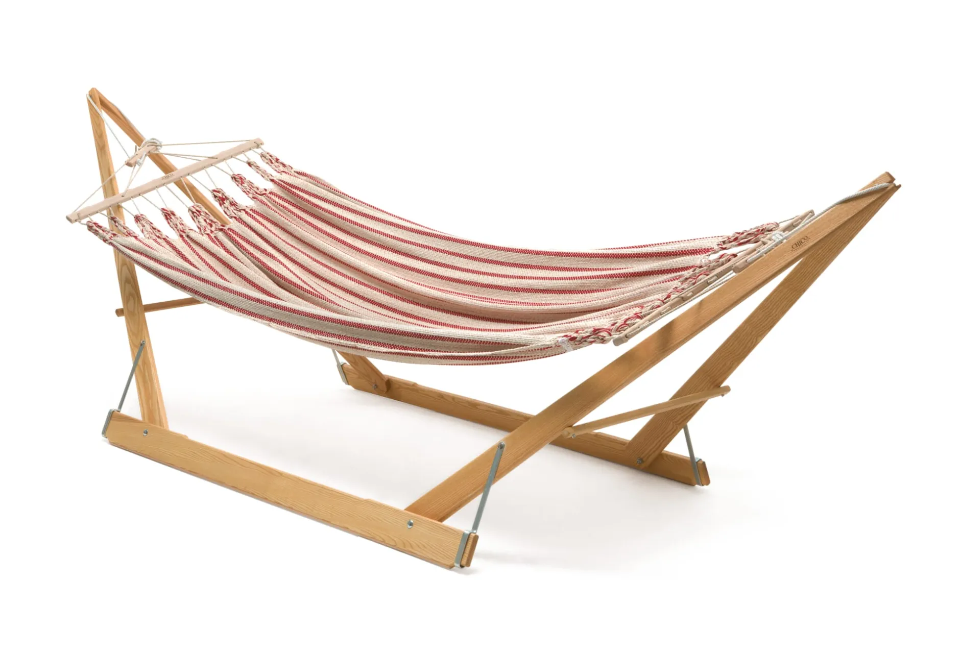 Für zwei Personen, zum Querliegen oder zum Sitzen und bequemen Schaukeln. 100% Baumwolle, Eschenholz, Tragseil Polyester. Spannweite mindestens 3,50 m, 210 × 190 cm. Gewicht 6,3 kg. Belastungsgewicht max. 250 kg. Hergestellt in Österreich. Lieferung ohne Ständer.