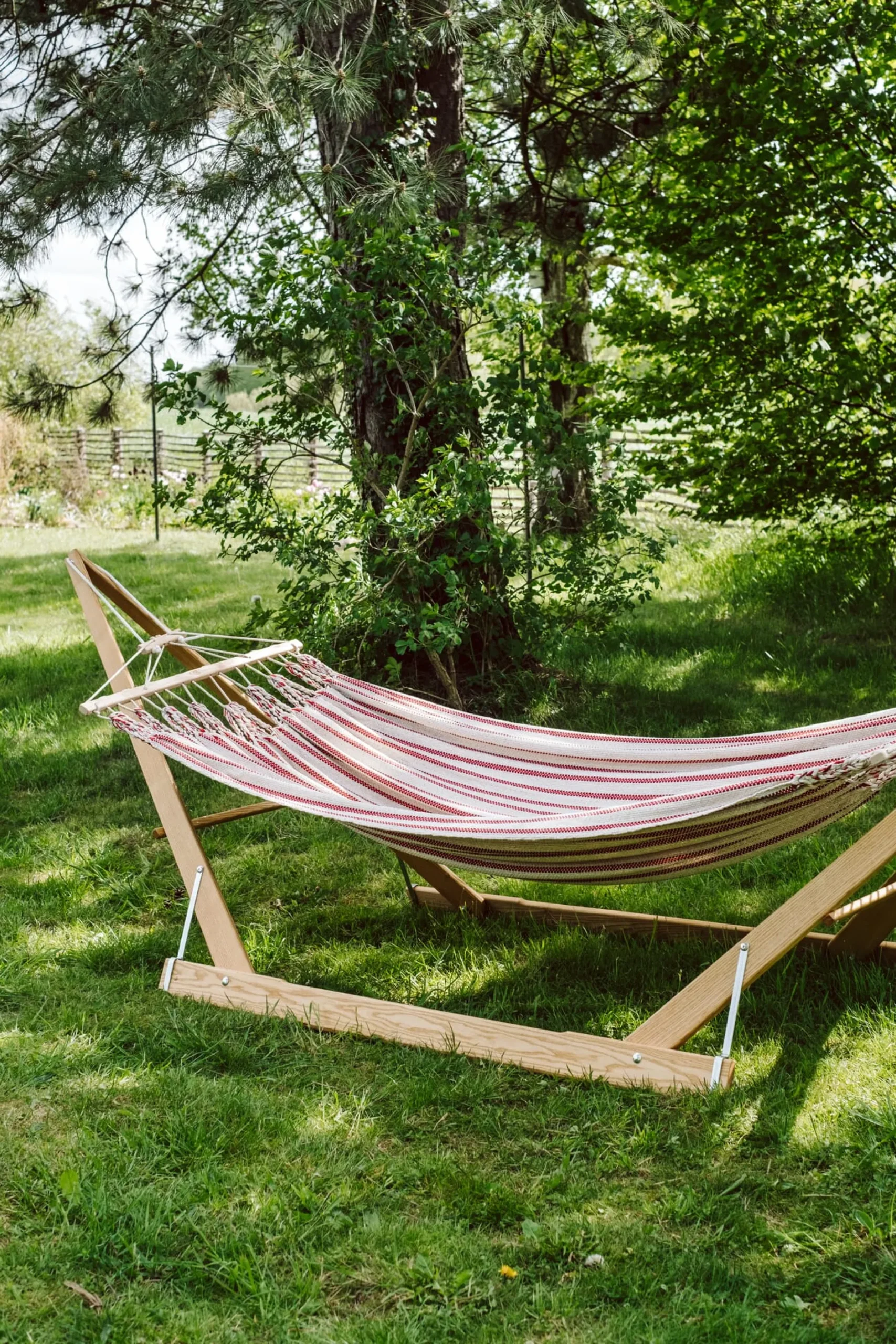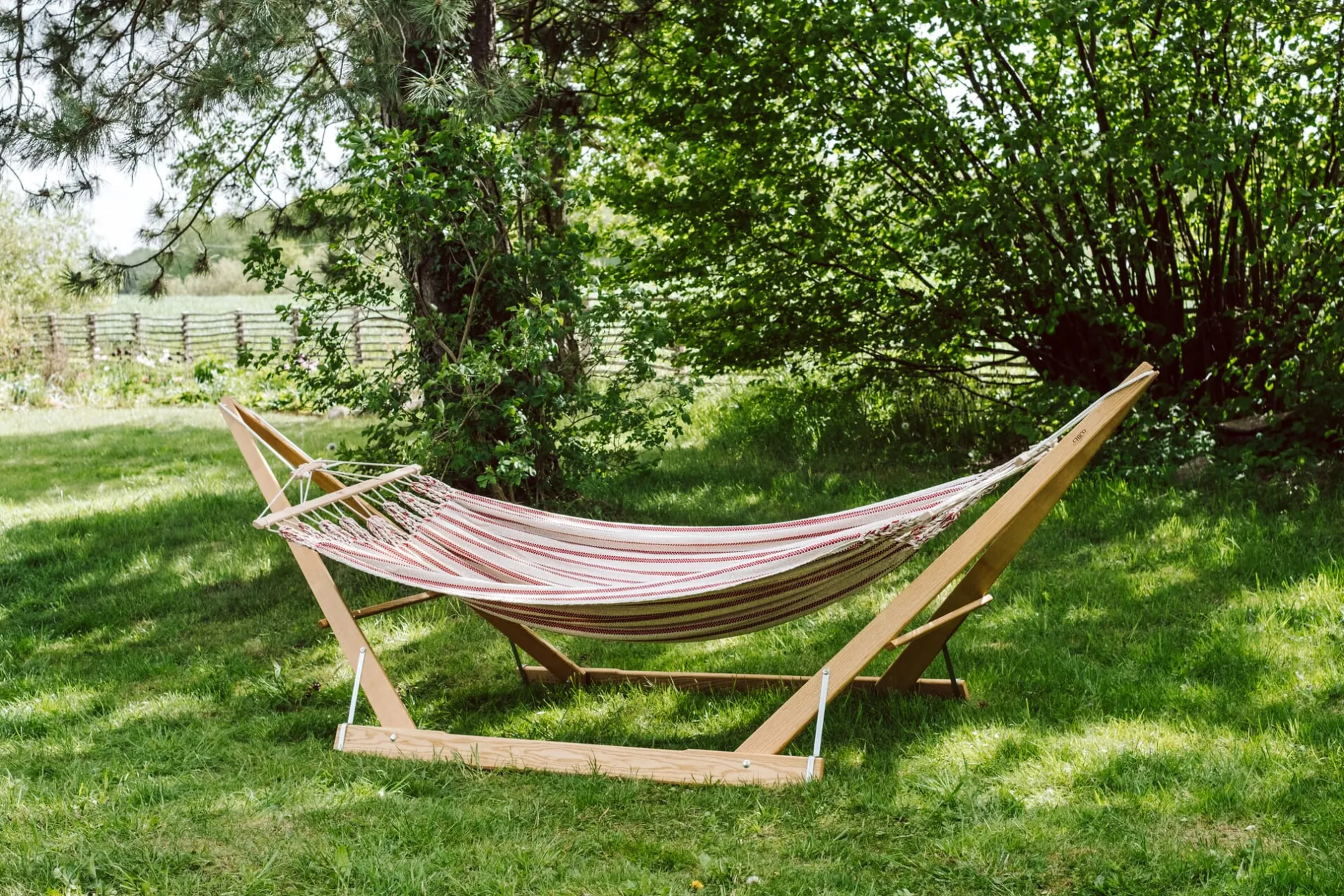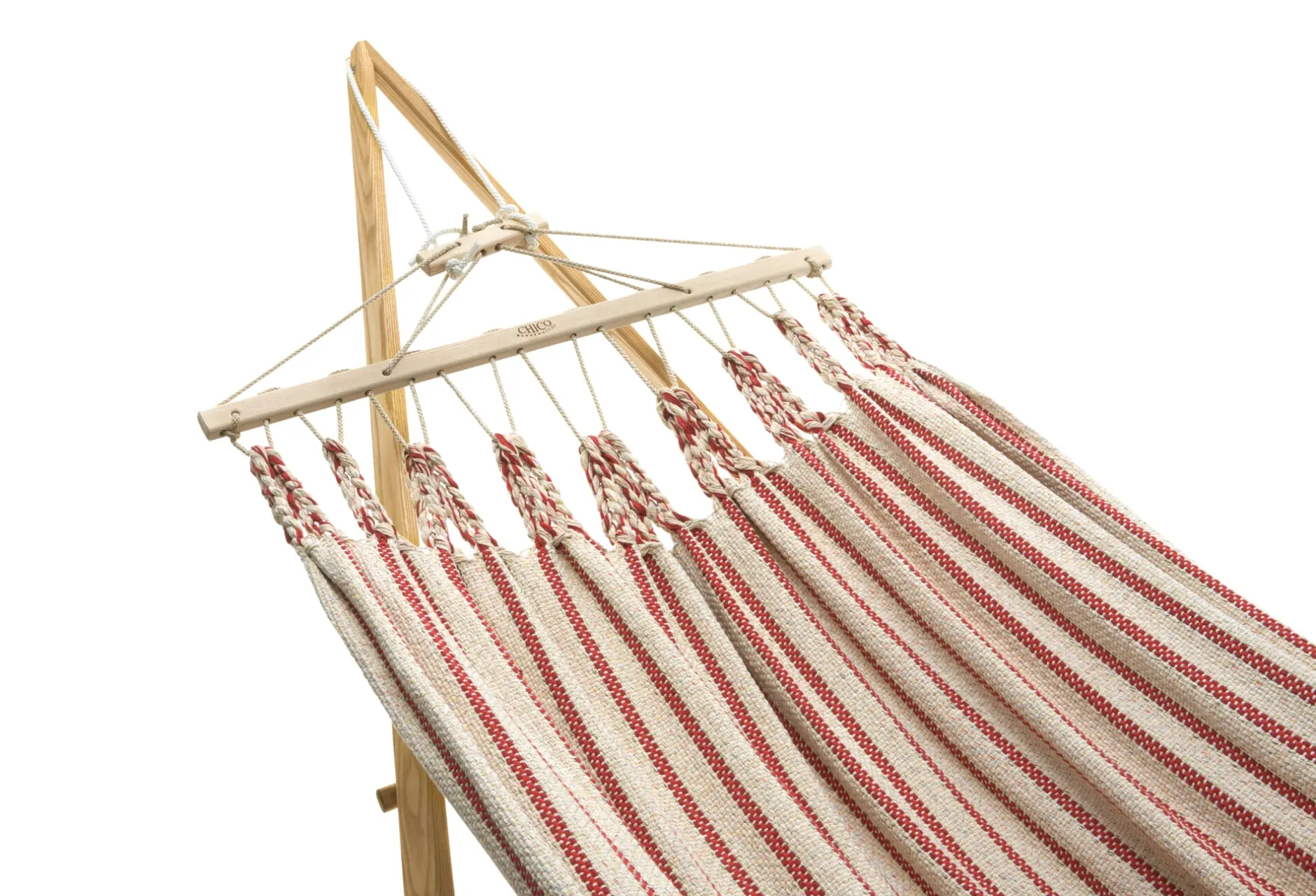 Die Hängematten werden in einer eigens entwickelten Endloswebtechnik gearbeitet, sie sind nicht nur von einer Materialopulenz, die man schon beim ersten Griff spürt – sie sind vor allem auch außerordentlich reißfest. Ein verstellbarer hölzerner Fixierstab verhindert das Zusammenrutschen der Matte, eine Spannvorrichtung ermöglicht Längenänderungen. Einzig beim Tragseil verwendet der Hersteller ein synthetisches Material, eine UV- und witterungsbeständige Polyestermischung, die die langfristige Belastbarkeit der Hängematte gewährleistet.