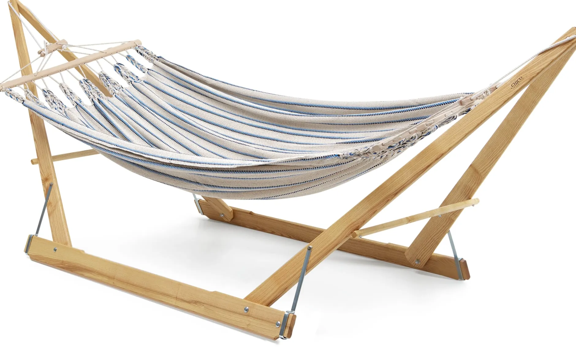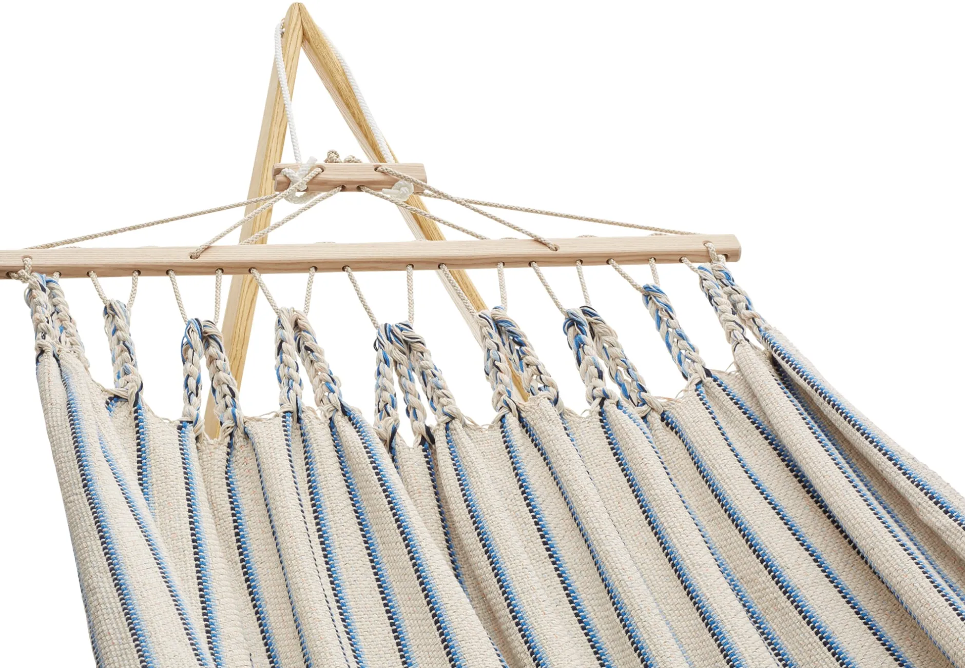 Für zwei Personen, zum Querliegen oder zum Sitzen und bequemen Schaukeln. 100% Baumwolle, Eschenholz, Tragseil Polyester. Spannweite mindestens 3,50 m, 210 × 190 cm. Gewicht 6,3 kg. Belastungsgewicht max. 250 kg. Hergestellt in Österreich. Lieferung ohne Ständer.