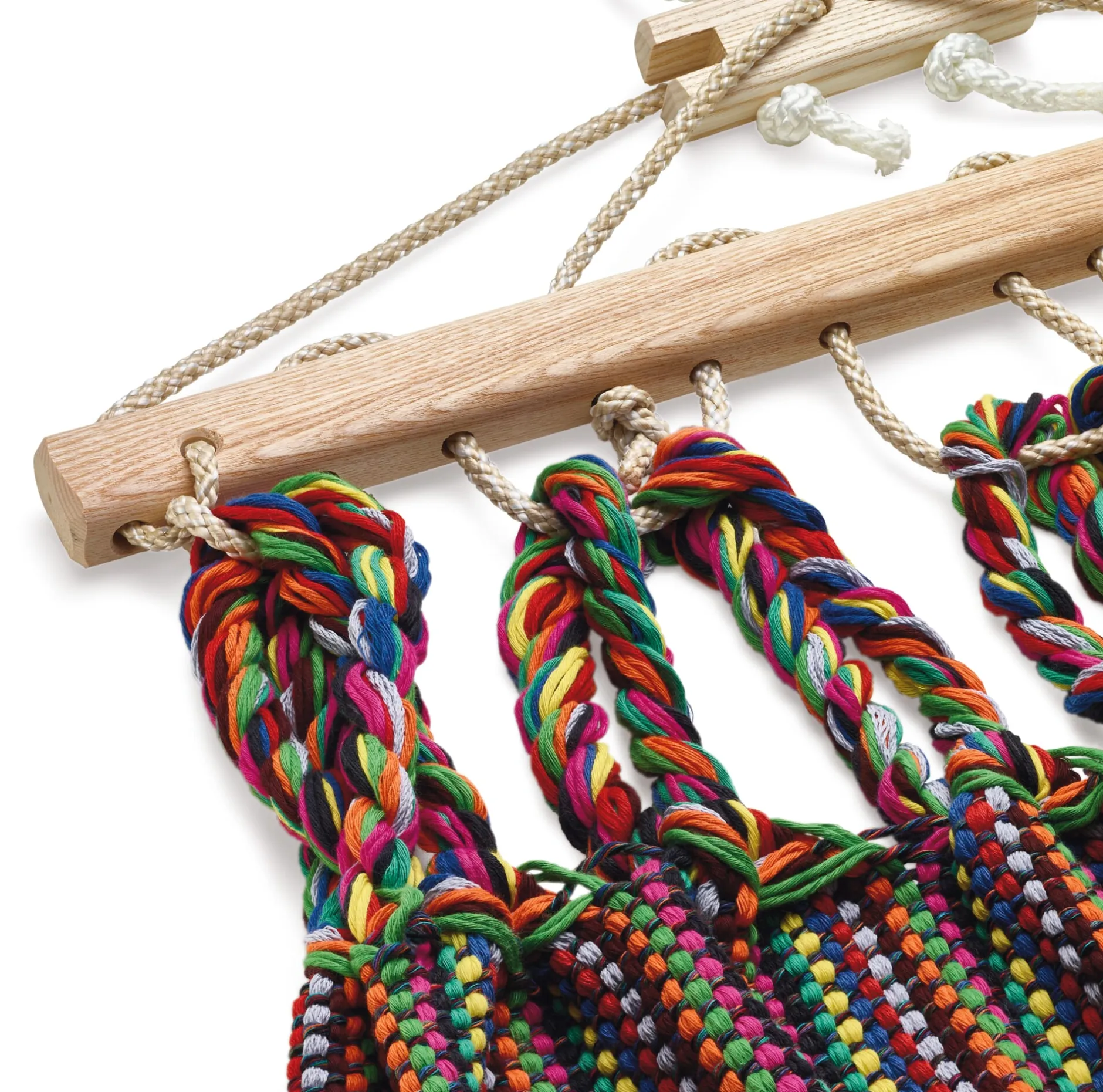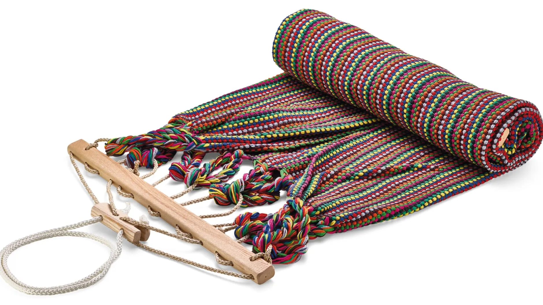 Die Hängematten werden in einer eigens entwickelten Endloswebtechnik gearbeitet, sie sind nicht nur von einer Materialopulenz, die man schon beim ersten Griff spürt – sie sind vor allem auch außerordentlich reißfest. Ein verstellbarer hölzerner Fixierstab verhindert das Zusammenrutschen der Matte, eine Spannvorrichtung ermöglicht Längenänderungen. Einzig beim Tragseil verwendet der Hersteller ein synthetisches Material, eine UV- und witterungsbeständige Polyestermischung, die die langfristige Belastbarkeit der Hängematte gewährleistet.