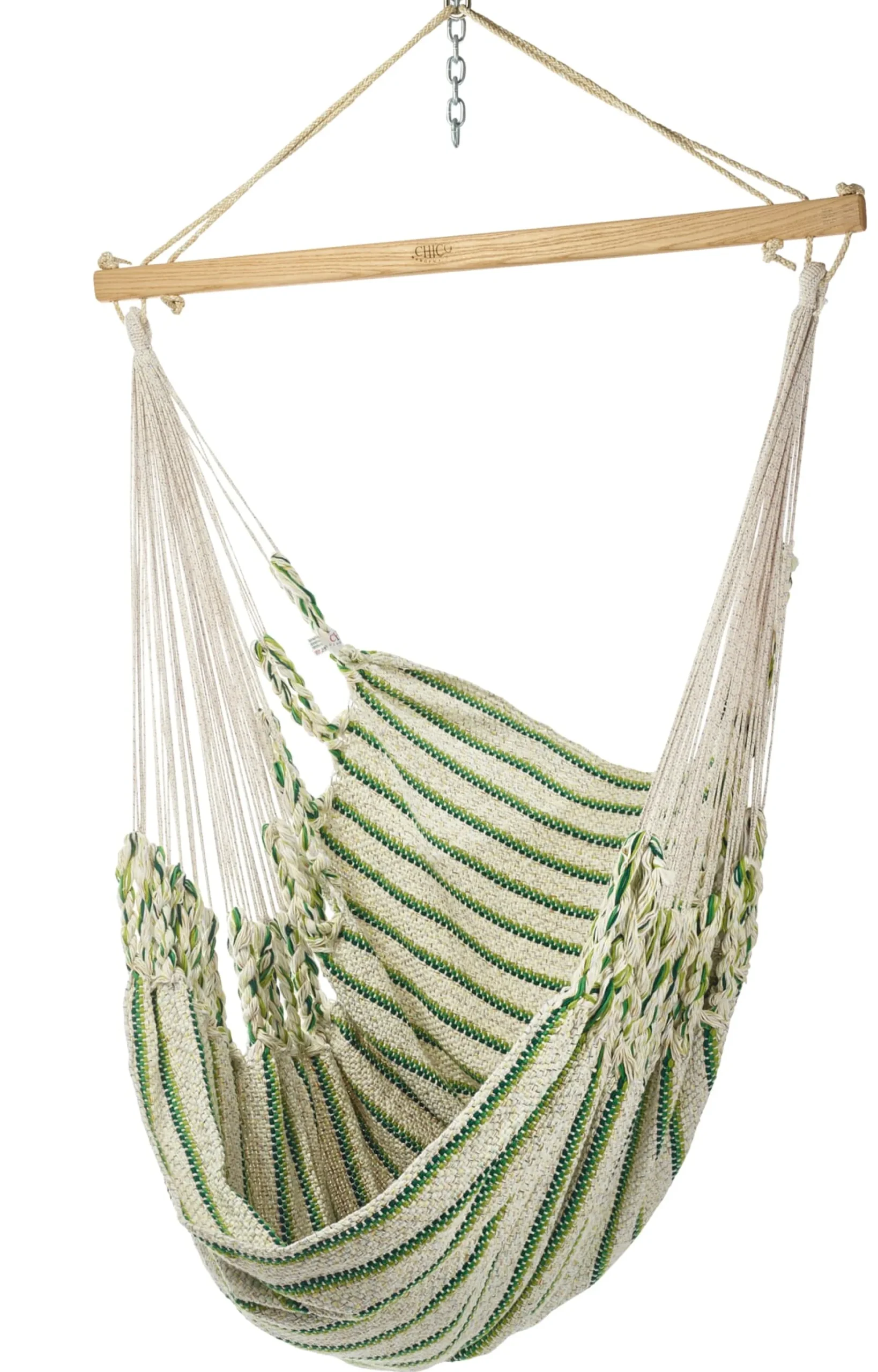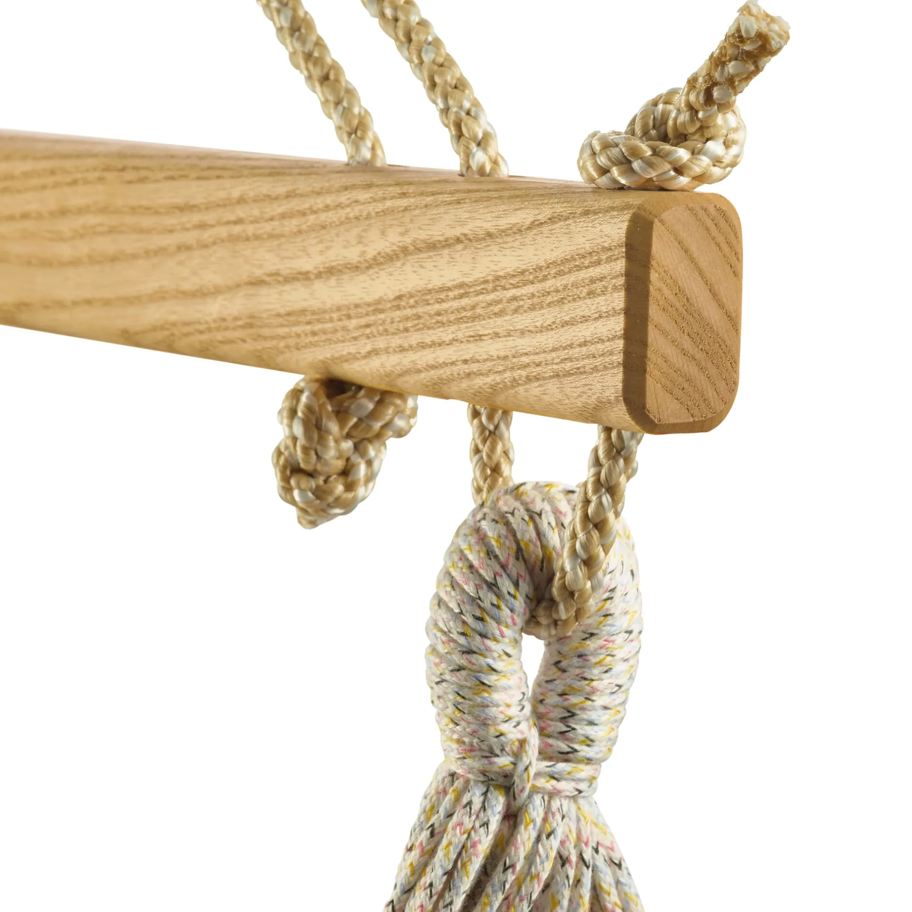 Der Stoff wird in einer speziellen Endloswebtechnik gearbeitet, bei der eine festgelegte Anzahl baumwollener Endlosfäden so miteinander verwoben wird, dass im Gewebe weder störende Knoten noch lose Randfäden auftreten und jeder einzelne Faden mit dem Trägerseil fest verbunden ist. Eine derart gewebte Stoffbahn ist überaus reißfest und sichert eine gleichmäßige Lastenverteilung; ihre Materialopulenz spürt man auf den ersten Griff. Der hölzerne Fixierstab verhindert ein Zusammenrutschen der Matte, der Drehwirbel am Karabinerhaken – die beide aus verzinktem Stahl gefertigt und damit unempfindlich sind – ermöglicht die Höhenanpassung des Hängesessels. Das Tragseil besteht aus gutem Grund aus synthetischem Material. Der österreichische Hersteller setzt hier eine UV- und witterungsbeständige Polyestermischung ein, die abriebsicher ist und eine langfristige Belastbarkeit gewährleistet.