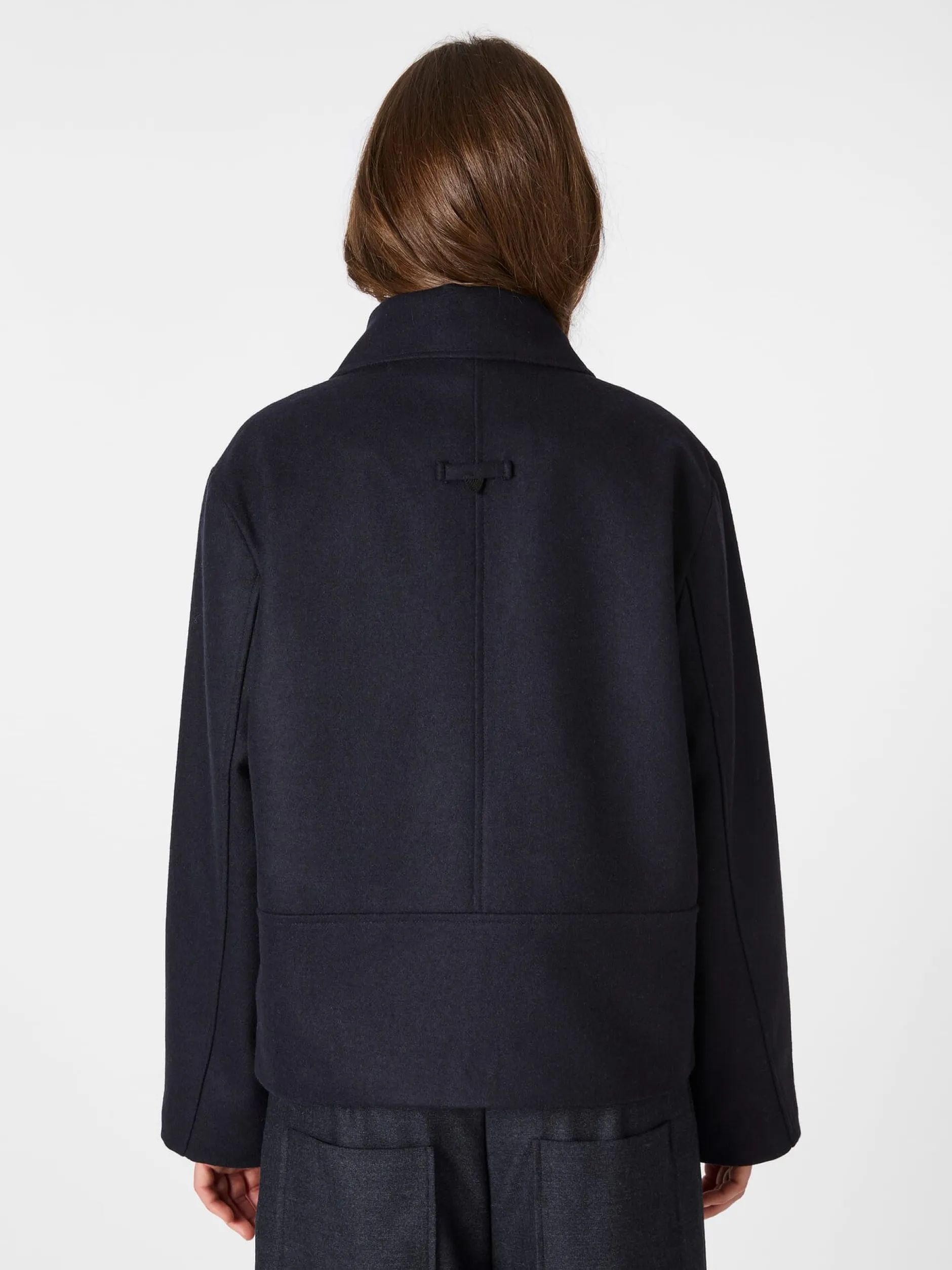 Dank ihrer geraden, legeren Passform und der verwendeten Materialien ist diese Hemdjacke überaus komfortabel und eine ideale Begleiterin für frische Herbst- und Frühlingstage oder kühle Sommerabende. Christiane Strobel fertigt den Oberstoff aus einem dichten, wärmenden Wolltuch, das Futter aus reiner, hautsympathischer Baumwolle. Gearbeitet ist die Jacke mit zwei großen, aufgesetzten Brusttaschen mit Patte und geradem Saum. Weitere schnitttechnische Details sind die Querteilungsnaht am hinteren Saum sowie eine Längsteilungsnaht im Rücken, die die Silhouette optisch verschlankt. Abgerundet wird das Design durch die in Japan handgefertigten Papierknöpfe und das handgestickte Dreieck am rückseitig angebrachten Riegel.