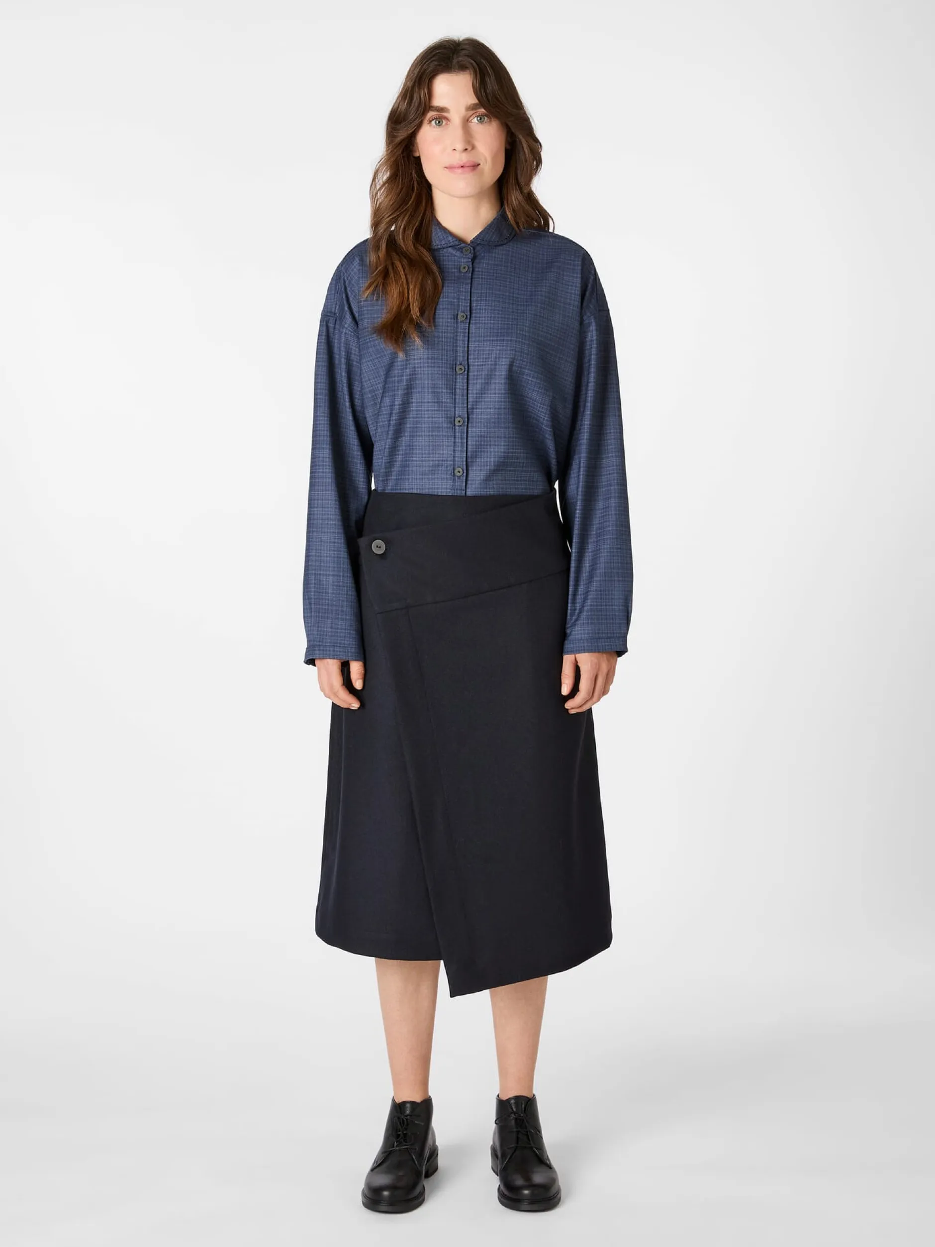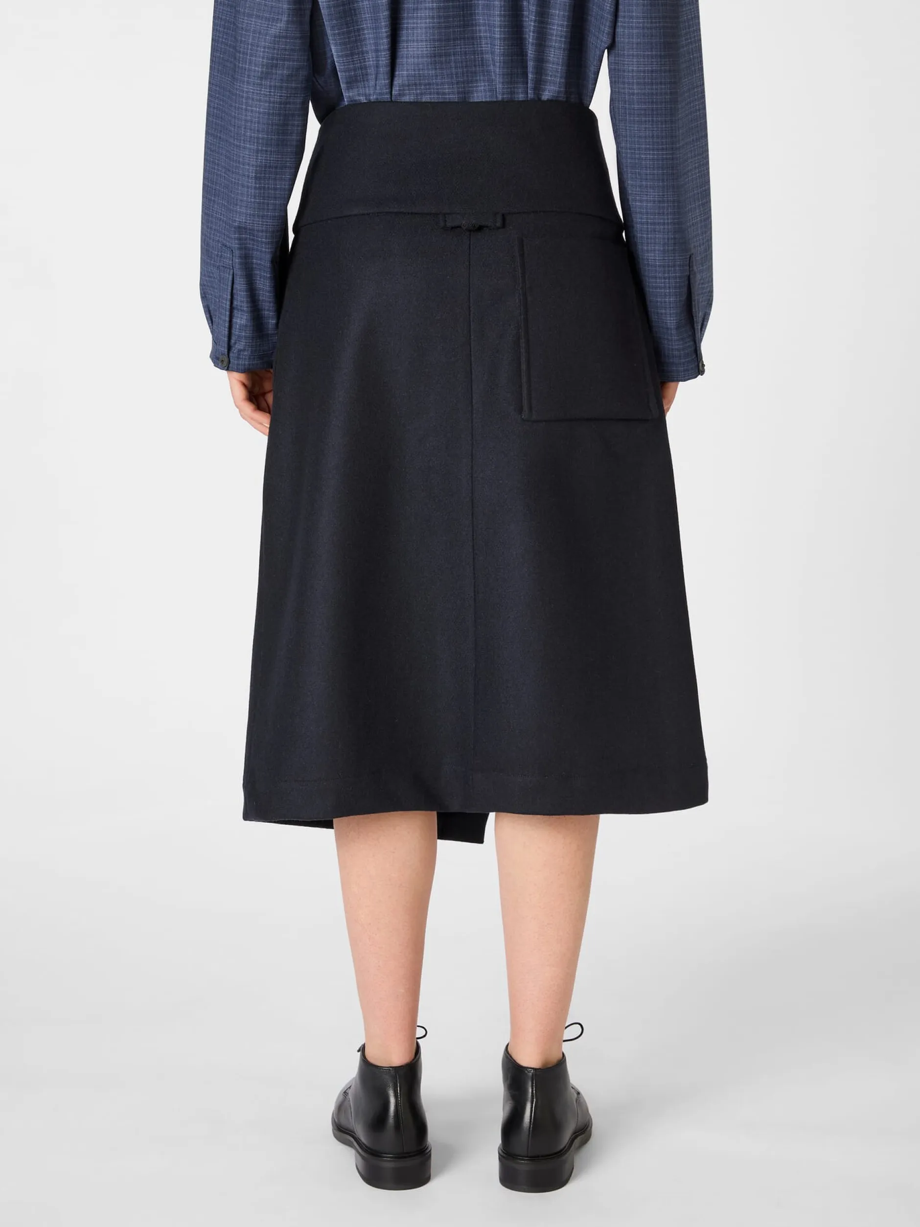 Perfekt für den Herbst oder kühle Frühlingstage: ungefütterter Wickelrock, gefertigt aus einem dichten, wärmenden Wolltuch. Er wird mit einem in Japan handgefertigten Papierknopf asymmetrisch geschlossen, was seine A-Linie noch unterstreicht und für eine raffinierte Optik sorgt. Ausgestattet ist der Rock mit zwei Seitennahttaschen. Die große, tief angesetzte Gesäßtasche und das handgestickte Dreieck am rückseitig angebrachten Riegel – Markenzeichen von Christiane Strobel – verleihen dem Rock das gewisse Etwas. Er lässt sich vielseitig kombinieren, ob zu eleganten, sportlichen oder lässigen Outfits.